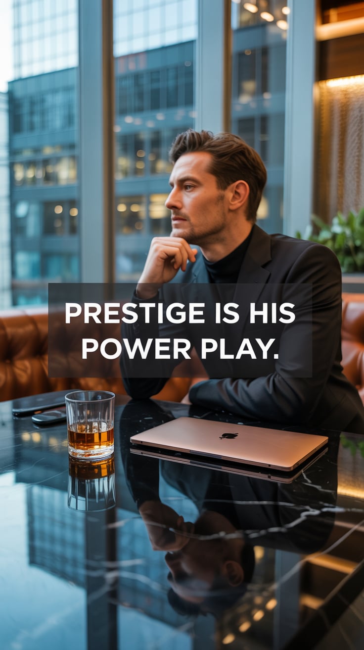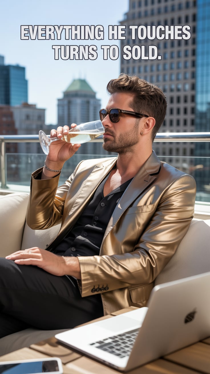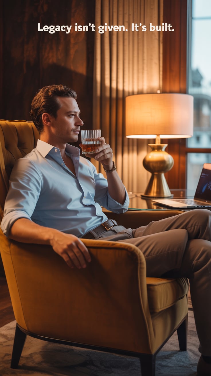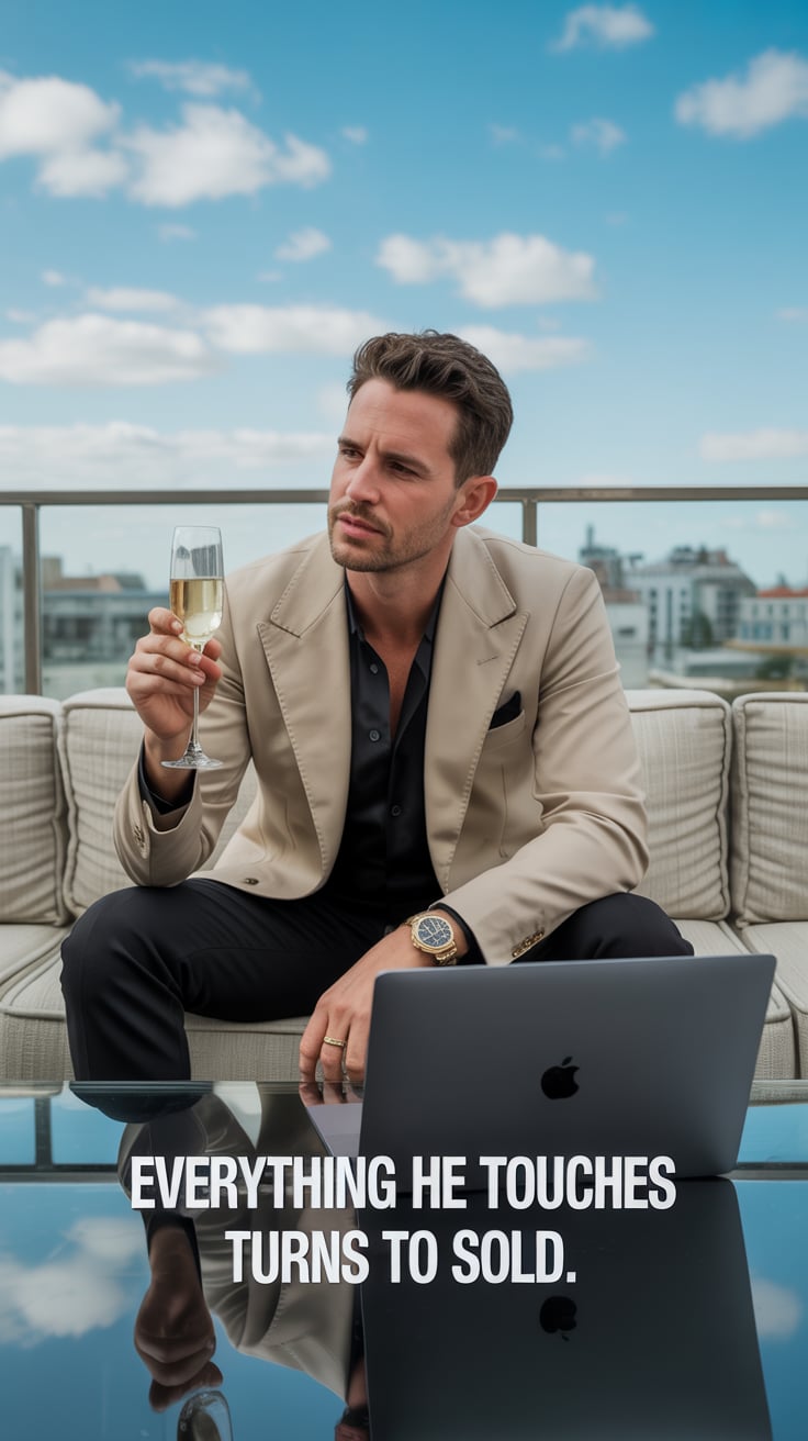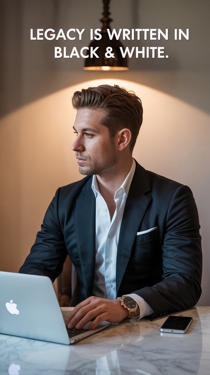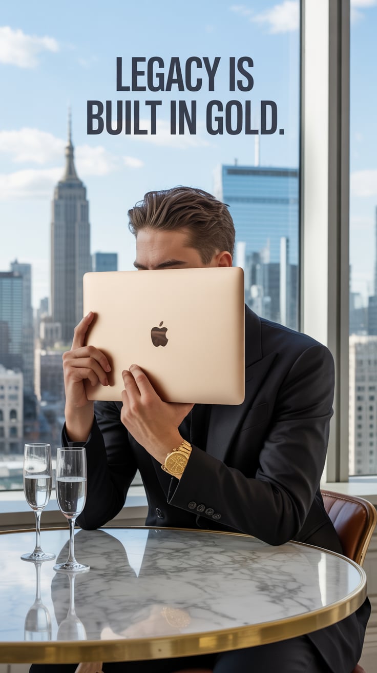 A luxury lifestyle photo of a (skin tone) male seated at a marble table with a laptop, a glass of wh...