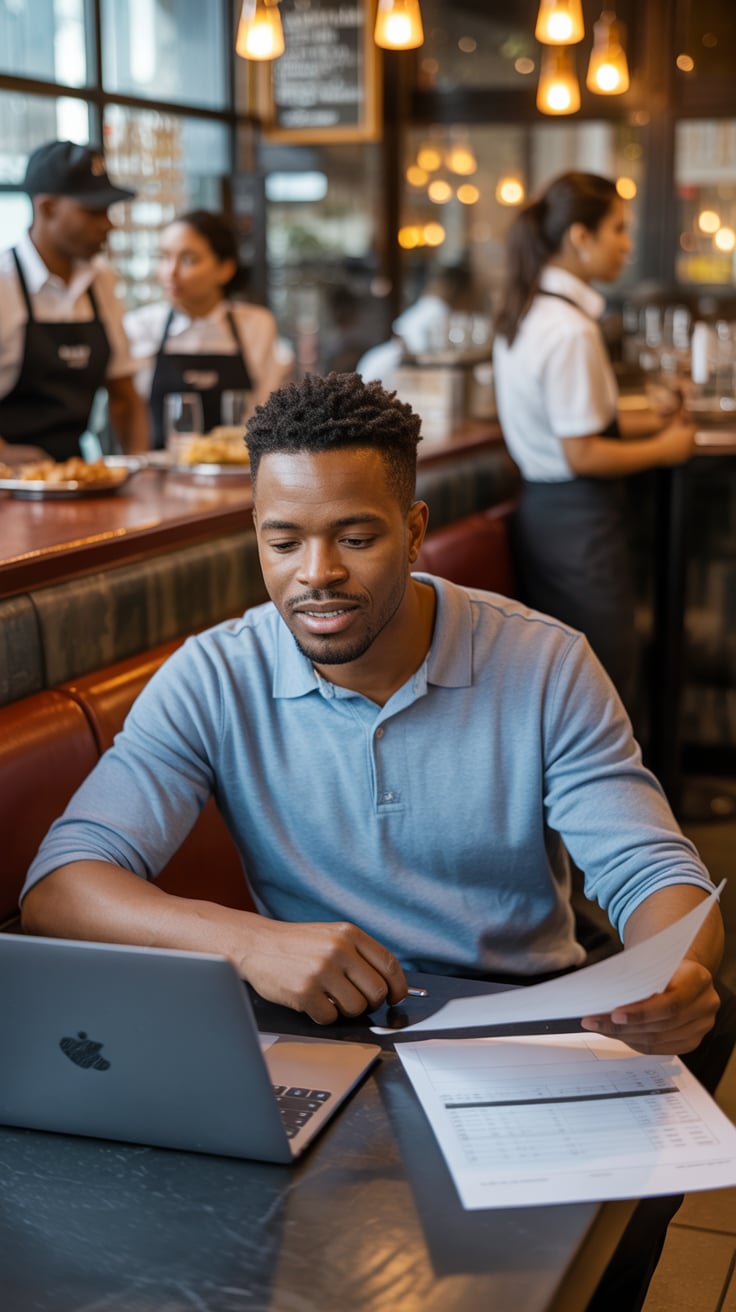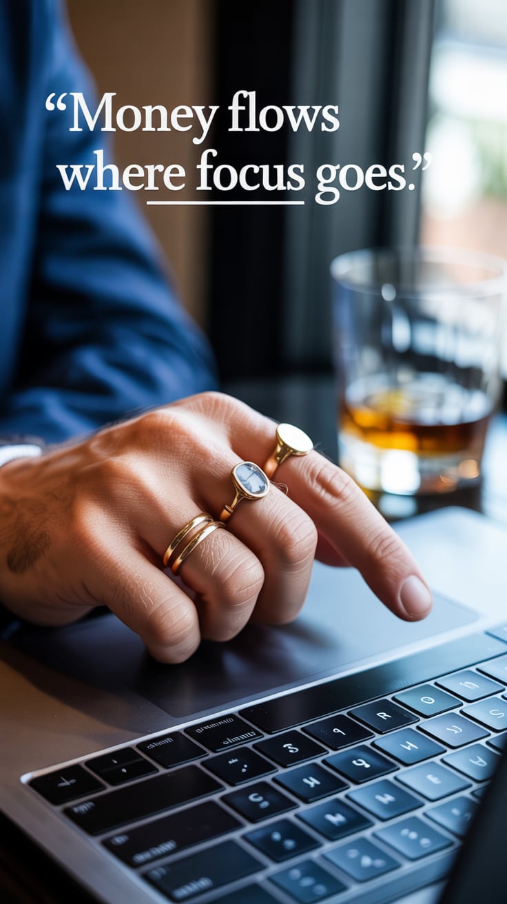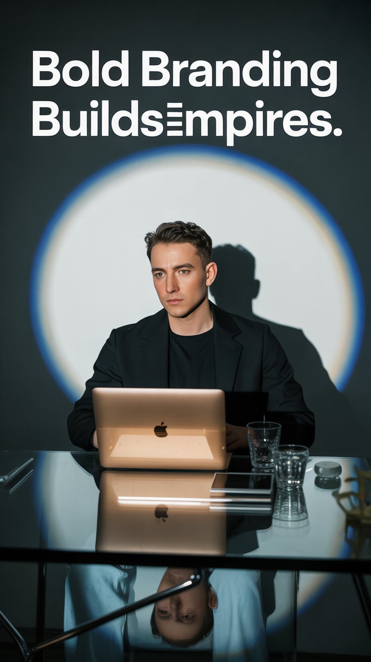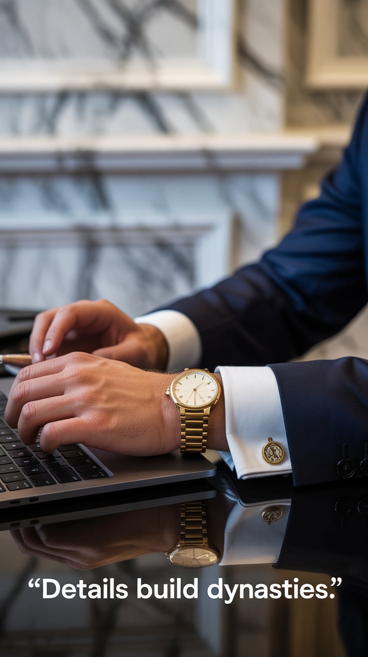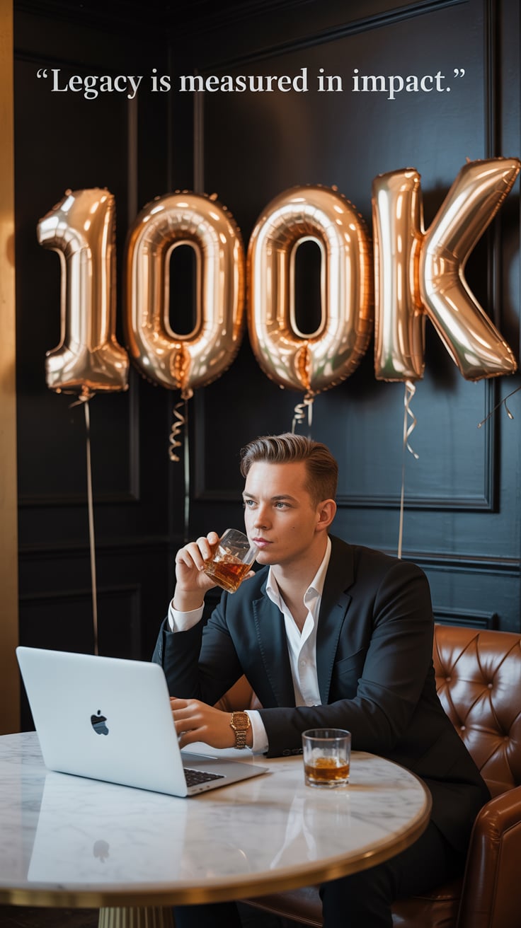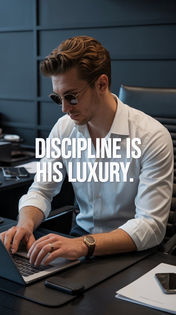 A luxury lifestyle photo of a (skin tone) male seated at a marble table with a laptop, a glass of wh...