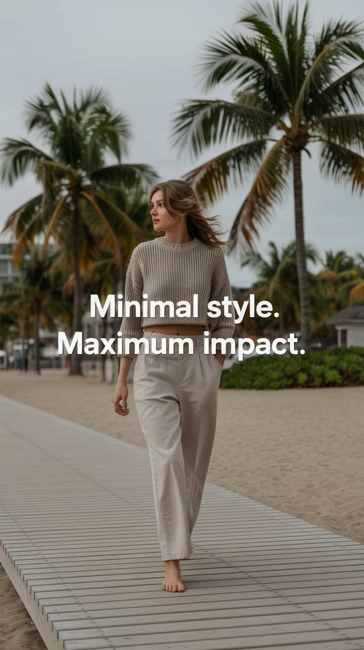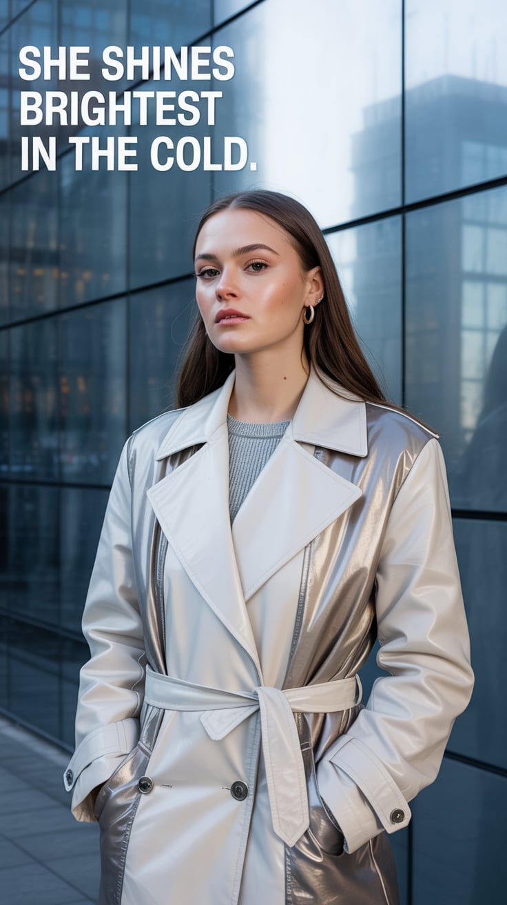 A high-fashion editorial of a (skin tone) female in metallic silver trousers and a cream cashmere sw...