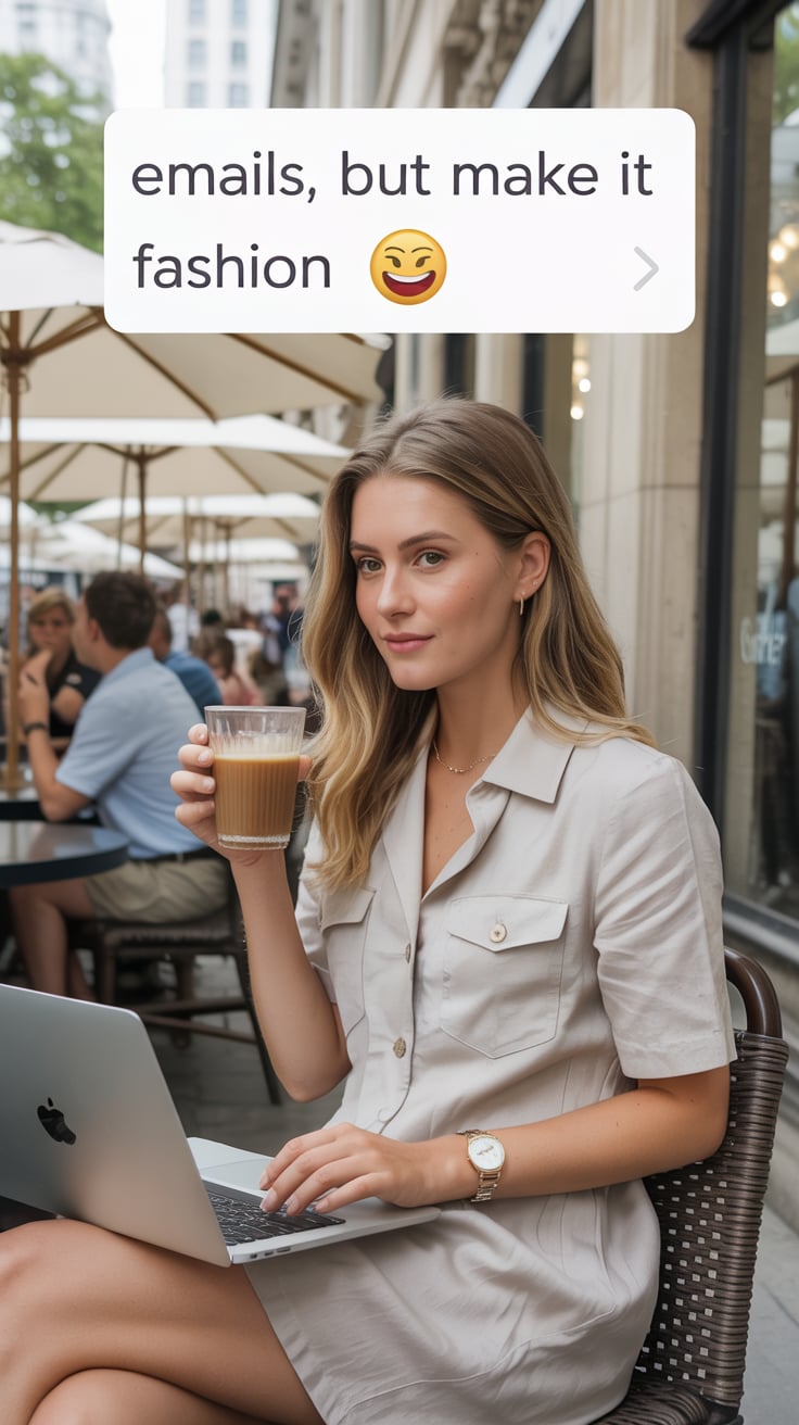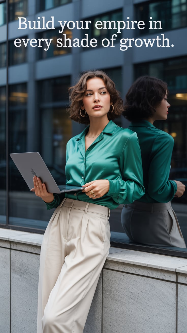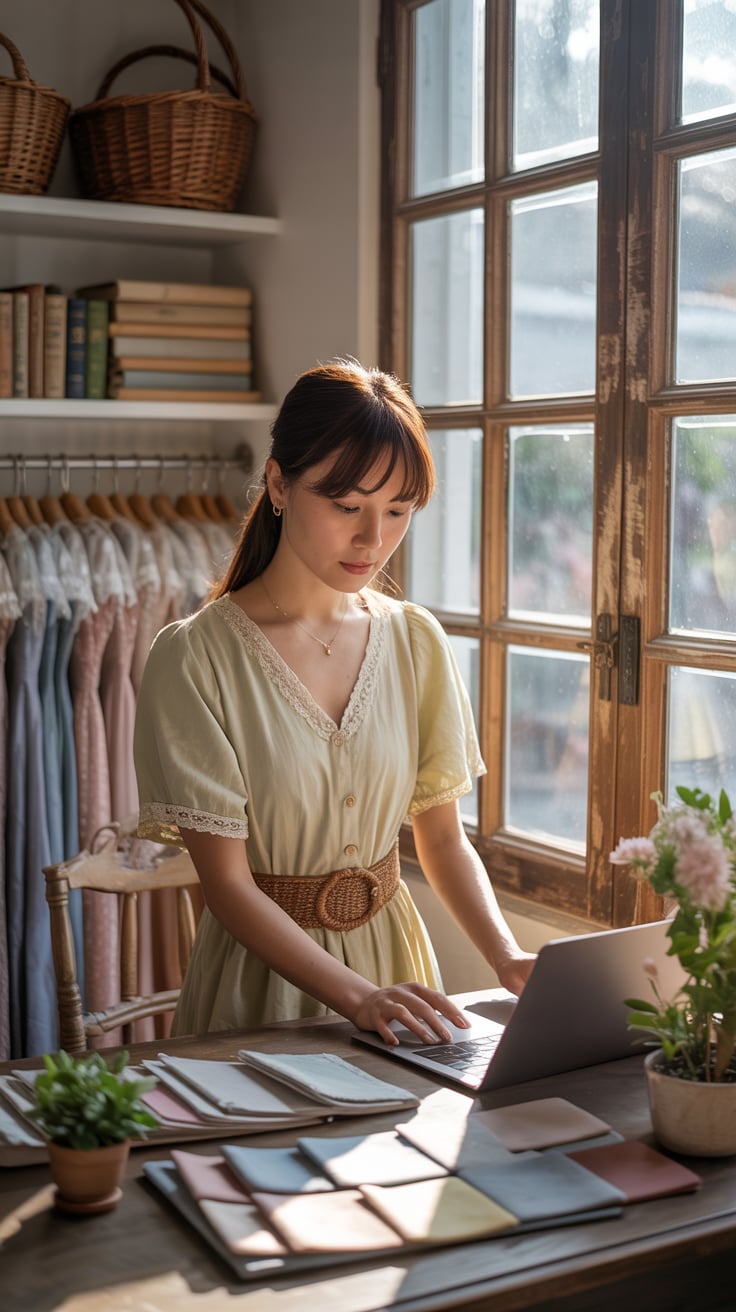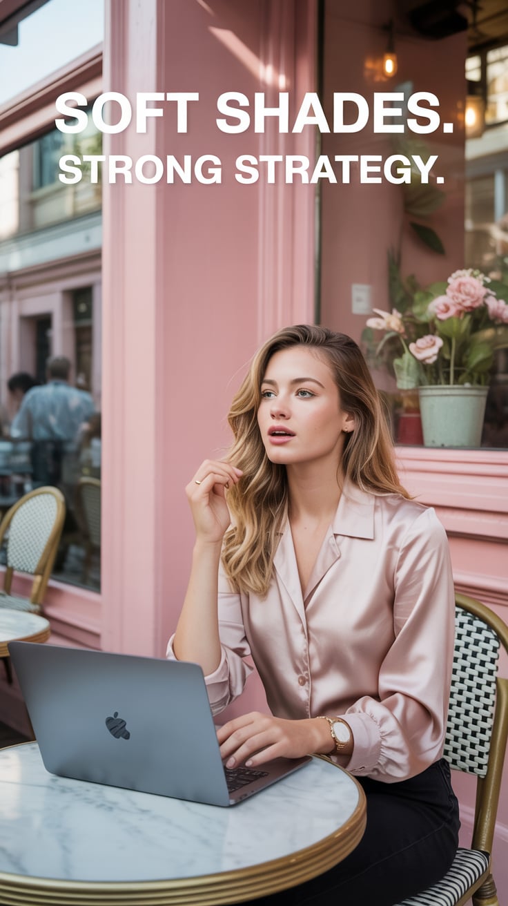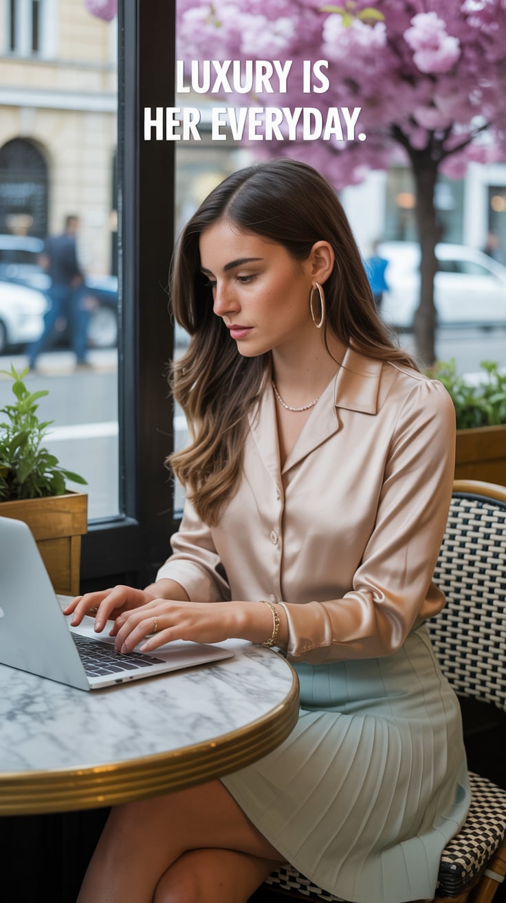 Cinematic shot of a (skin tone) woman in a satin blouse and pastel skirt, working on her laptop at a...