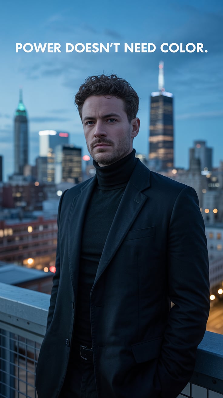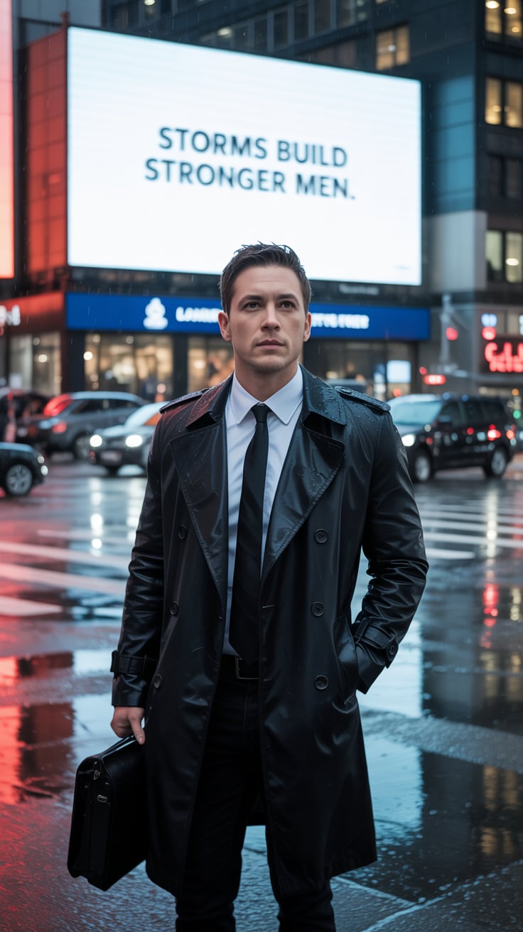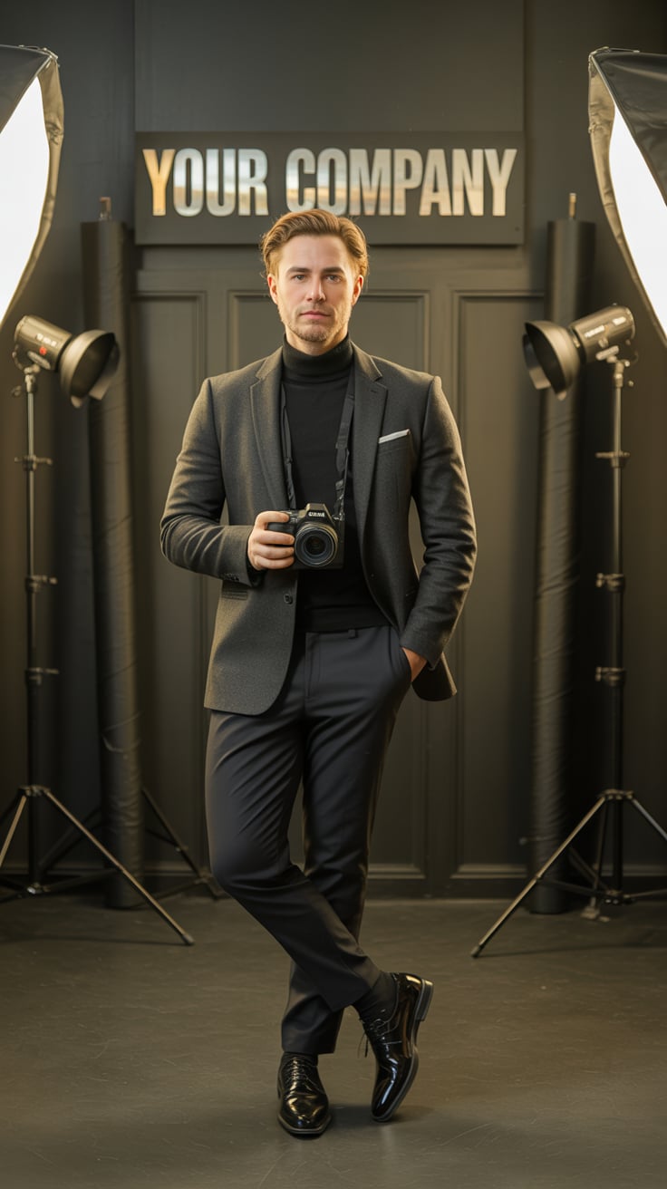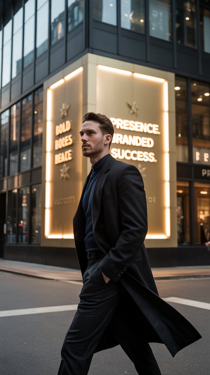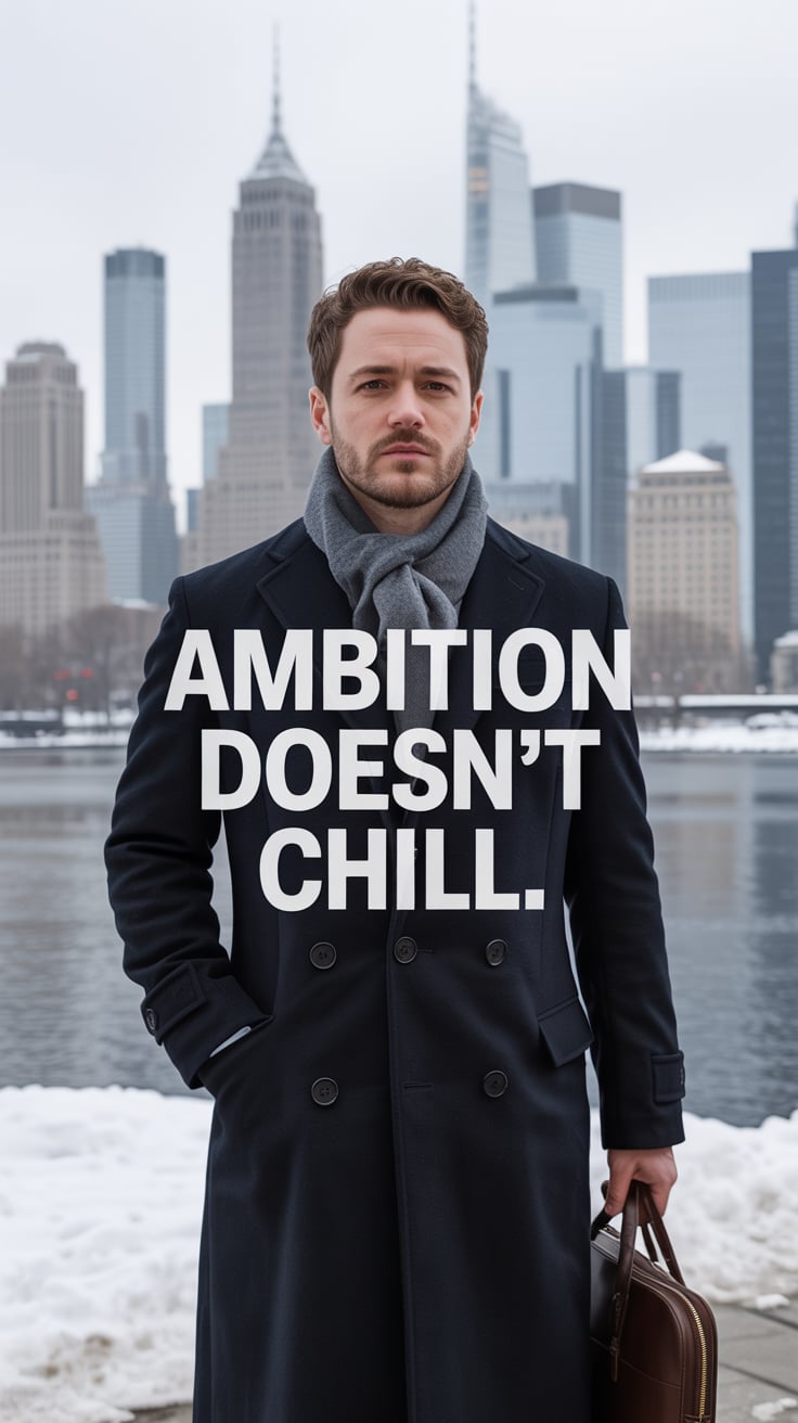 An editorial portrait of a (skin tone) male in a tailored wool overcoat and scarf, standing before a...