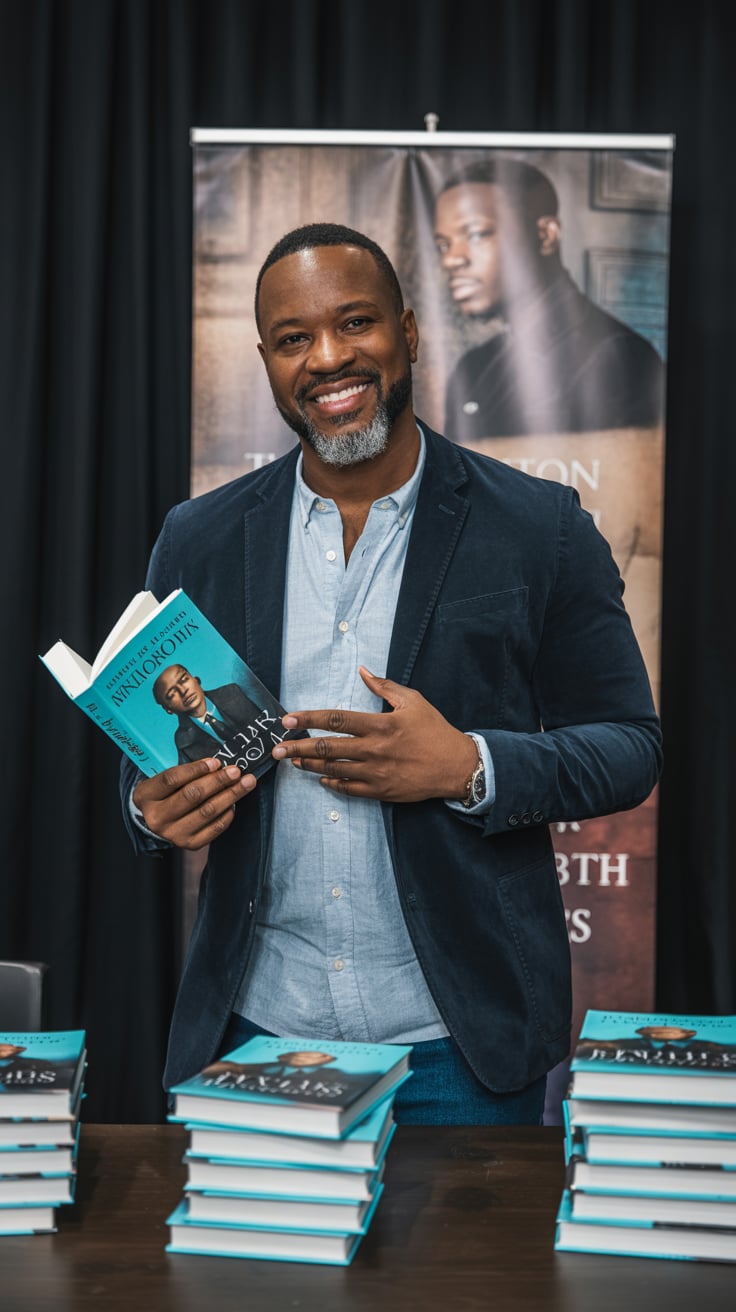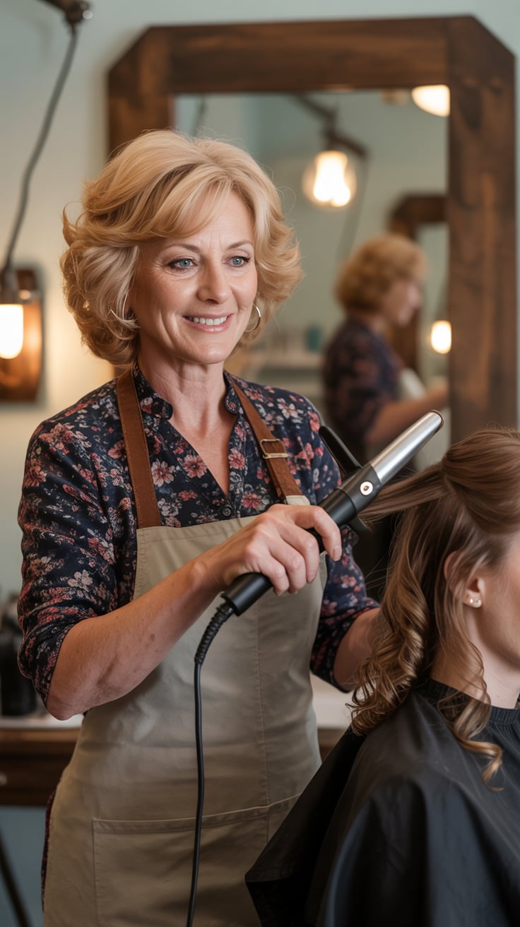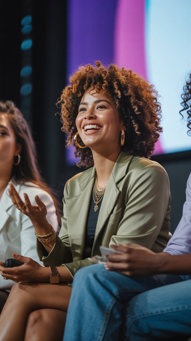 A professional headshot portrait of a (age range: middle-aged) (gender/subject) with styled (hair co...