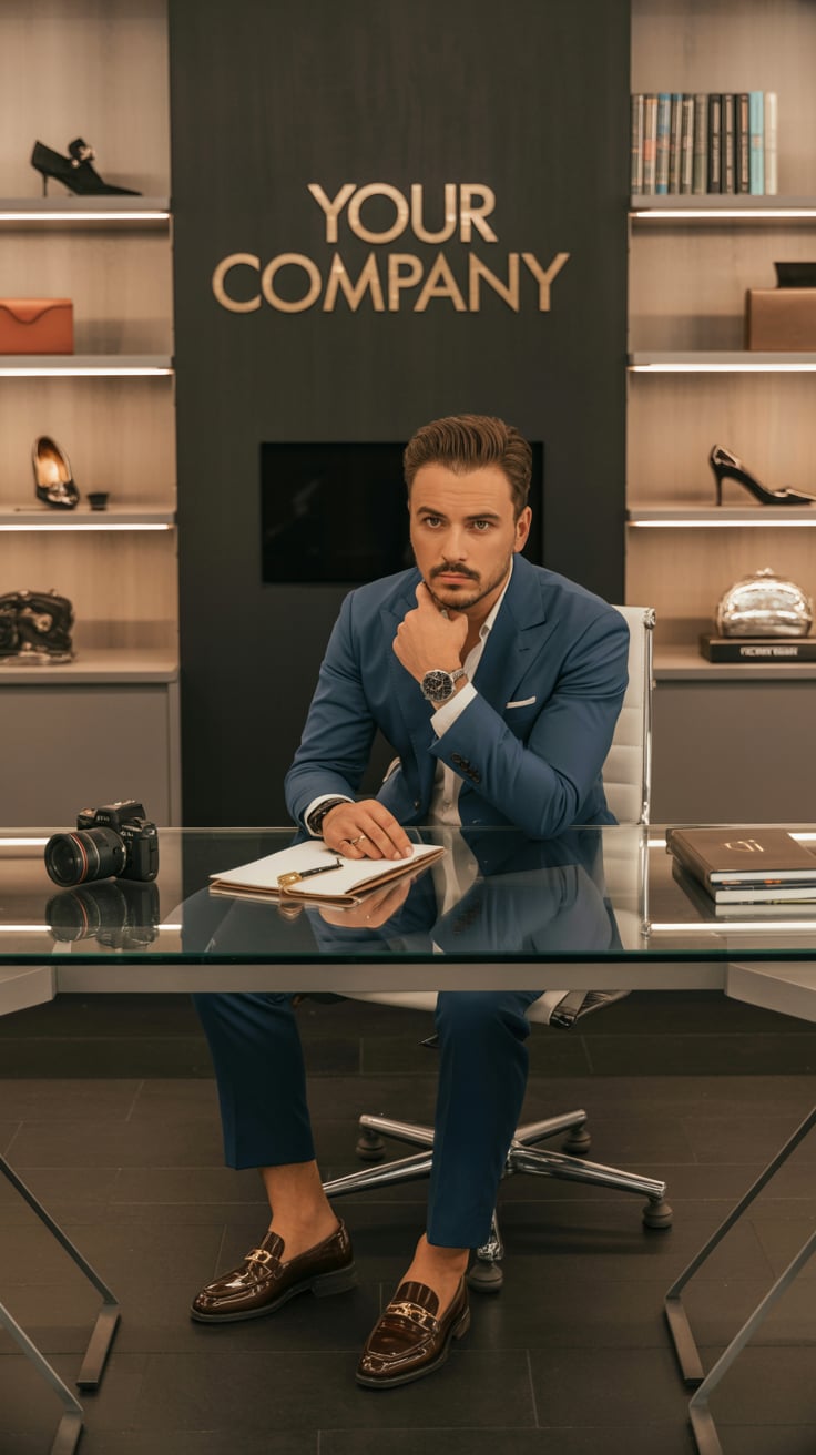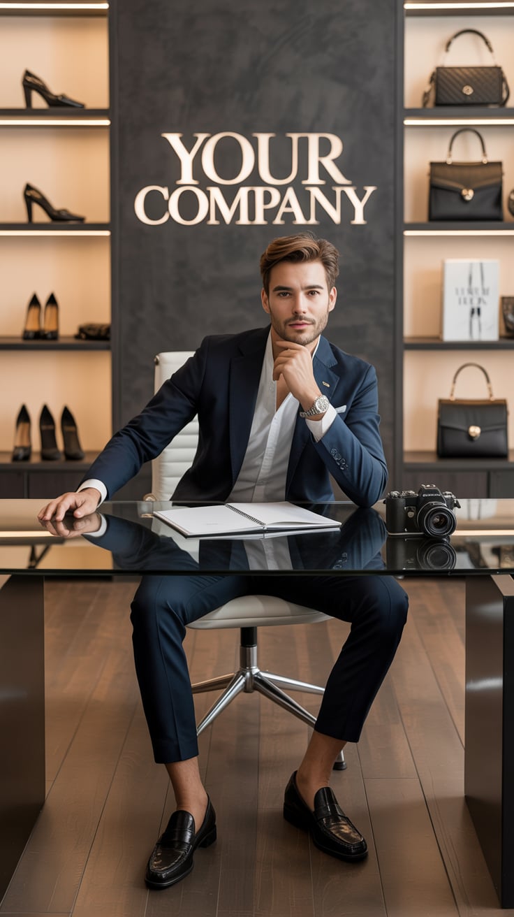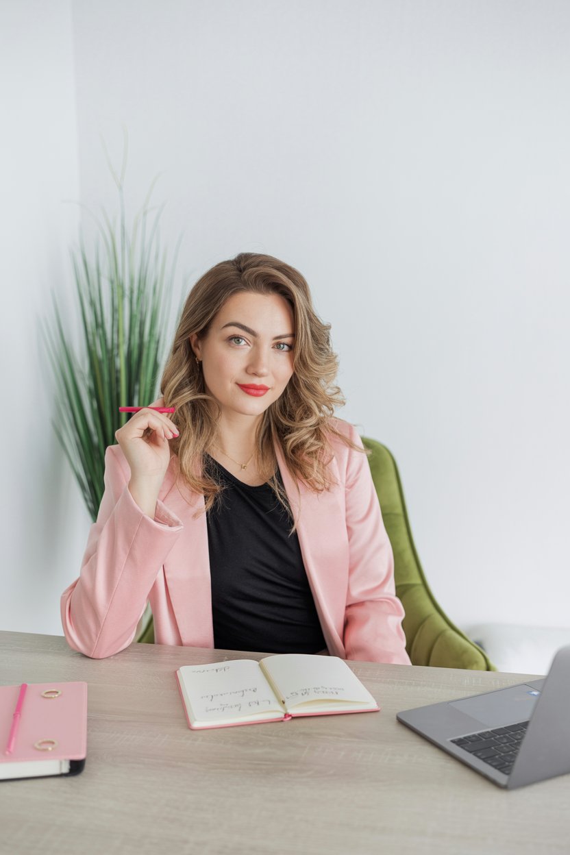A professional indoor portrait of a (gender/subject) sitting at a desk, wearing a (shirt color: ligh...