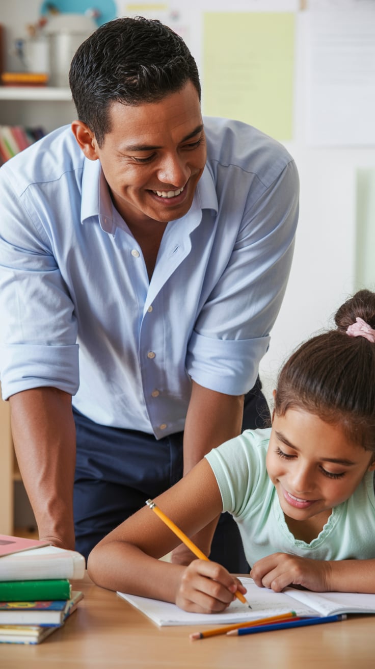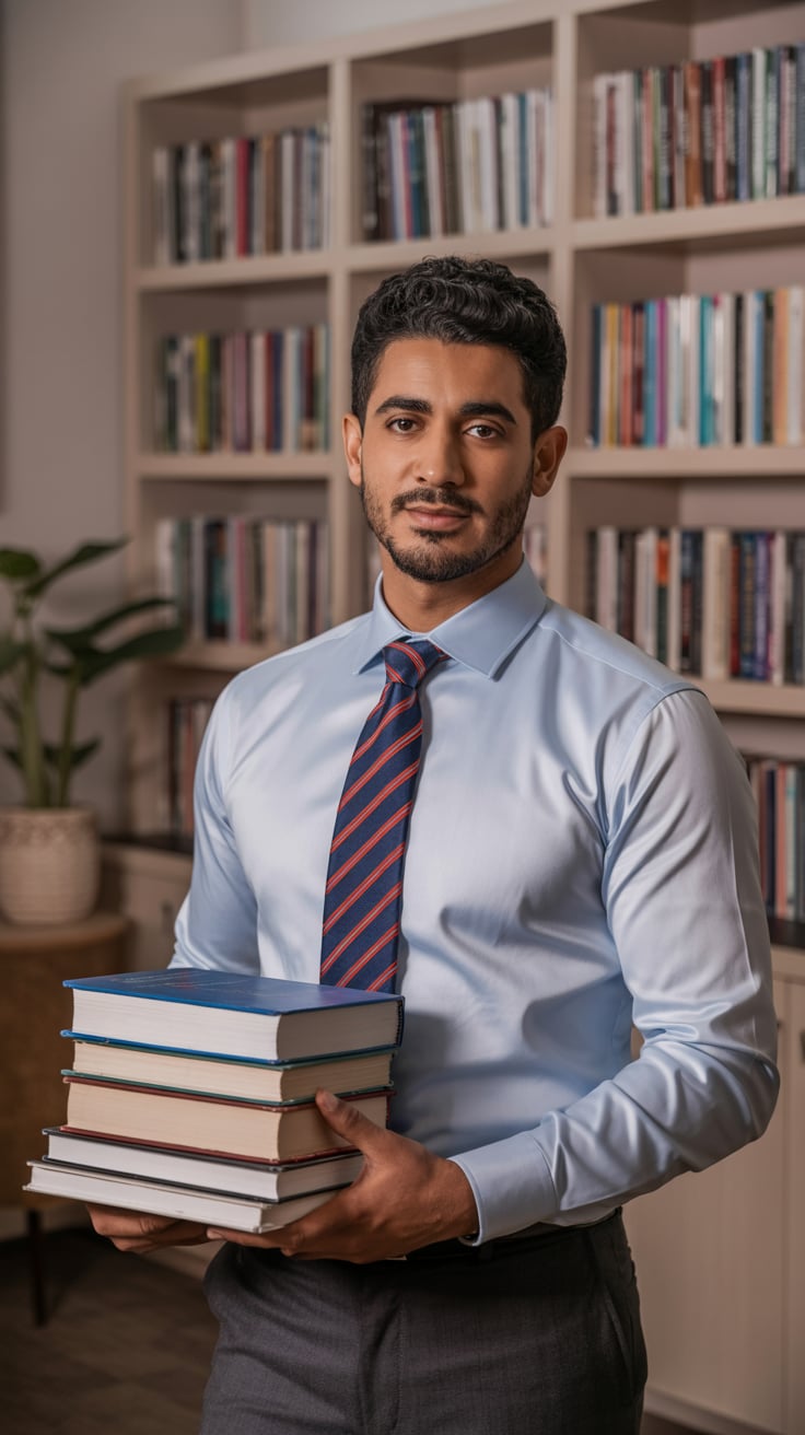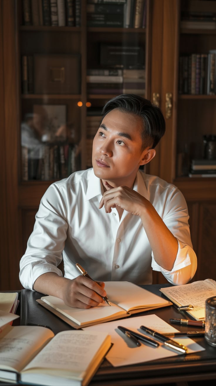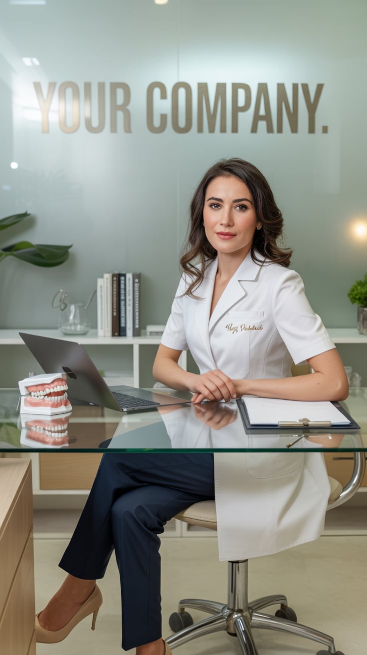 A professional indoor portrait of a (gender/subject) sitting at a desk, wearing a (shirt color: ligh...