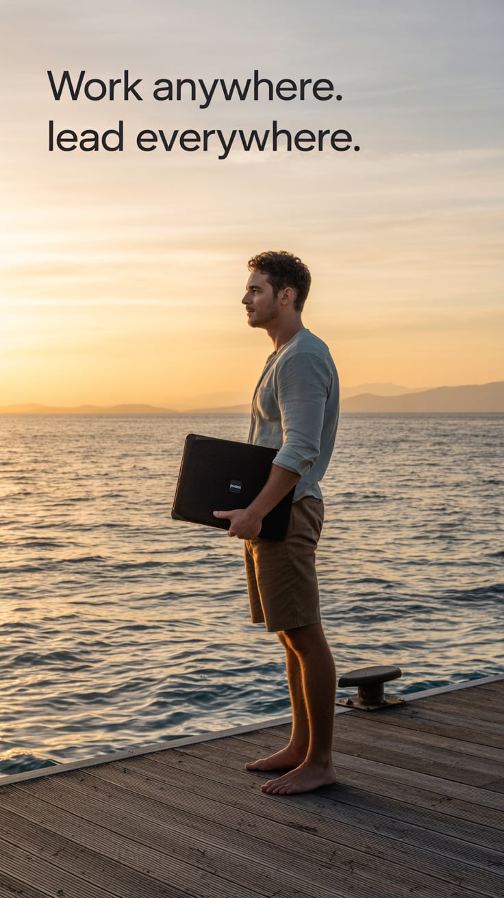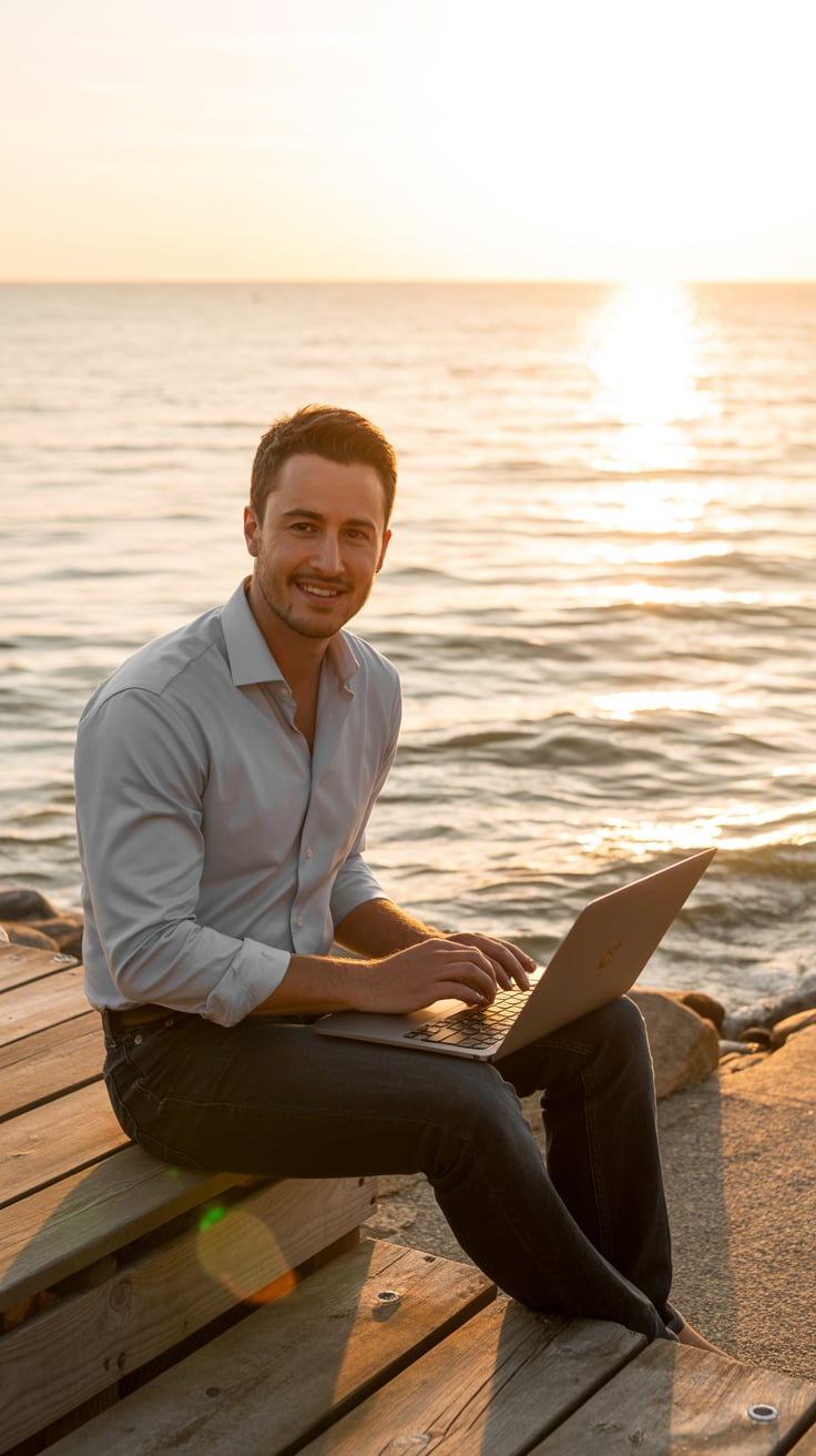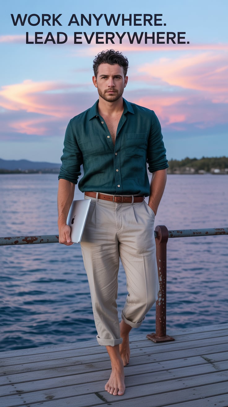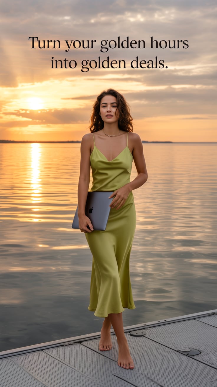 Editorial wide shot of a (skin tone) man barefoot on a dock, holding a laptop case, golden ocean sun...