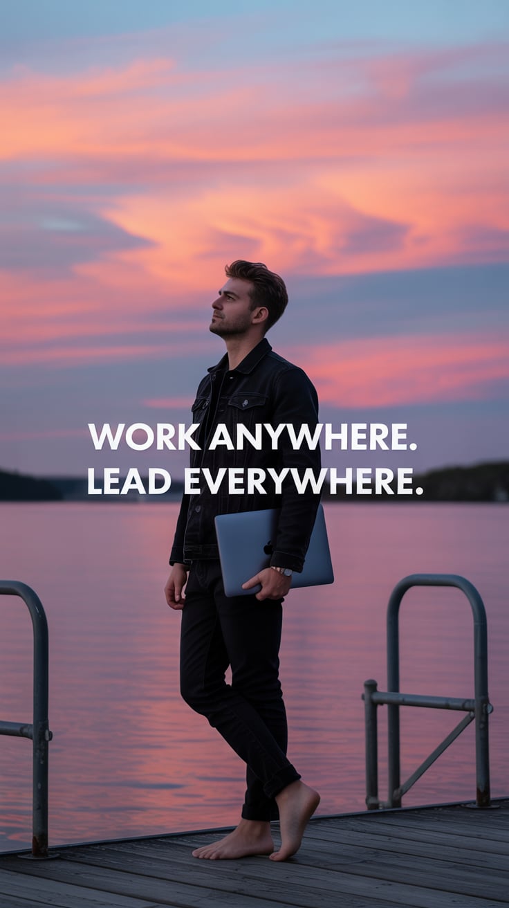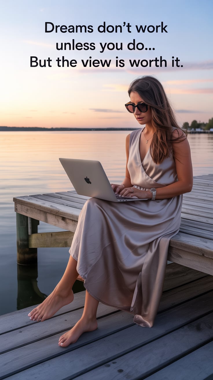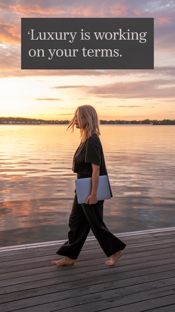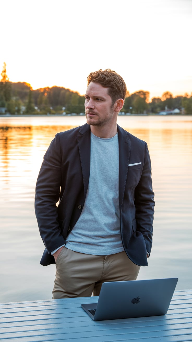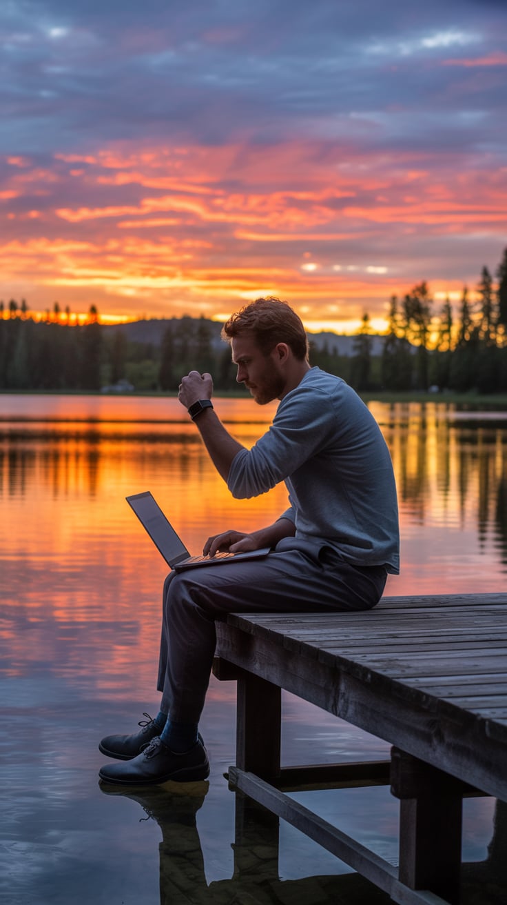 Editorial wide shot of a (skin tone) man barefoot on a dock, holding a laptop case, golden ocean sun...