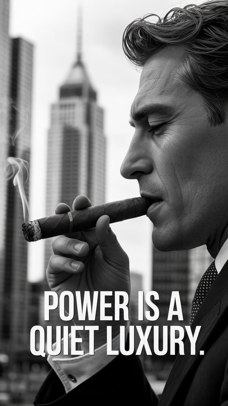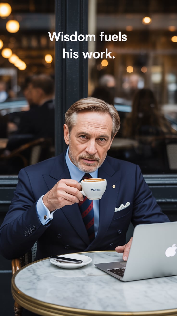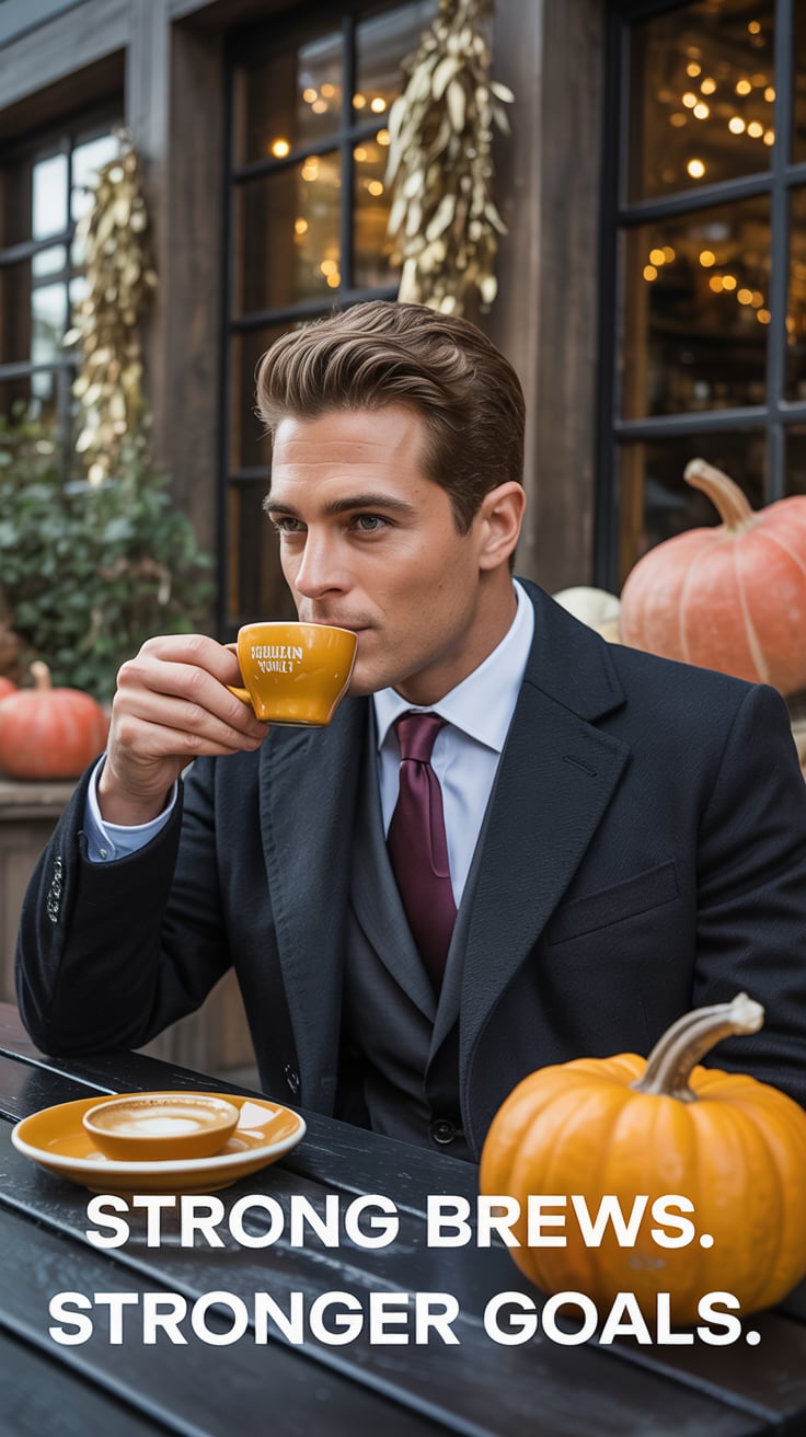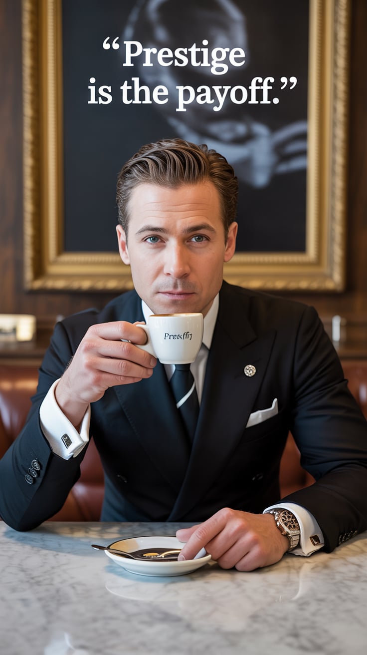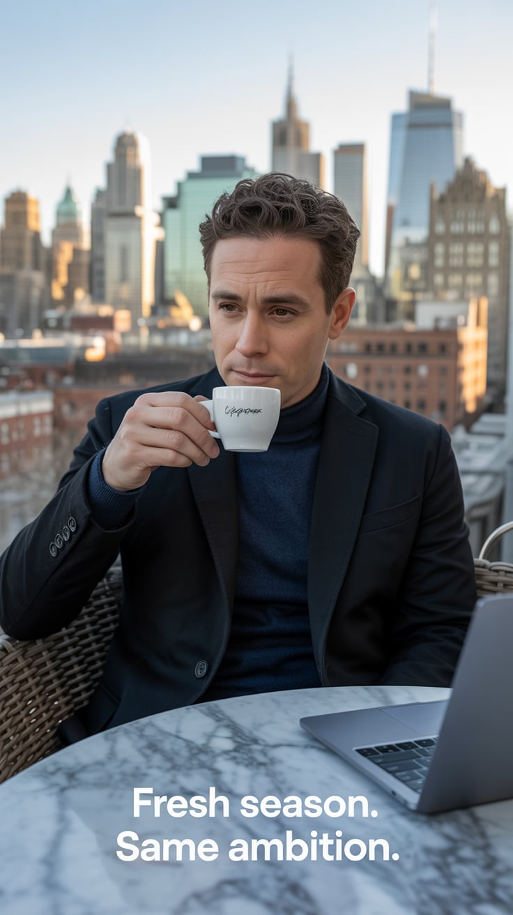 Cinematic rooftop shot of a (skin tone) man sipping espresso at a marble table, city skyline glowing...