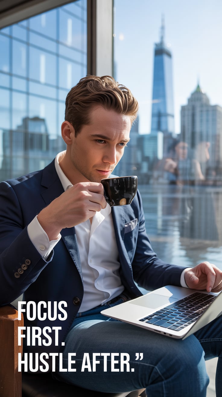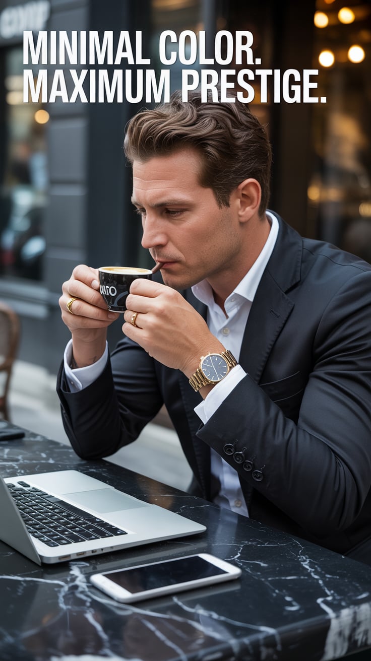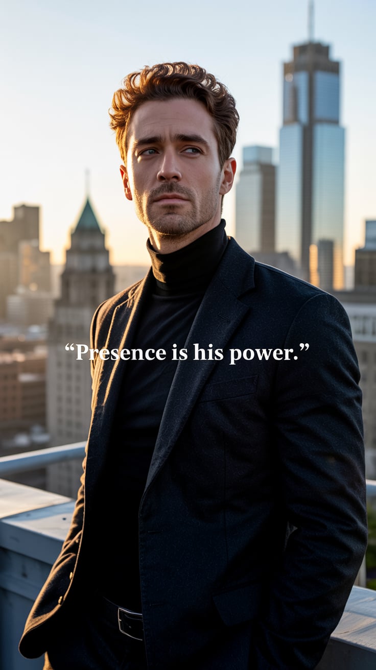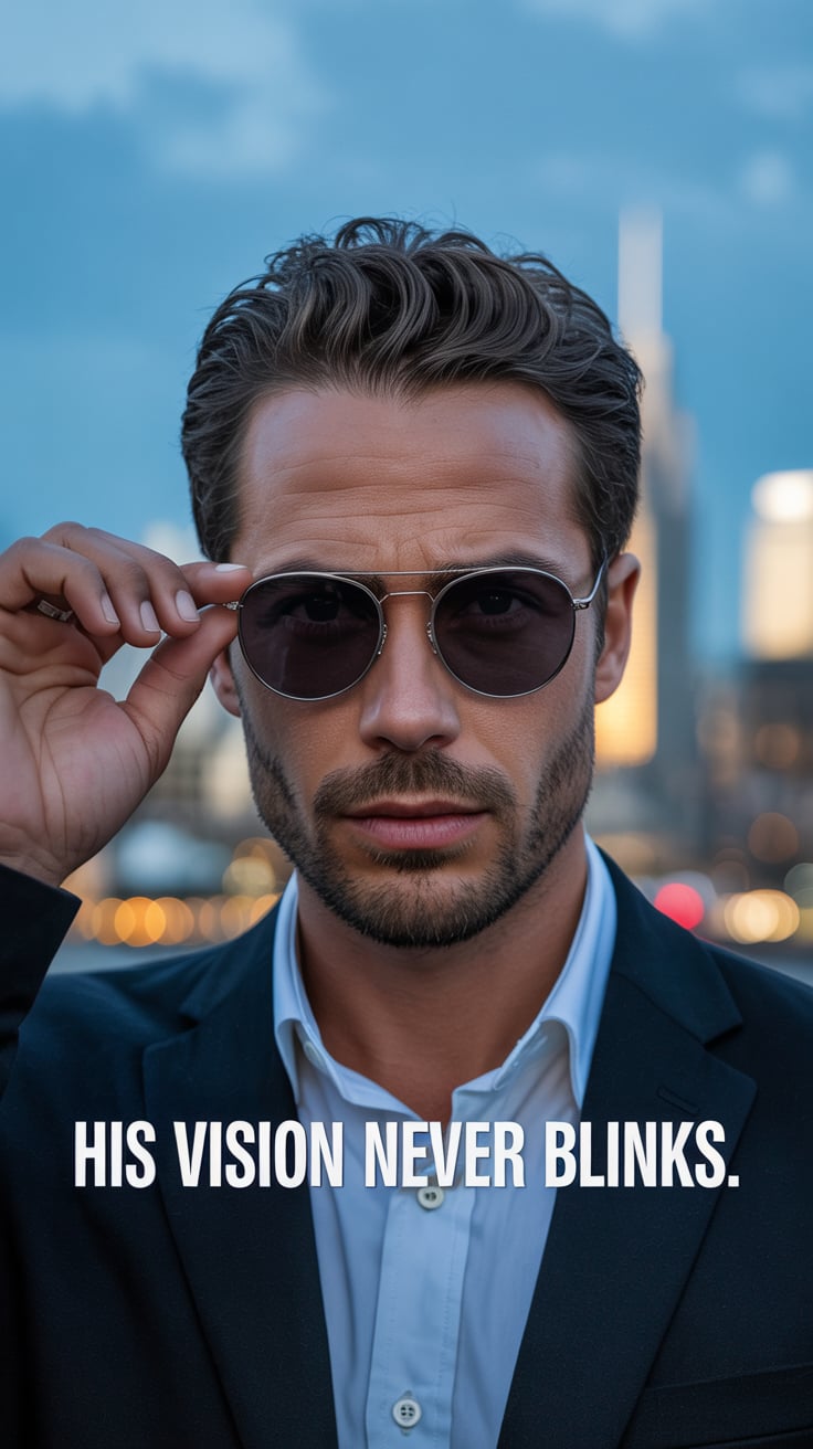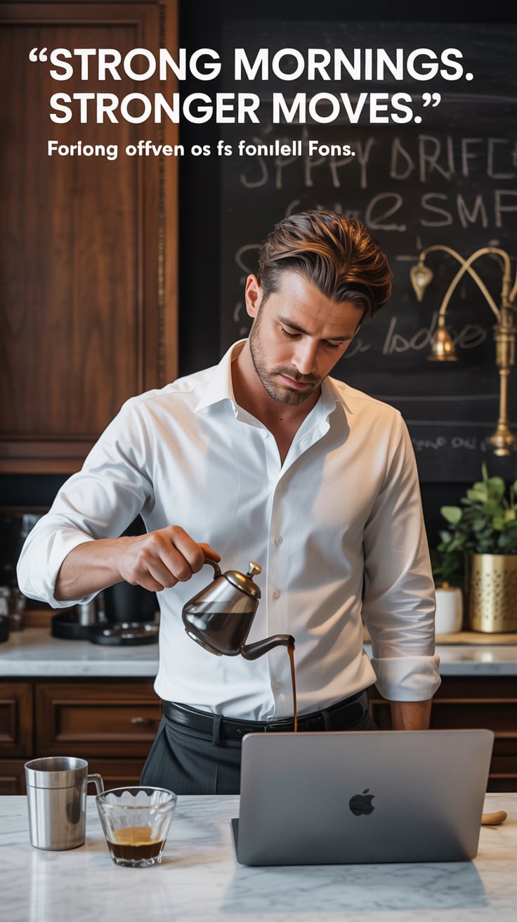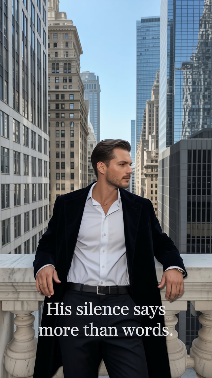 Cinematic rooftop shot of a (skin tone) man sipping espresso at a marble table, city skyline glowing...