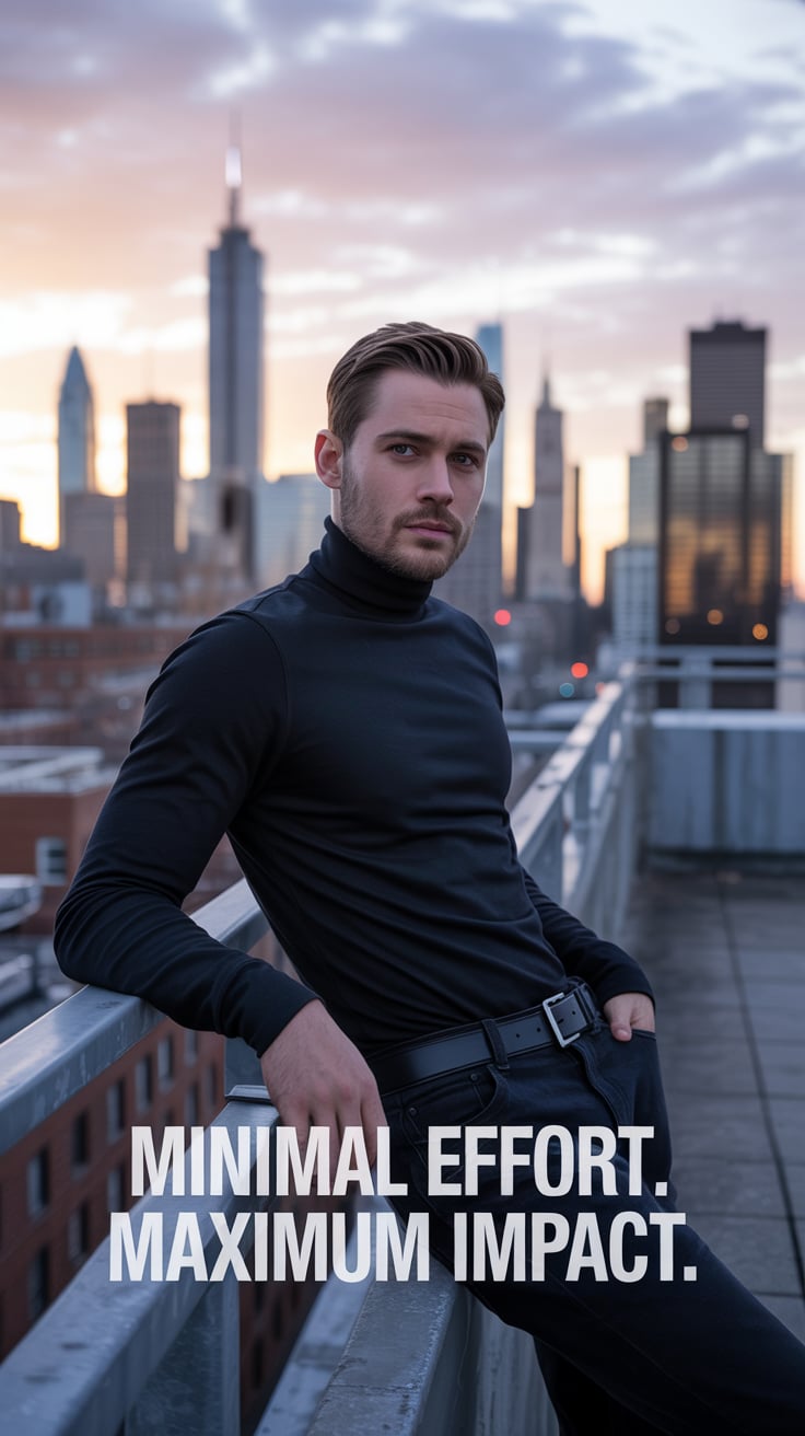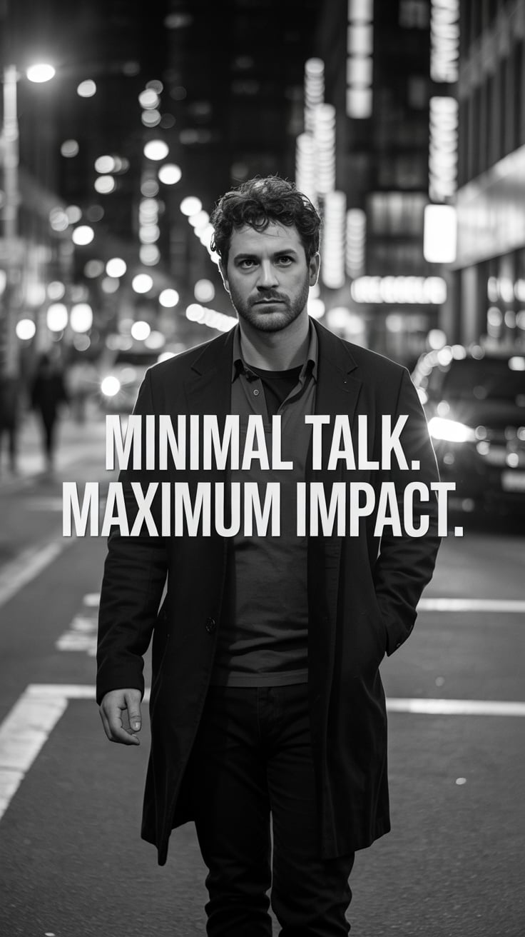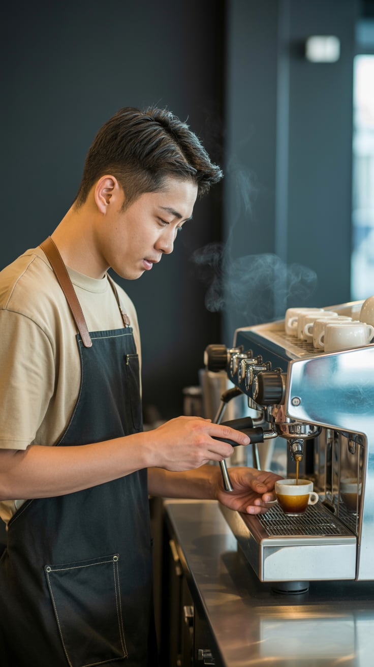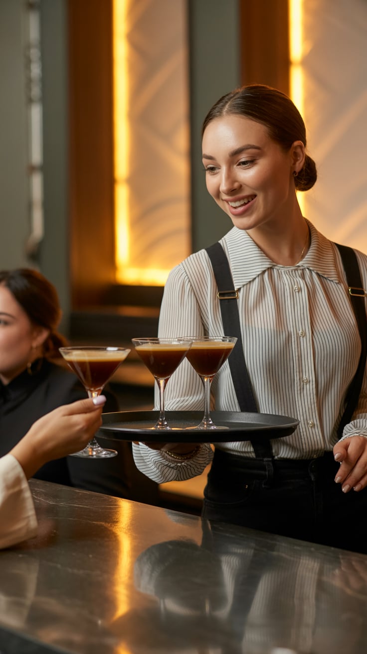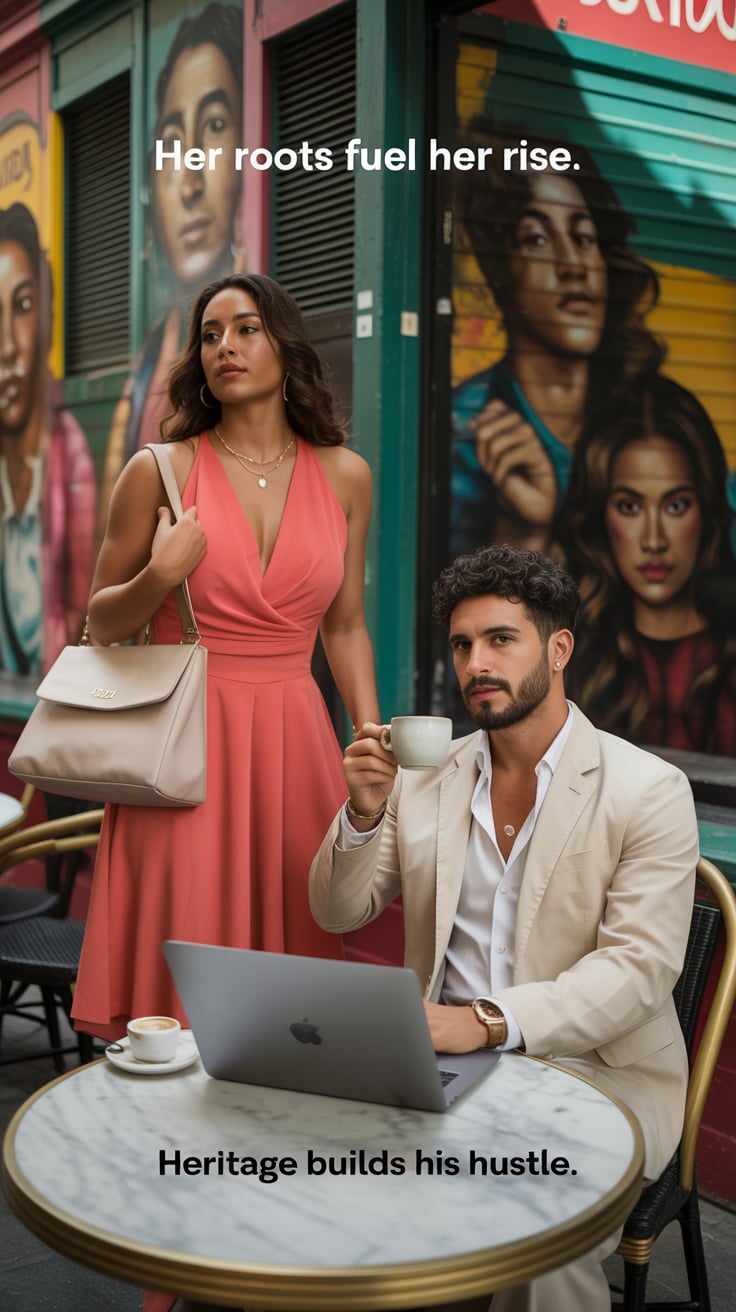 Cinematic rooftop shot of a (skin tone) man sipping espresso at a marble table, city skyline glowing...