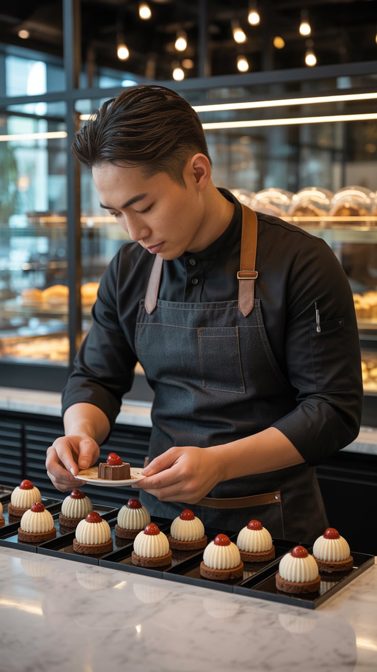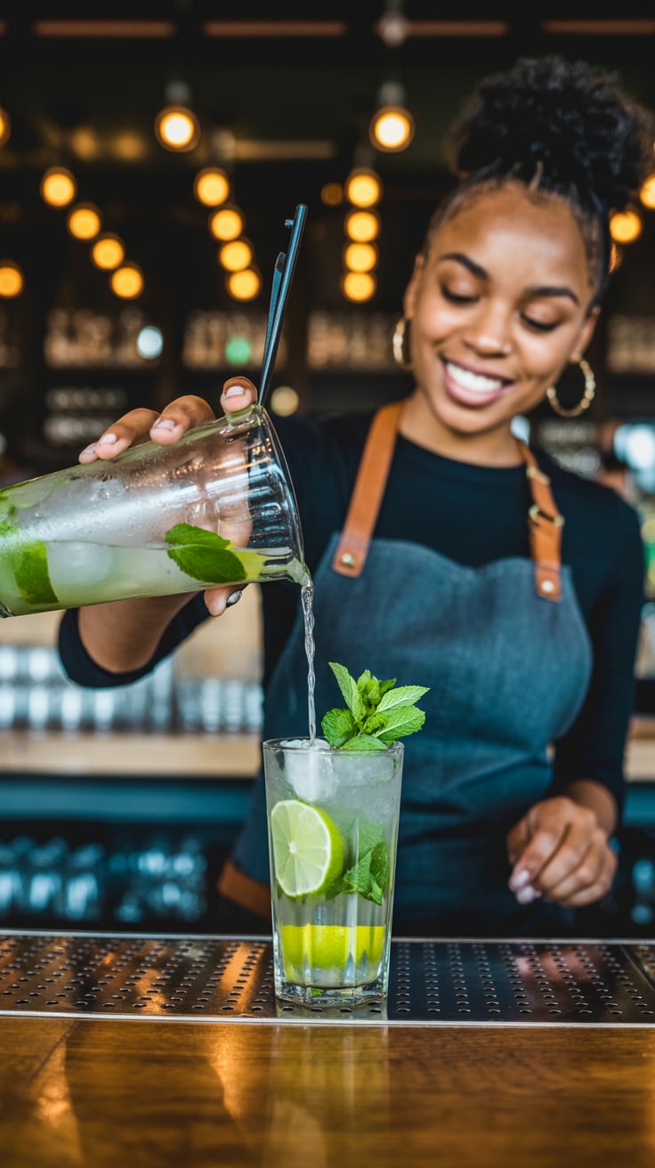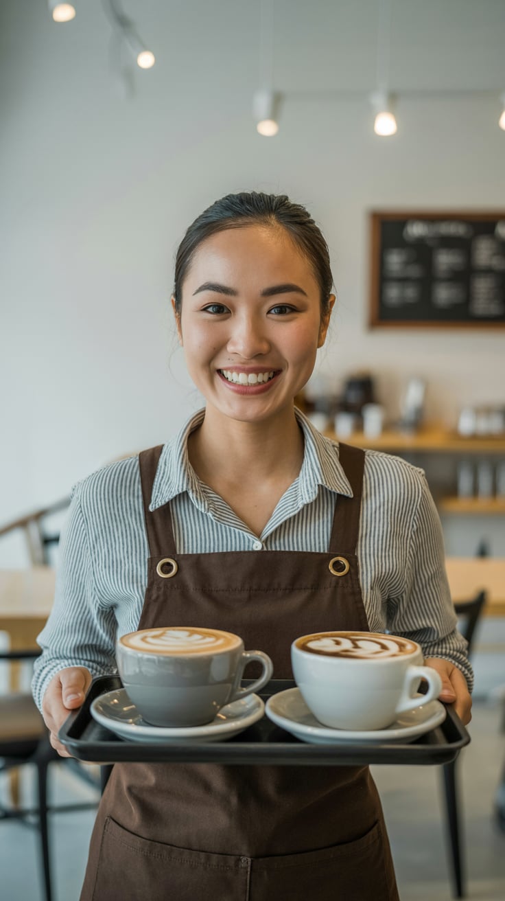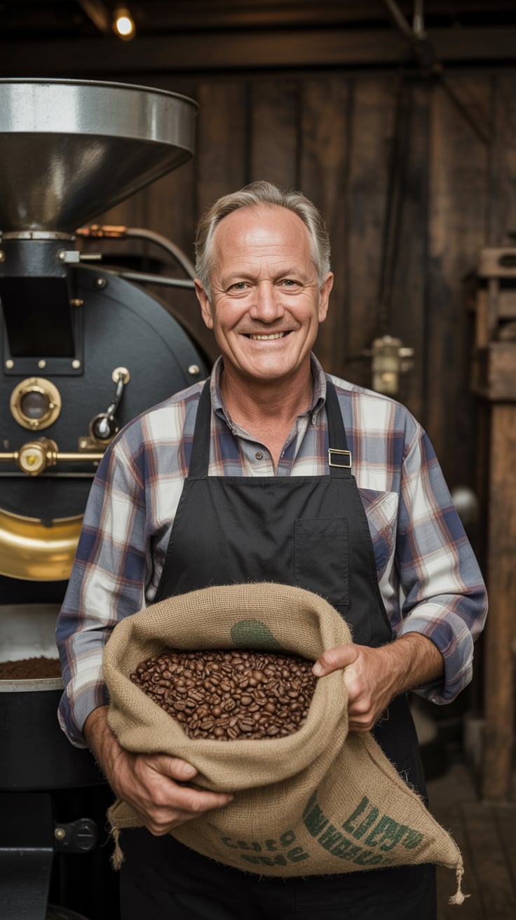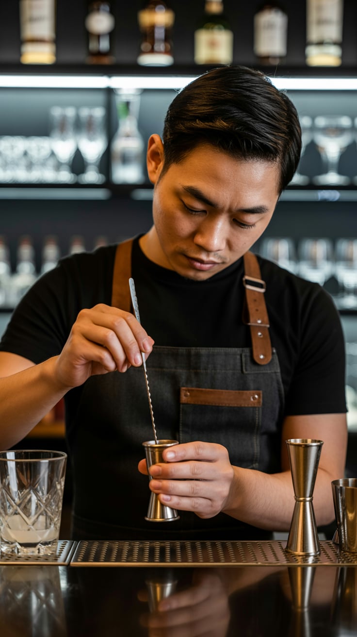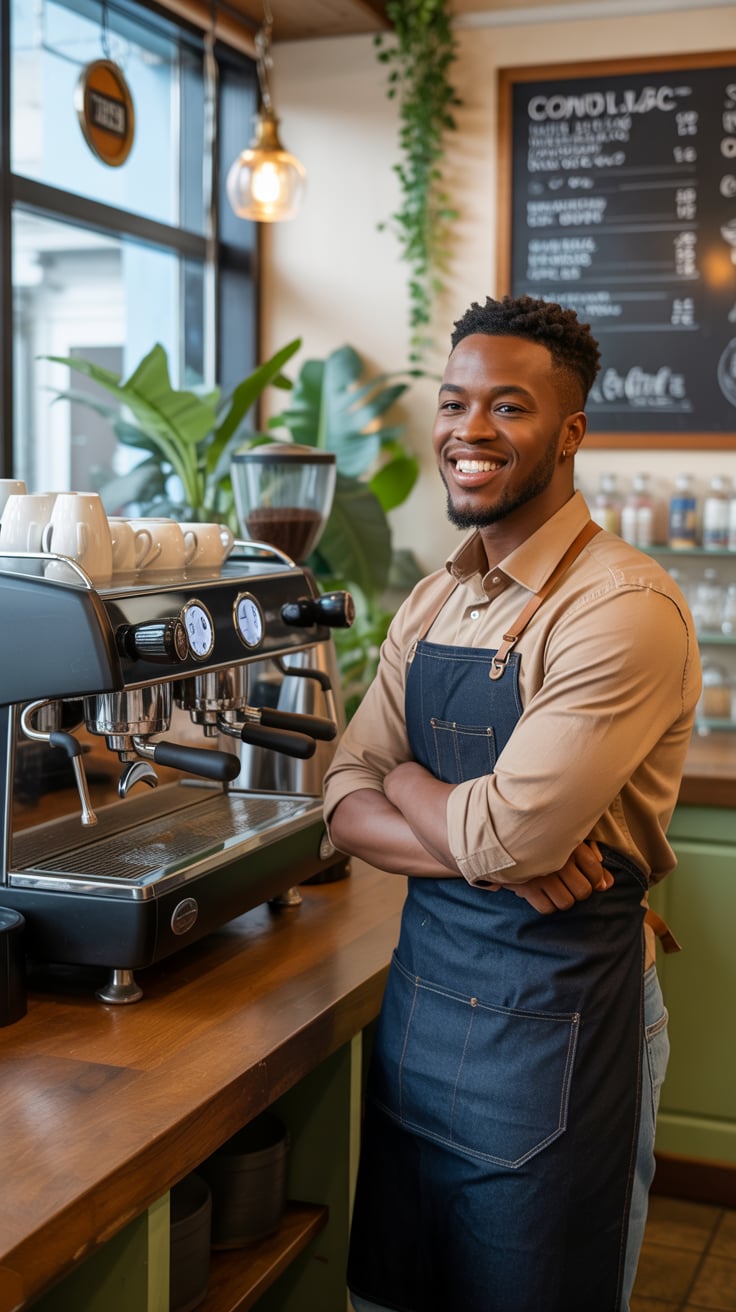 Cinematic rooftop shot of a (skin tone) man sipping espresso at a marble table, city skyline glowing...