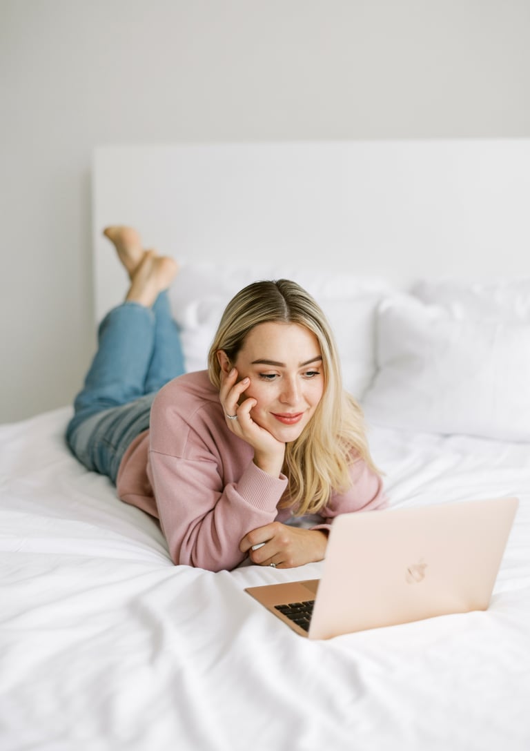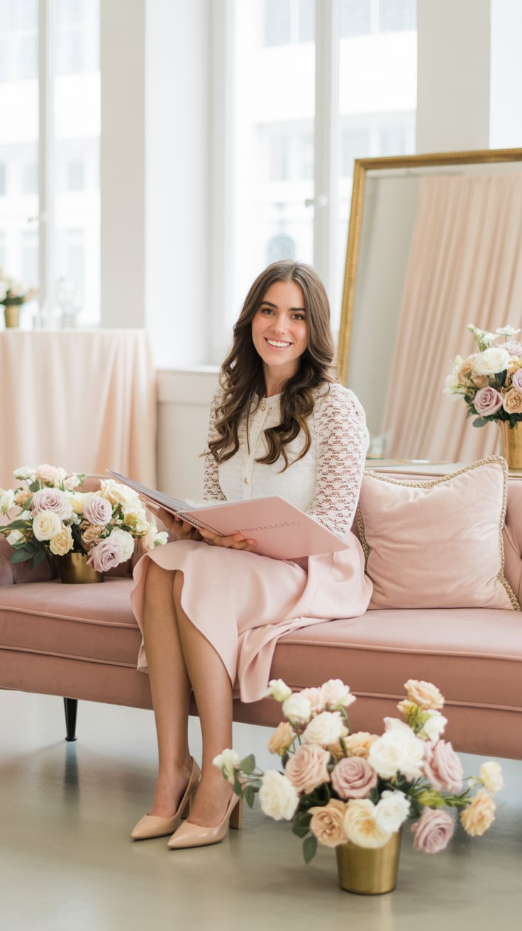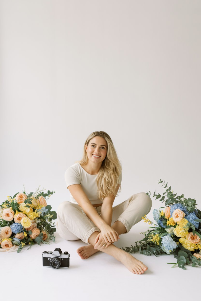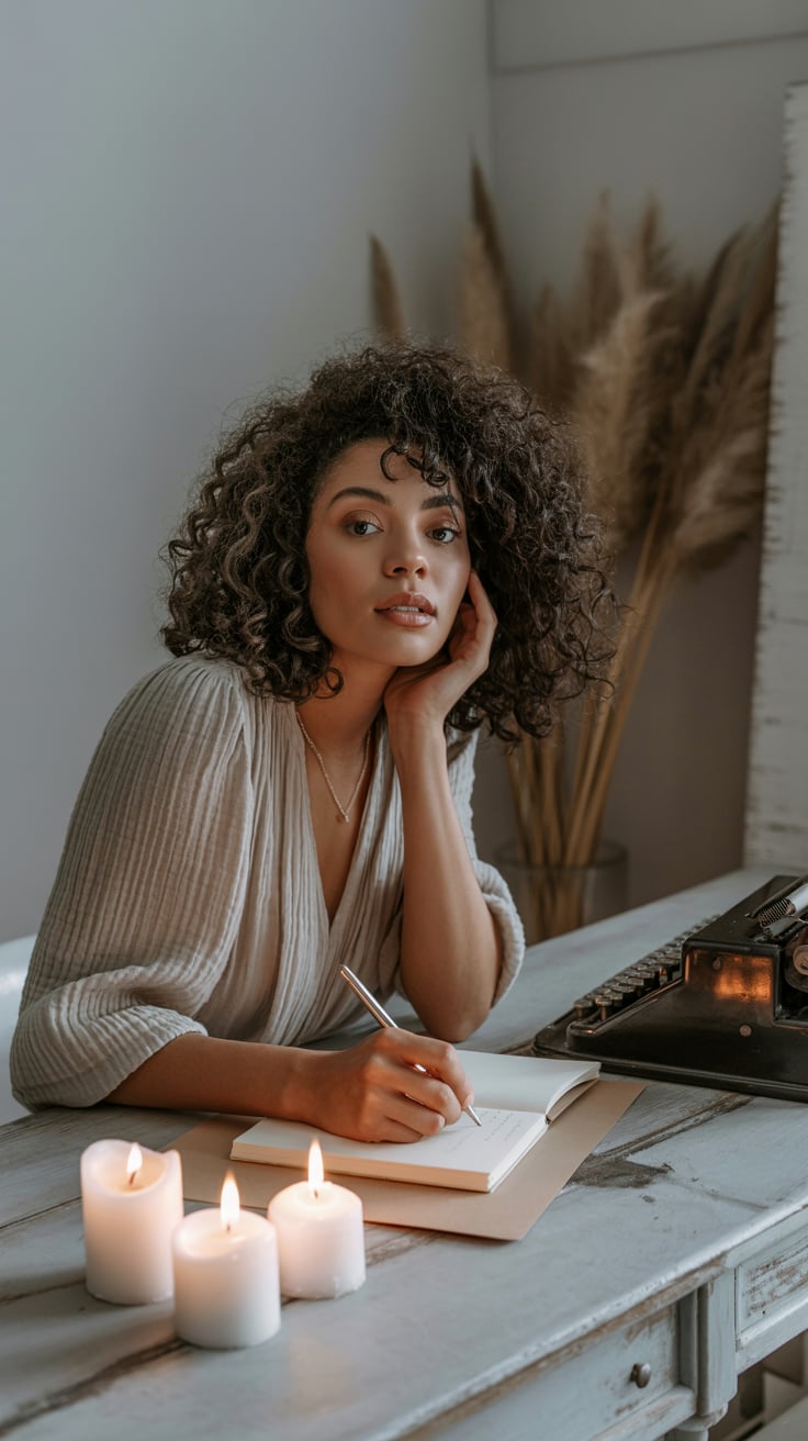 Lifestyle portrait with feminine aesthetic. A (skin color) (age range) (gender/subject) sits in a mo...