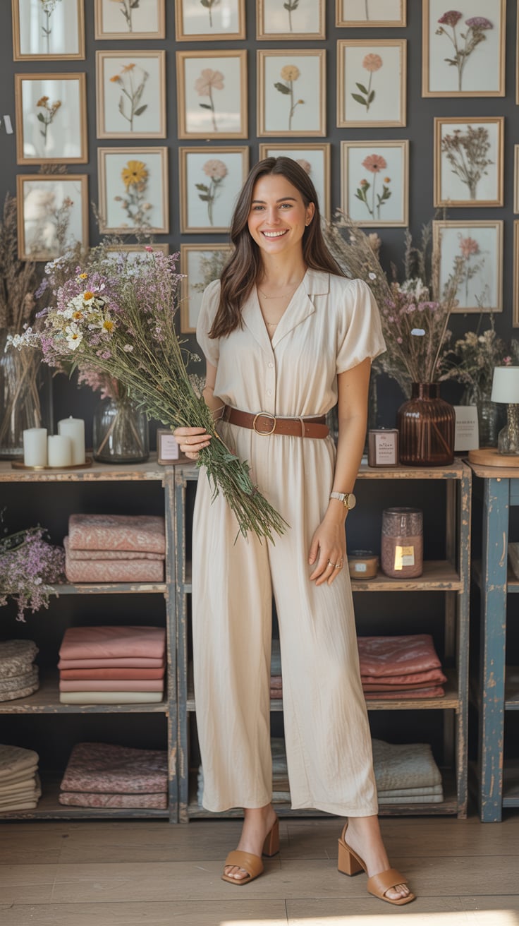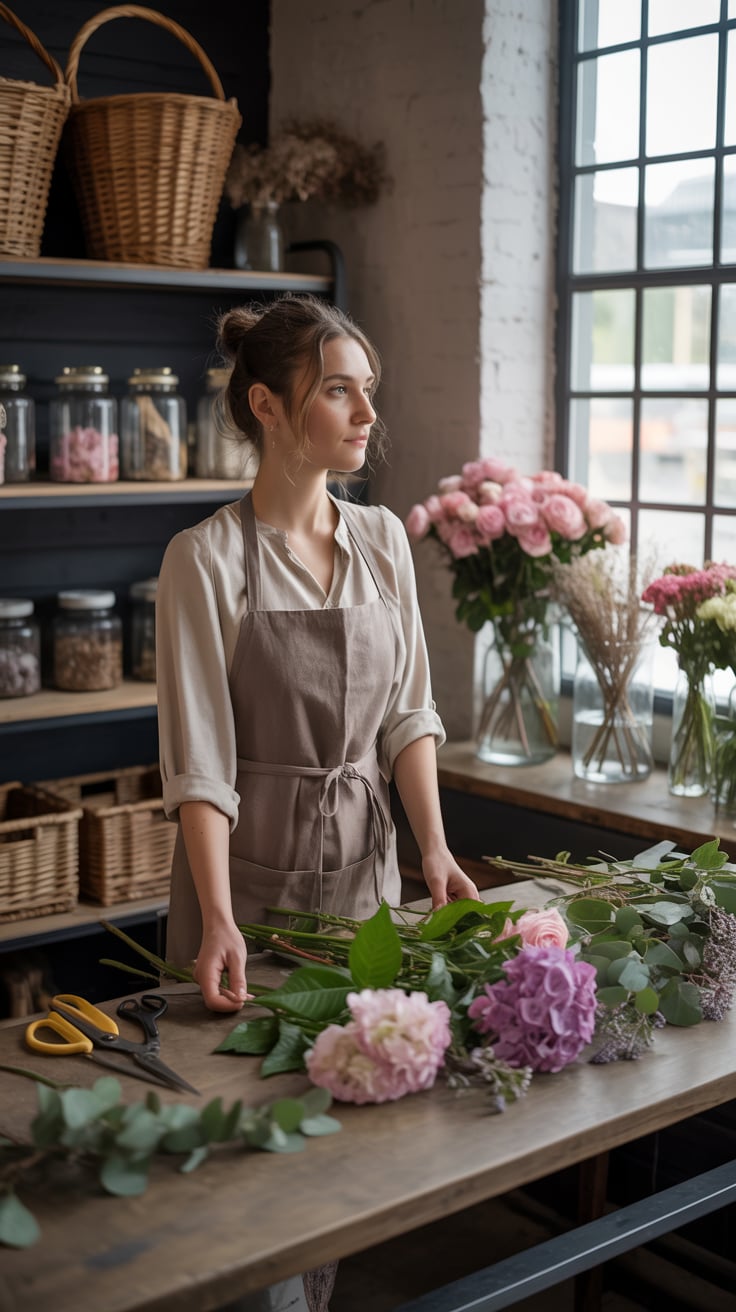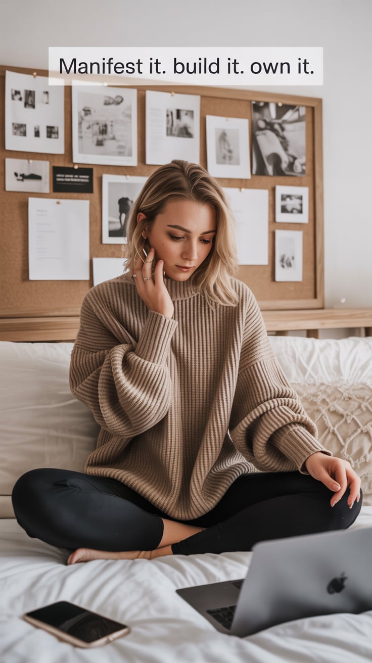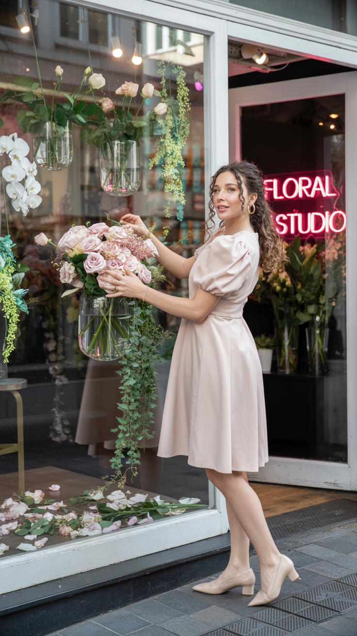 Lifestyle portrait with feminine aesthetic. A (skin color) (age range) (gender/subject) sits in a mo...