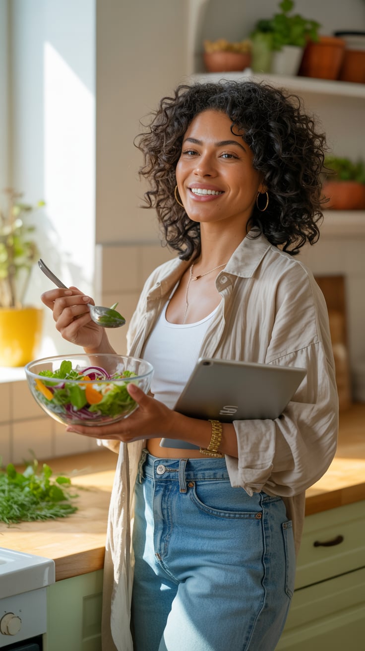 A bright interior lifestyle photograph of a (skin color) (age range) (gender/subject) with a (body s...