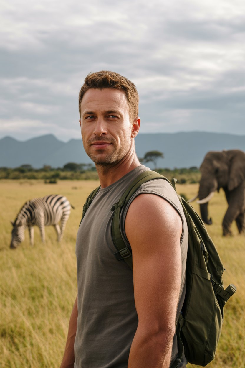 A portrait shot of a (skin color) (gender/subject) in an African safari setting. The subject wears a...