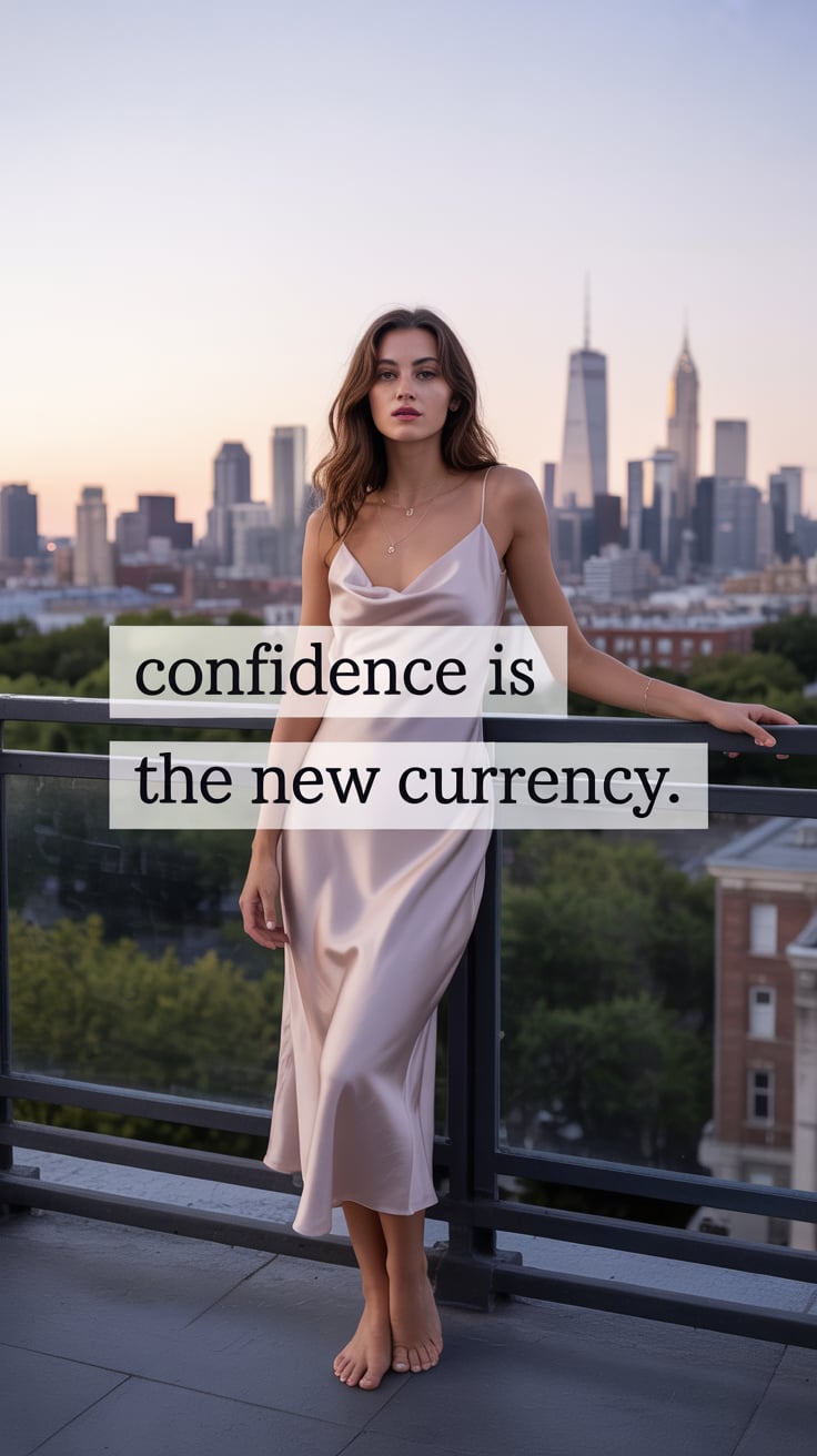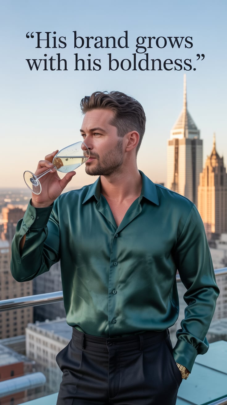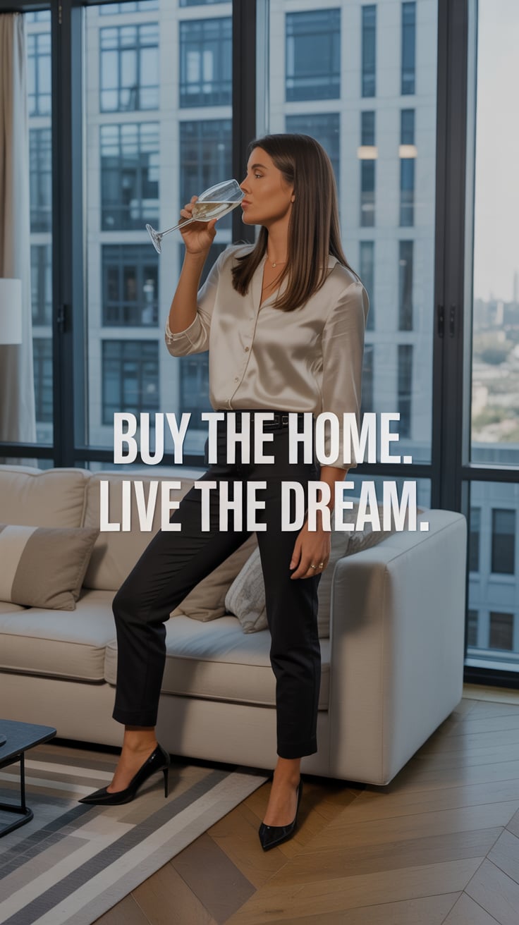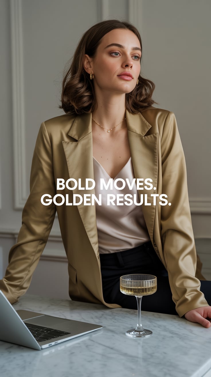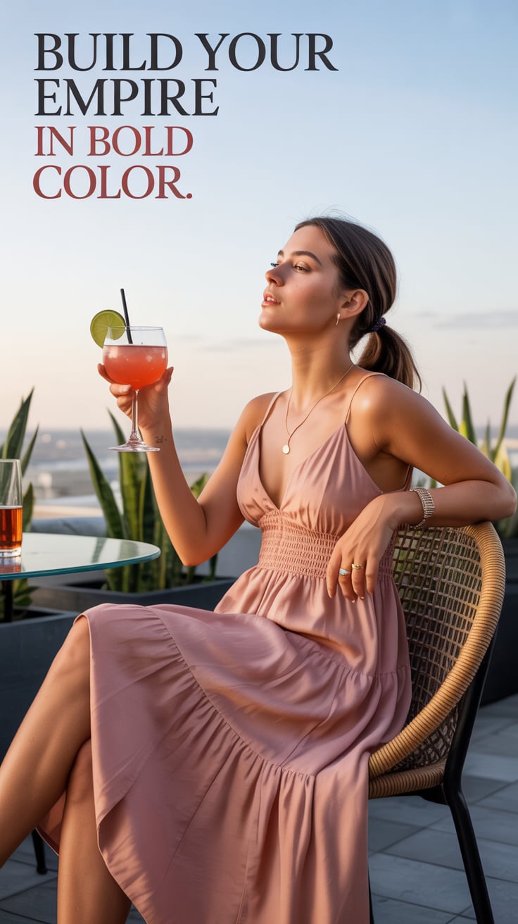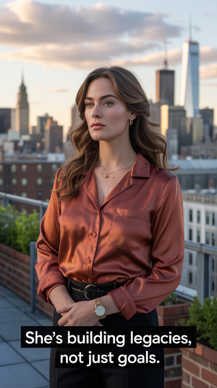 A luxury lifestyle shot of a (skin tone) female in a chic rust silk blouse, sipping wine on a roofto...