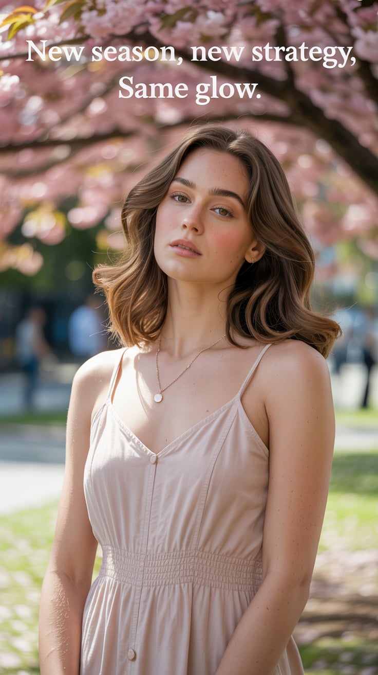 Editorial portrait of a (skin tone) woman in a blush pink dress, standing under blooming cherry blos...