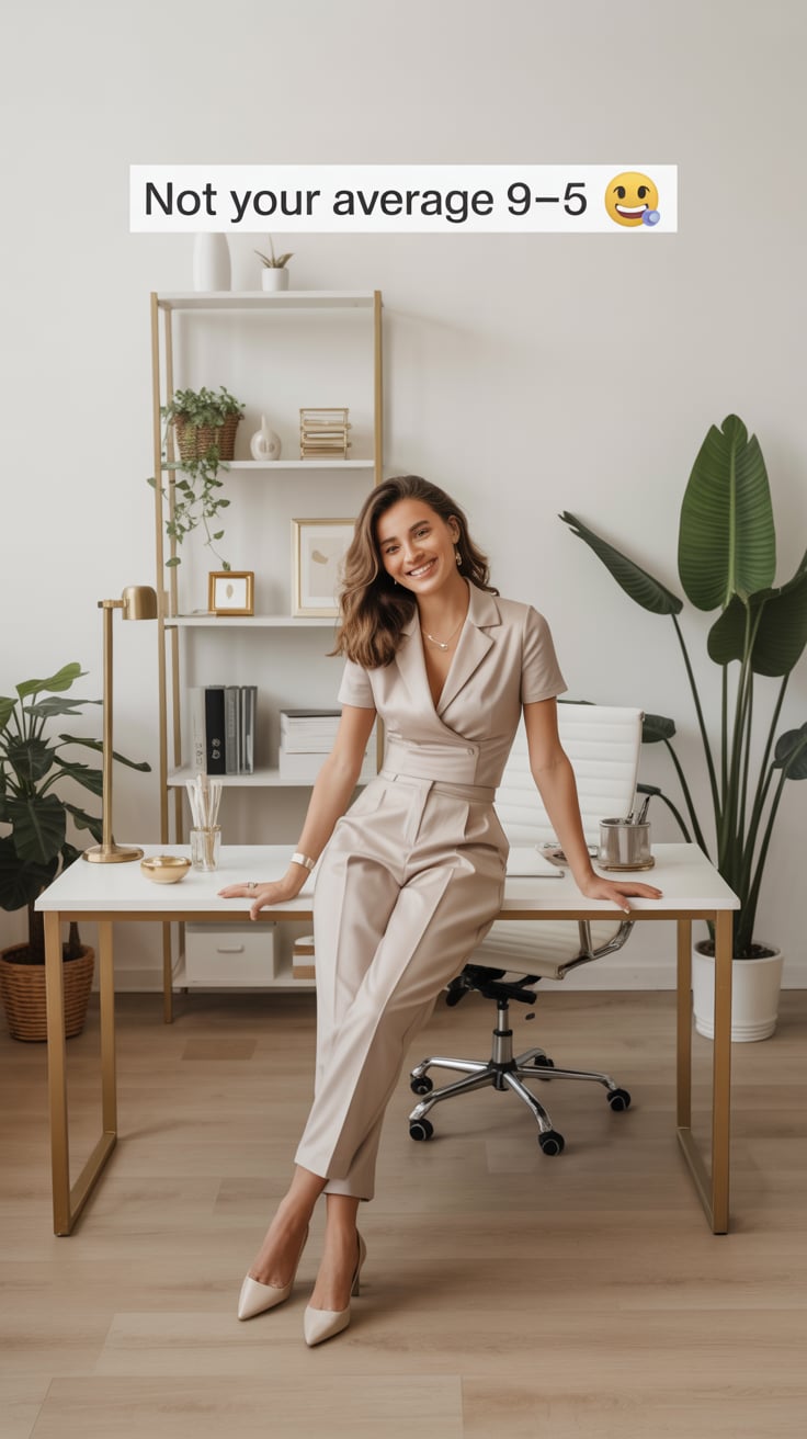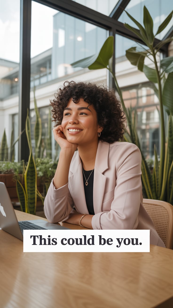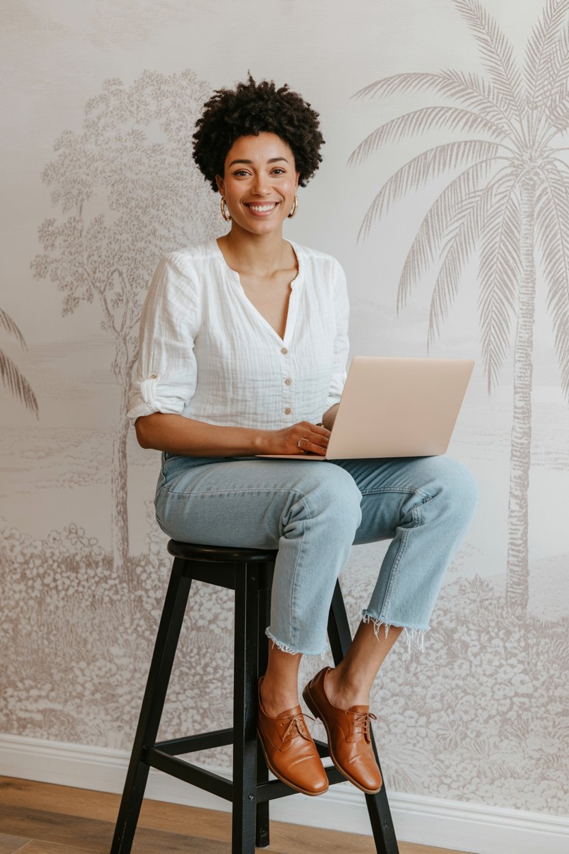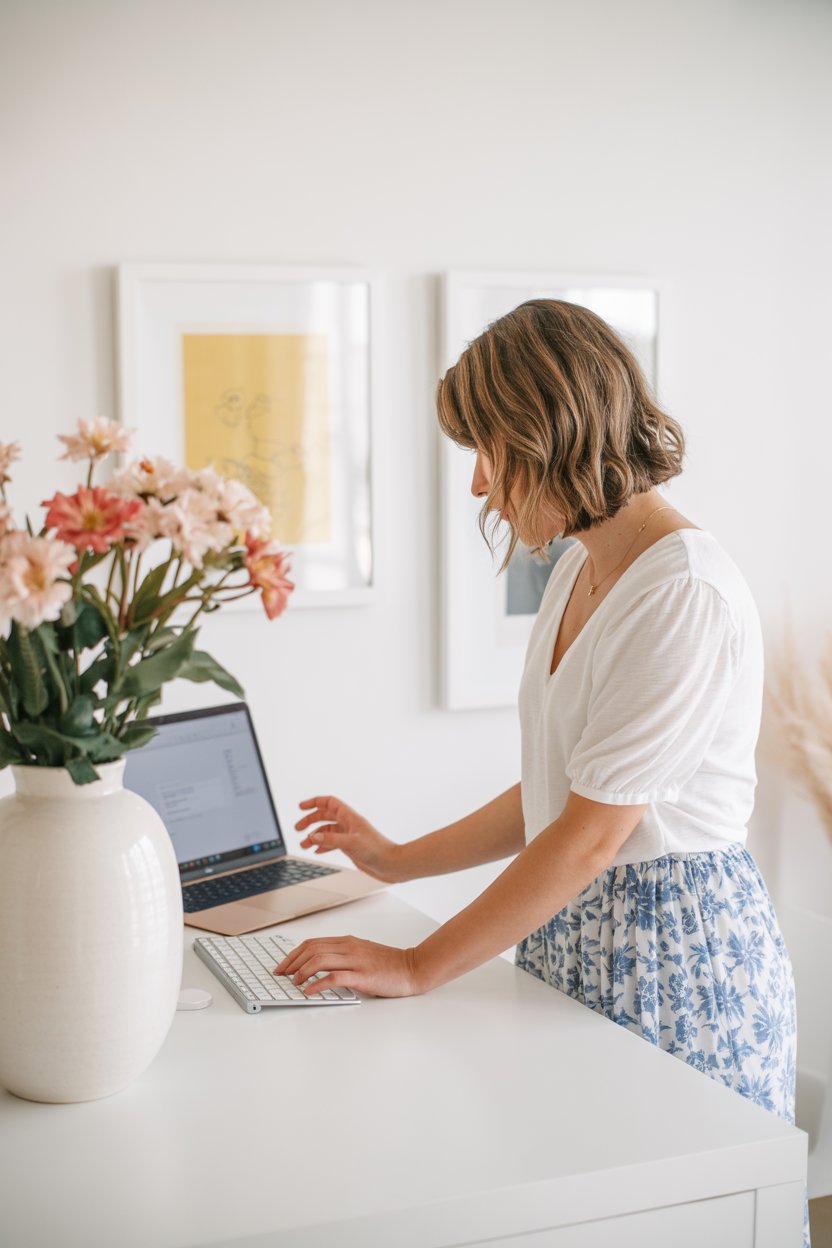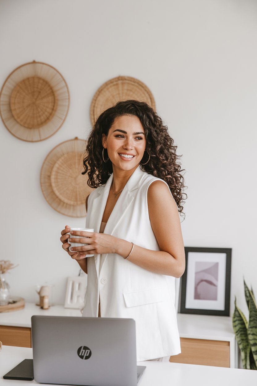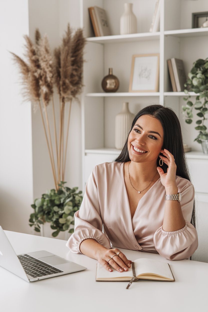 A lifestyle portrait in a cozy minimalist home office. A (skin color) (gender/subject) sits at a rus...