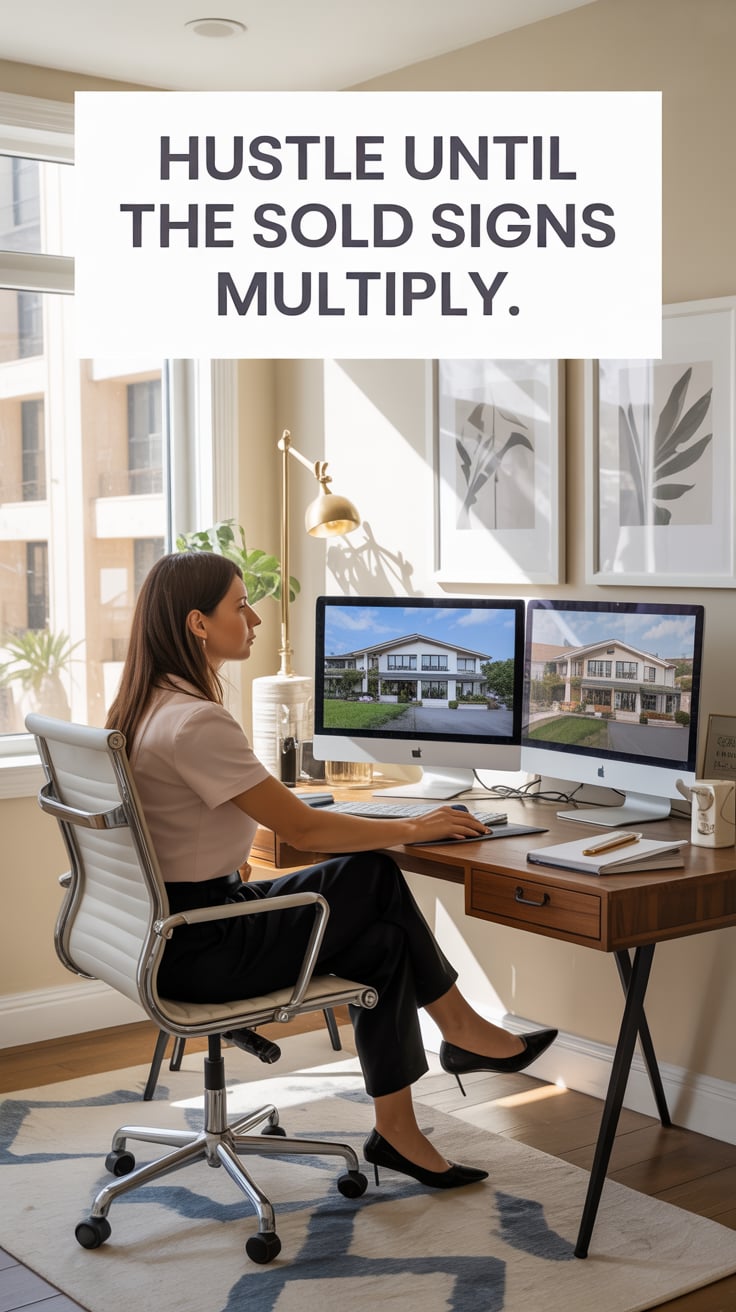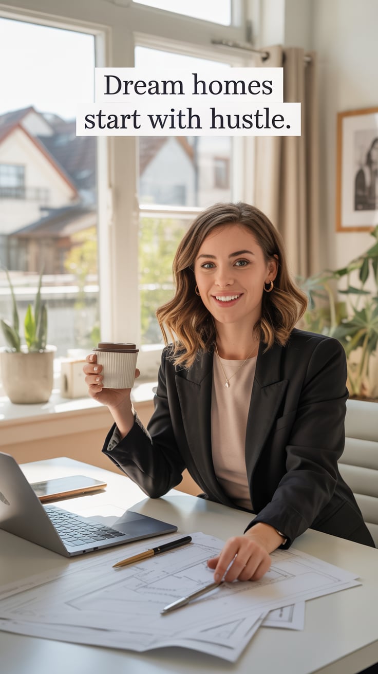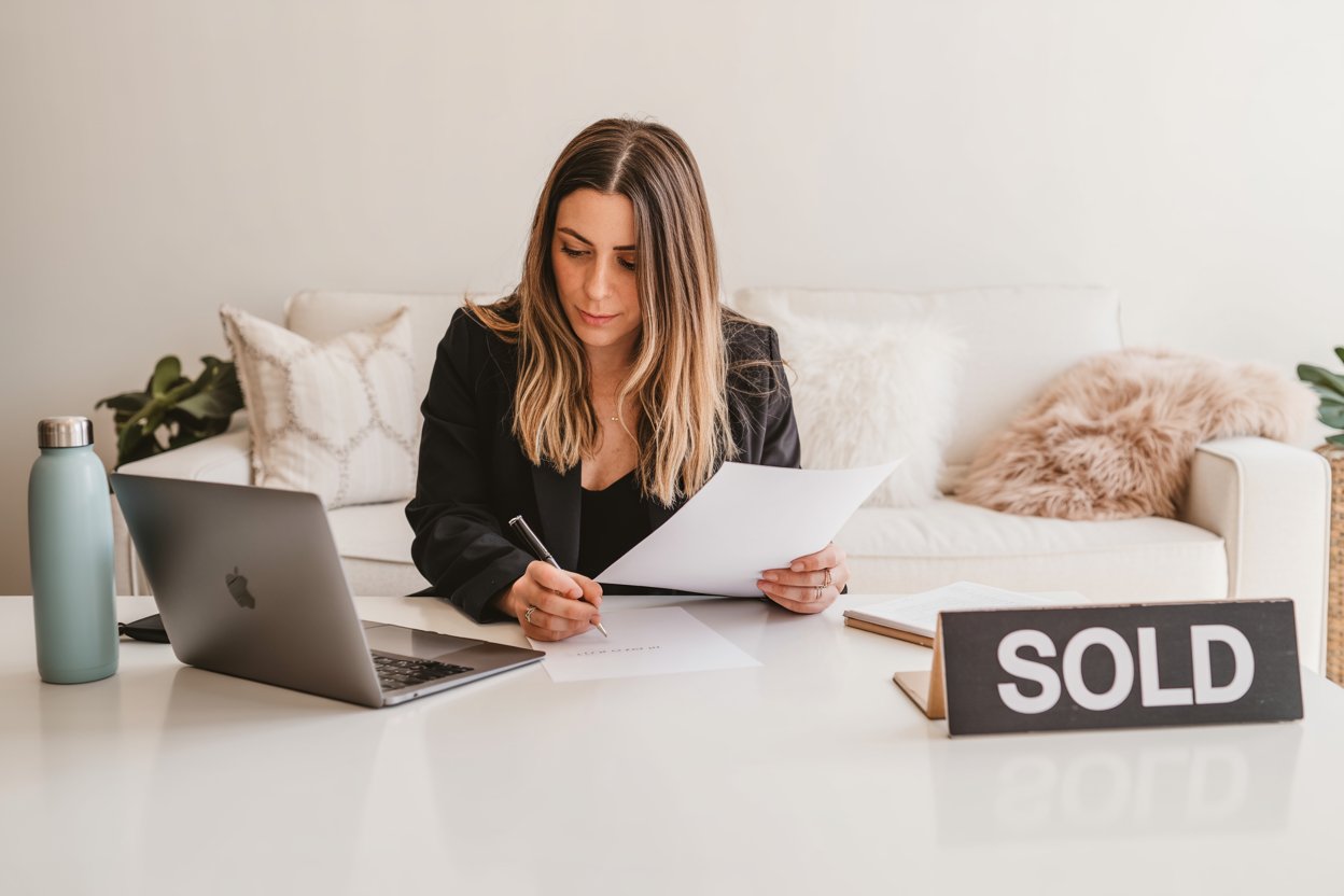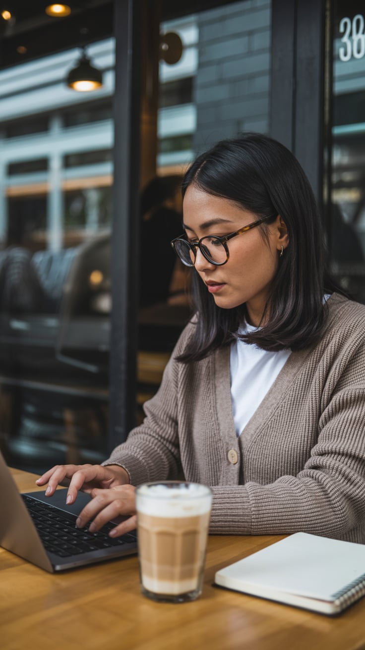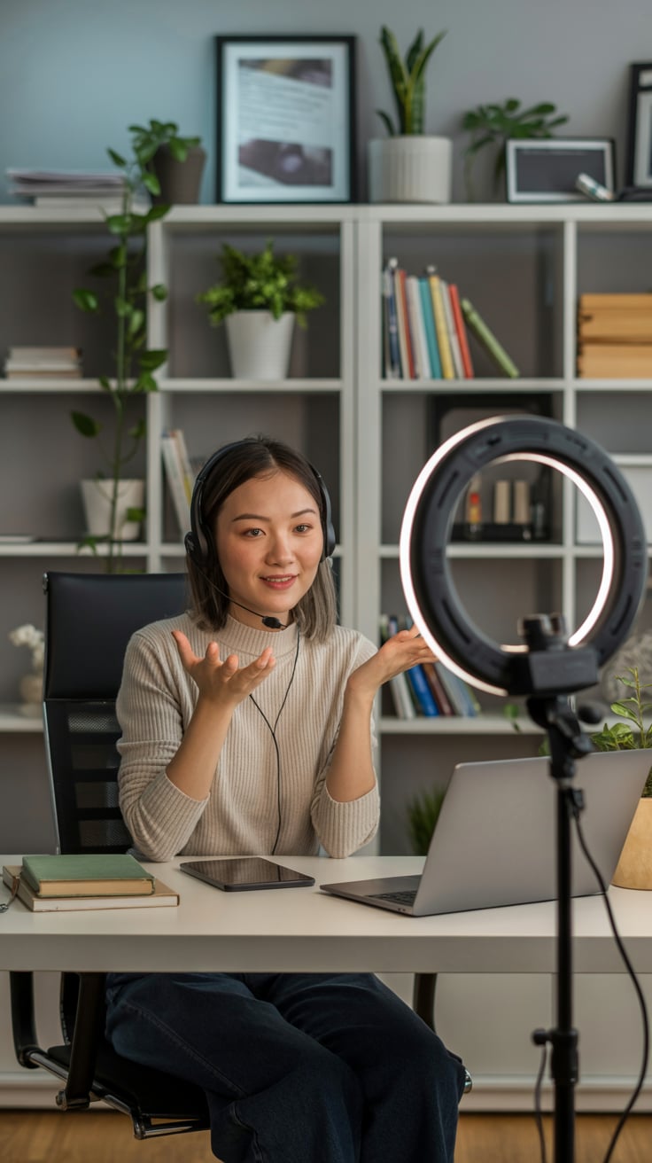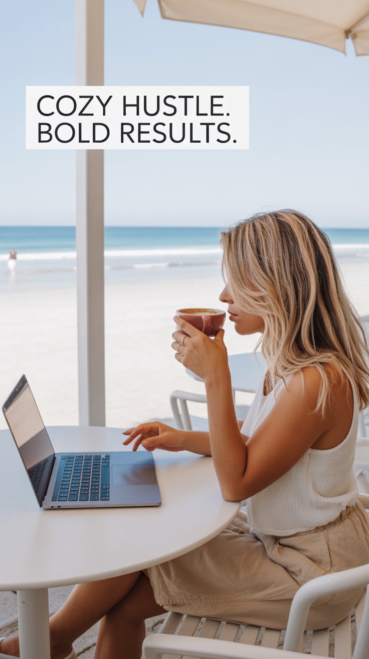A lifestyle portrait in a cozy minimalist home office. A (skin color) (gender/subject) sits at a rus...