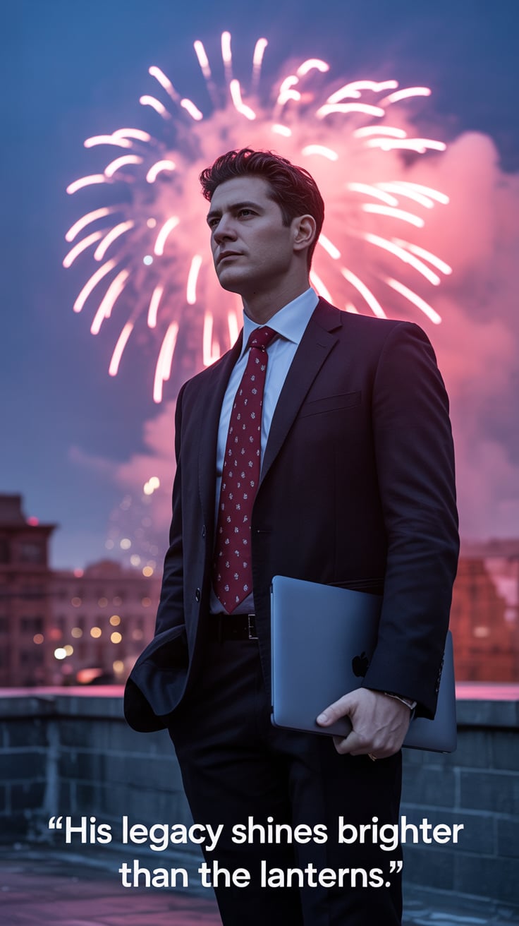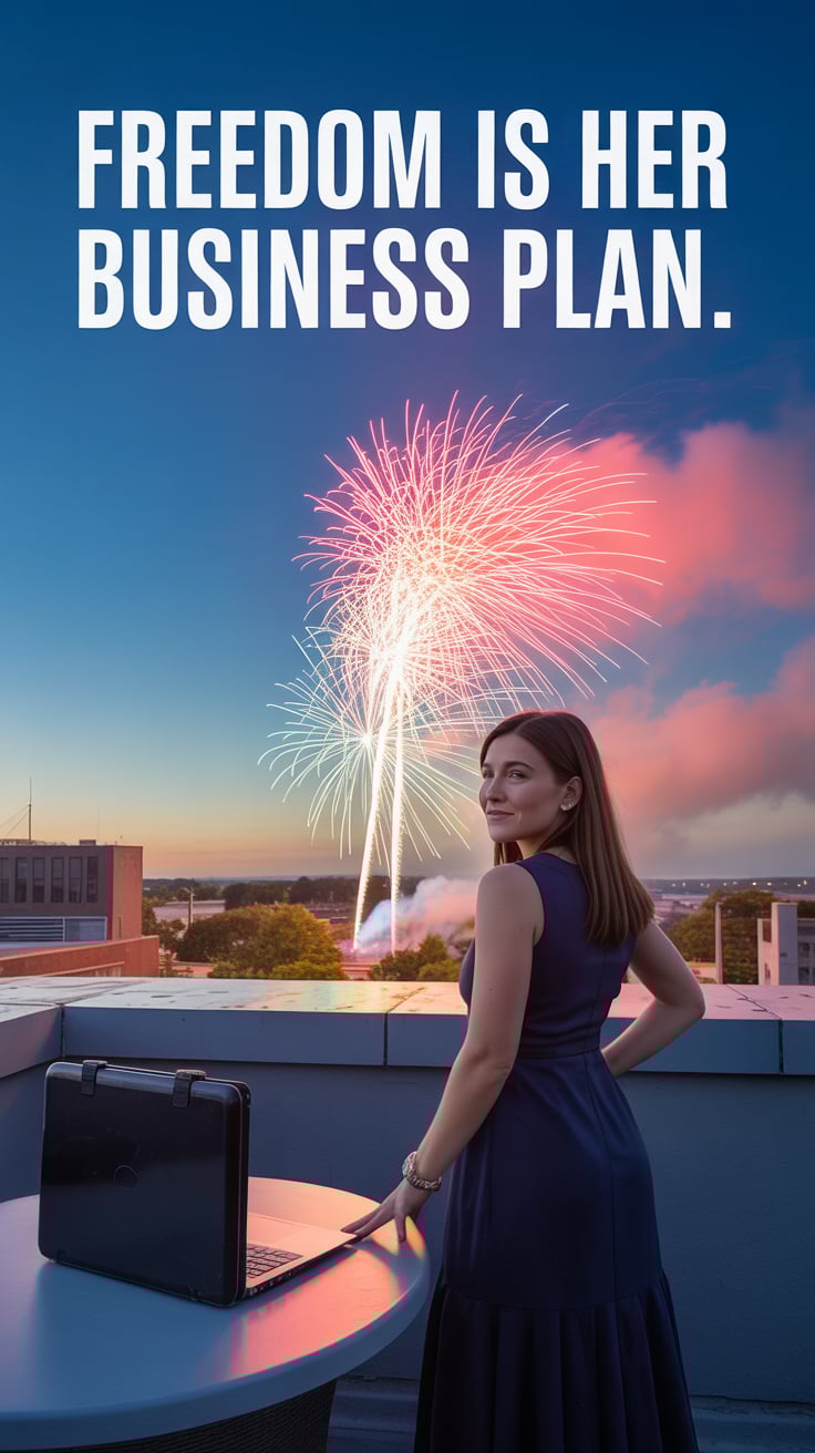 Cinematic rooftop shot of a (skin tone) female in a navy silk dress, holding a laptop case as firewo...