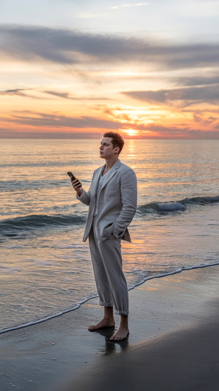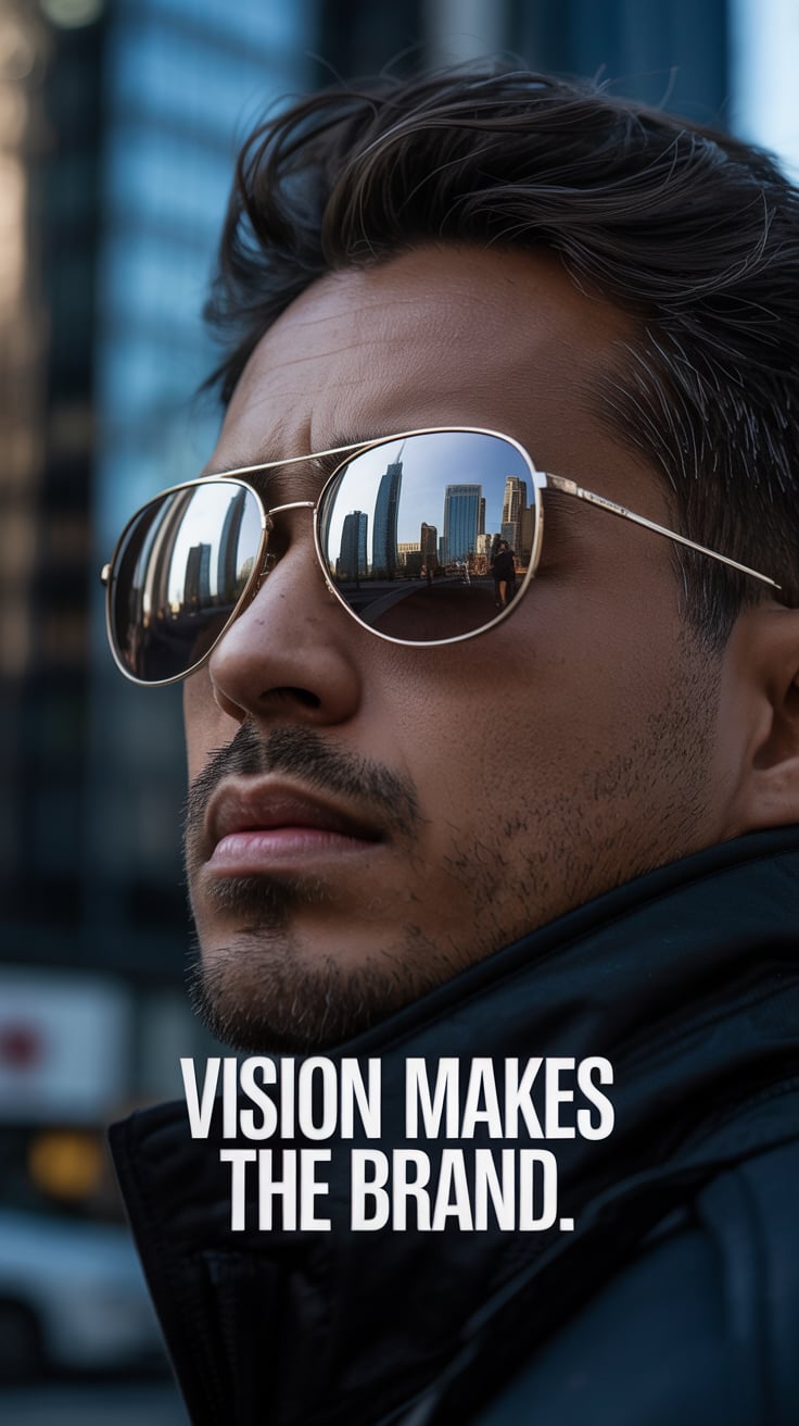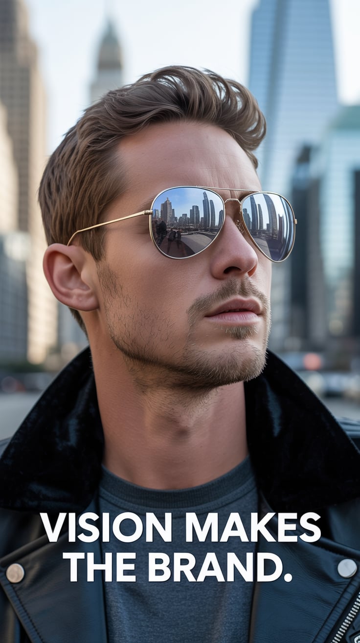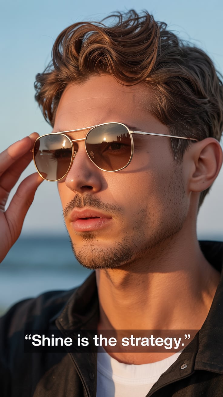 Fashion-inspired close-up of a (skin tone) man in a crisp white shirt, sunglasses reflecting ocean w...