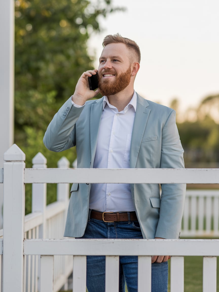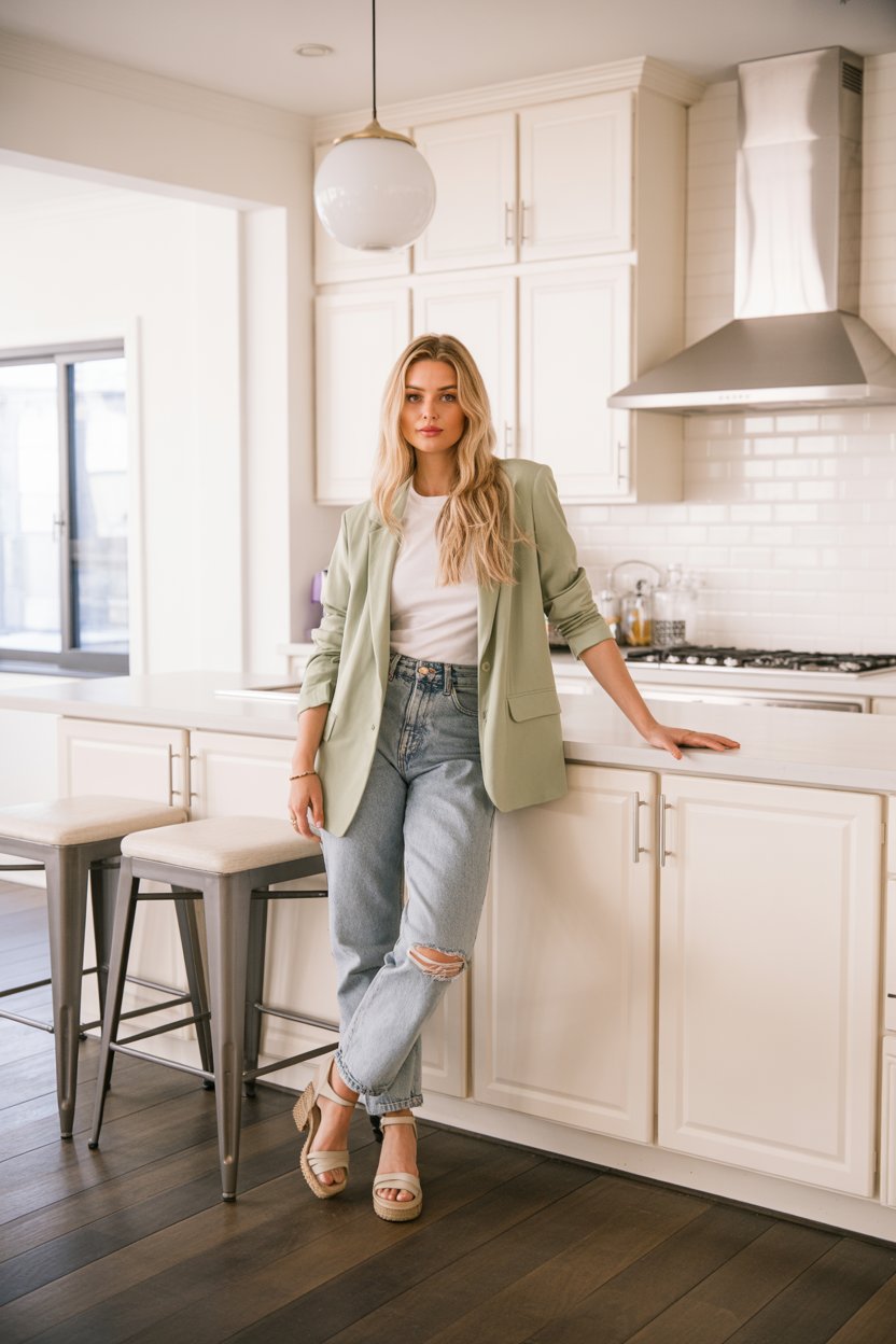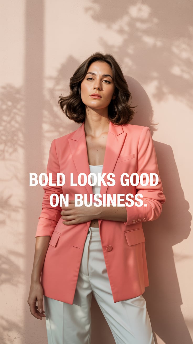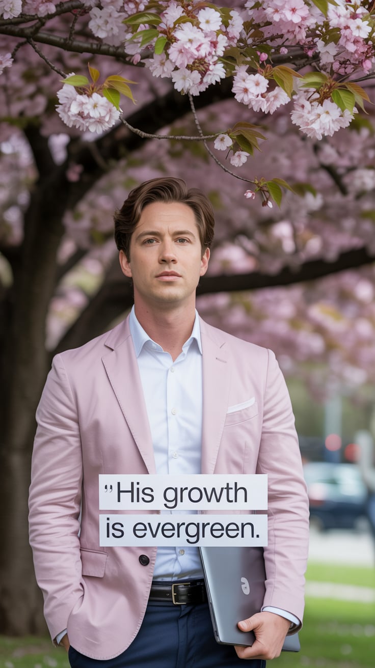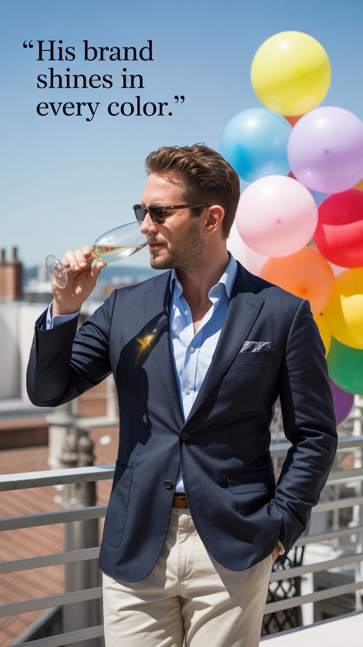 Editorial portrait of a (skin tone) man in a pastel blazer and crisp white shirt, standing under blo...