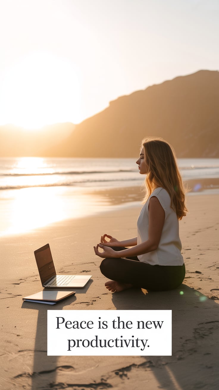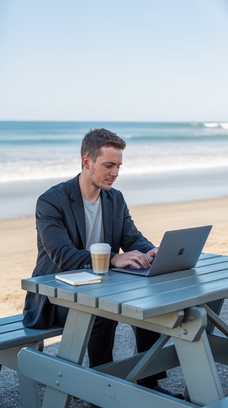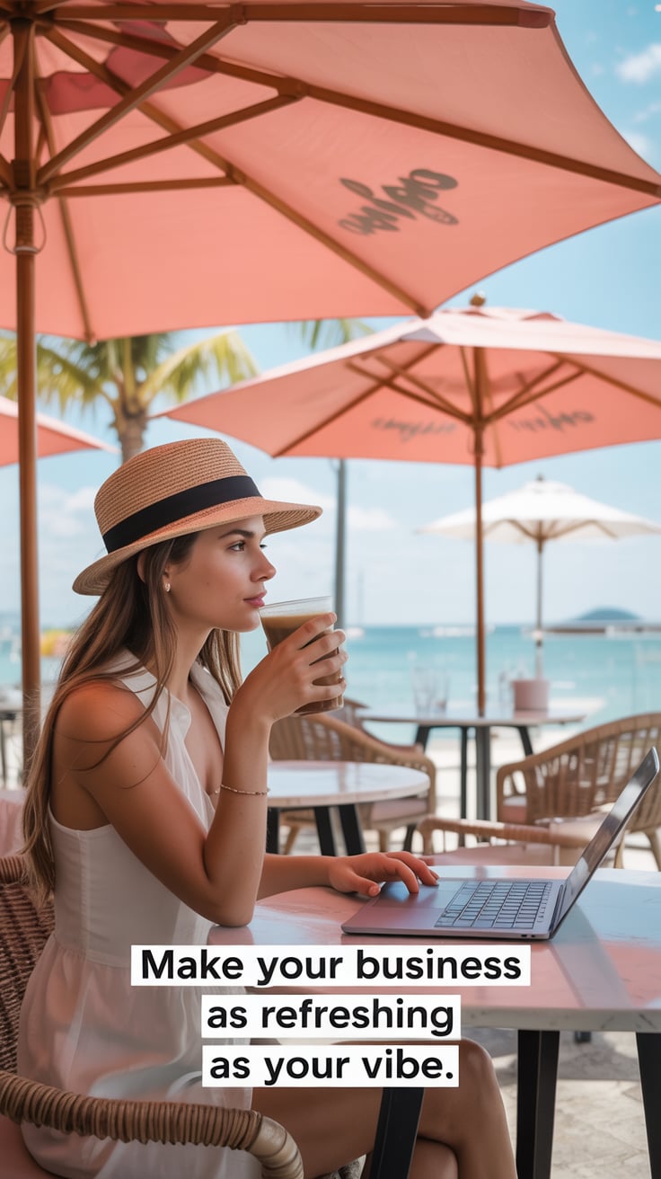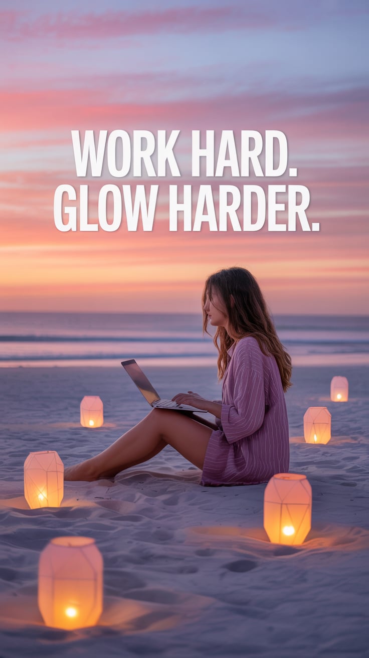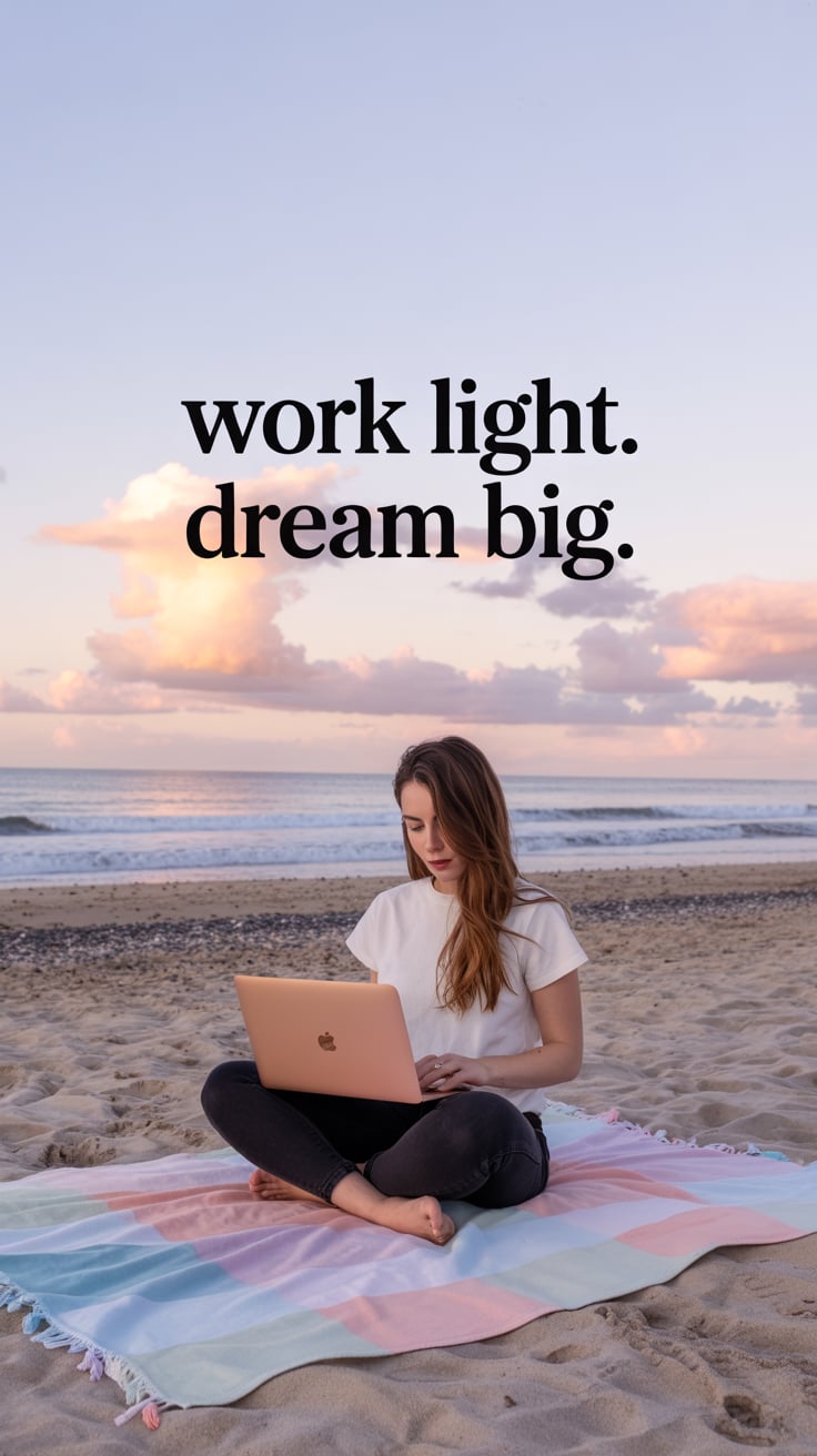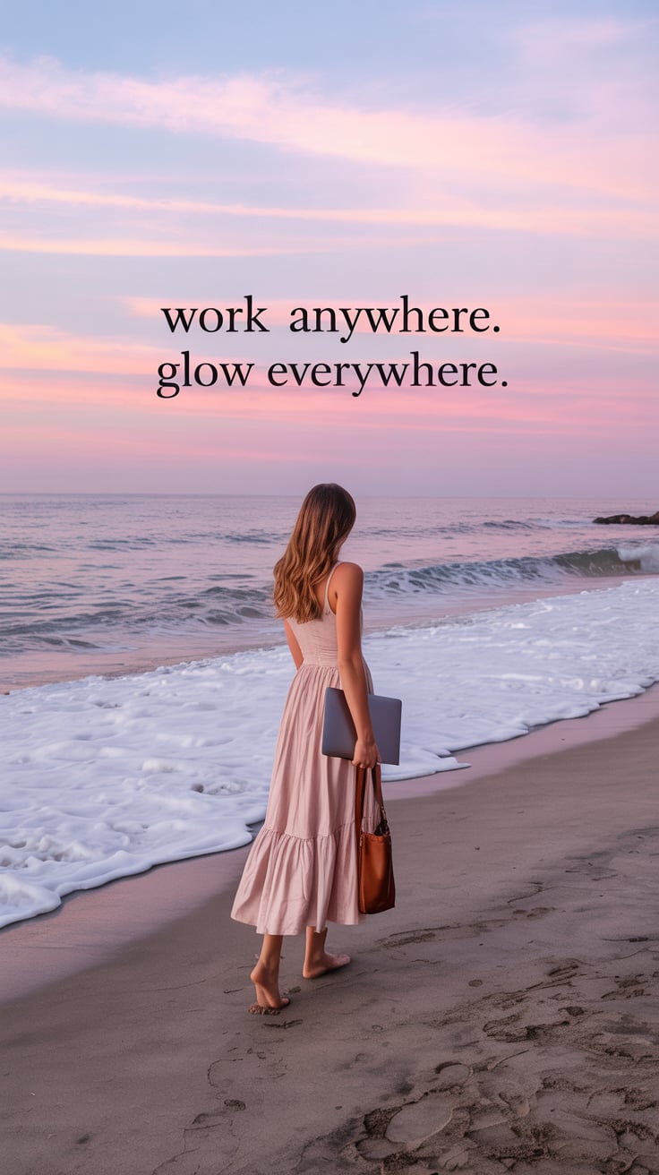 Dreamy beach scene of a (skin tone) woman holding her sandals in one hand and a laptop in the other,...