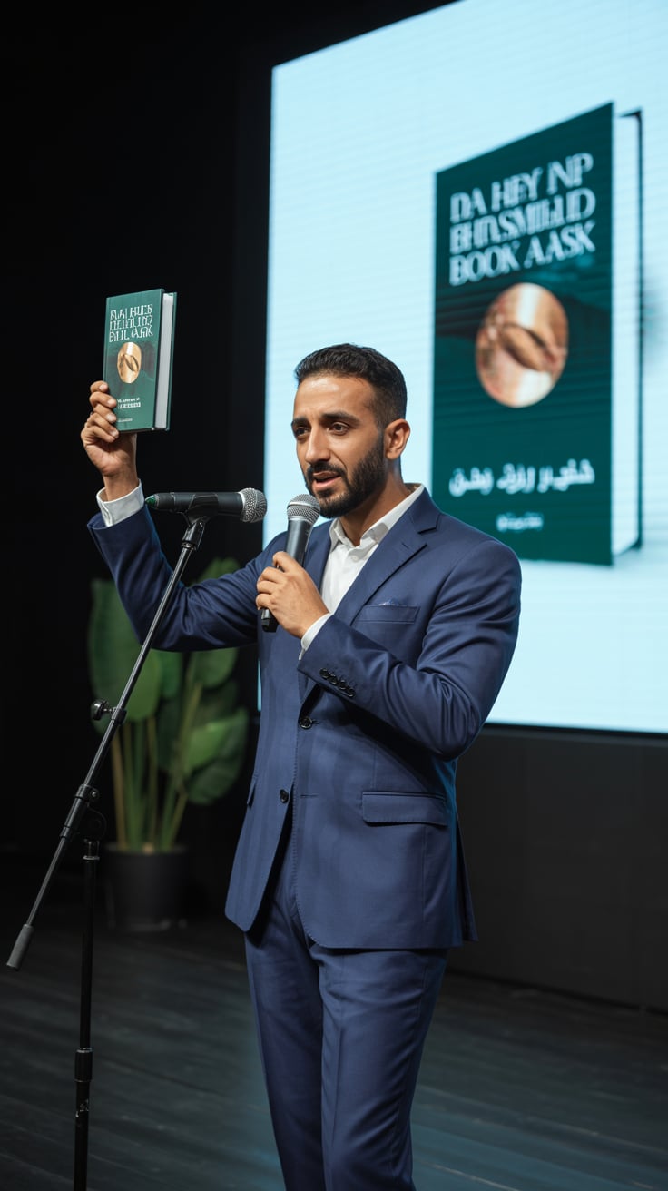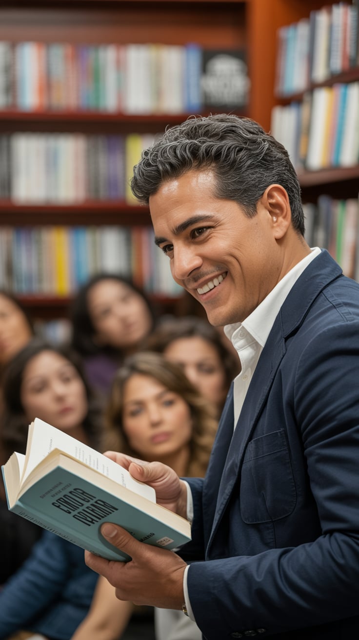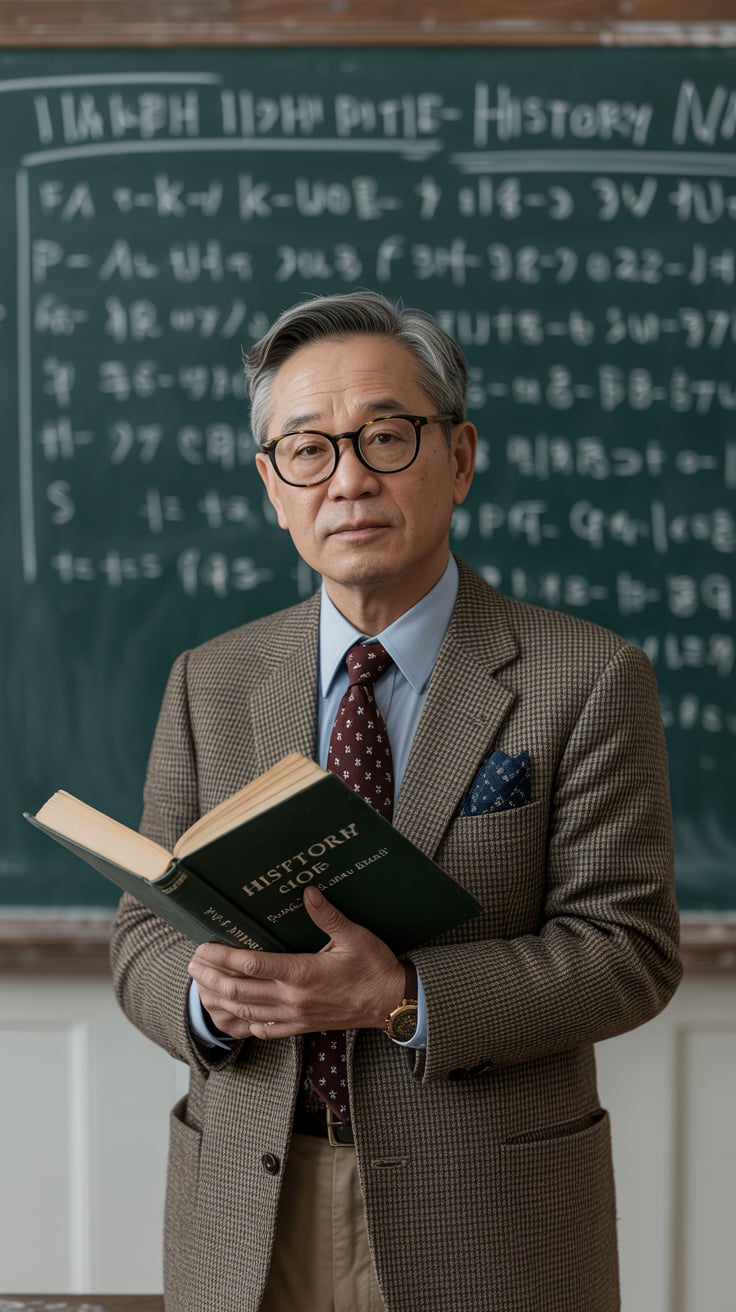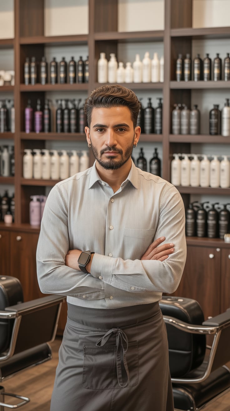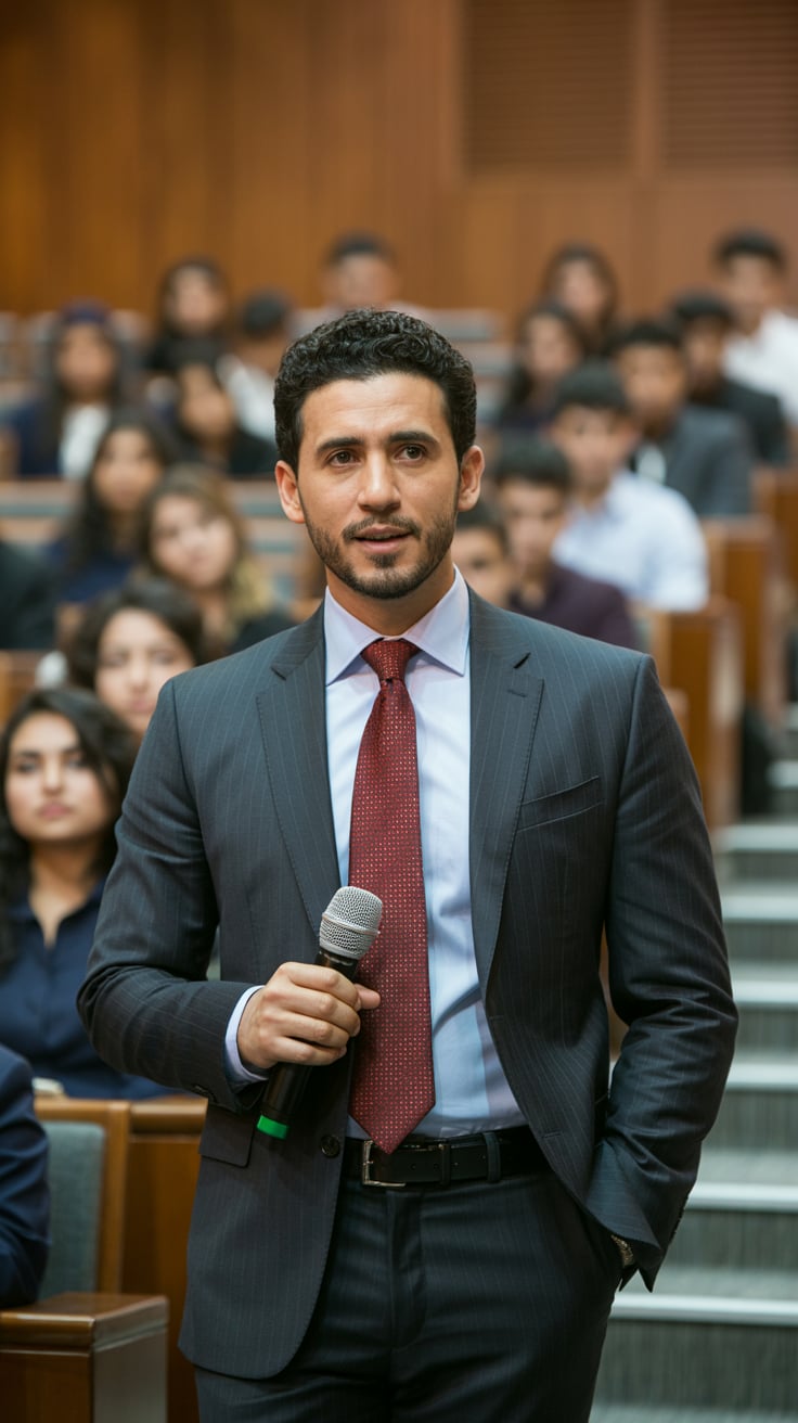 A professional portrait photograph of a (gender/subject) with (hair color: dark) hair and facial stu...