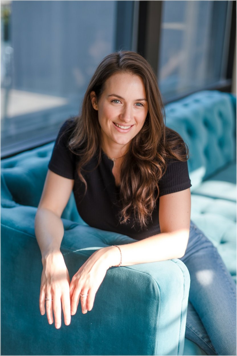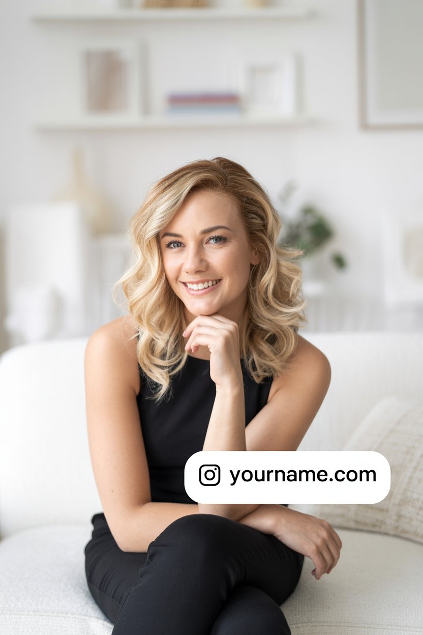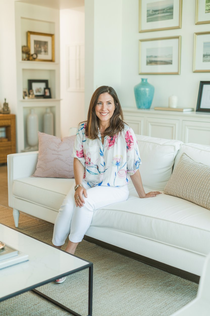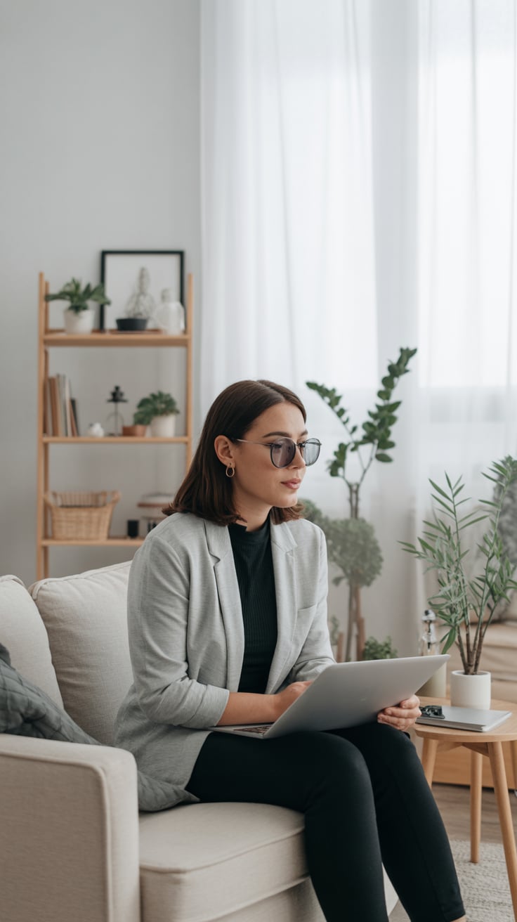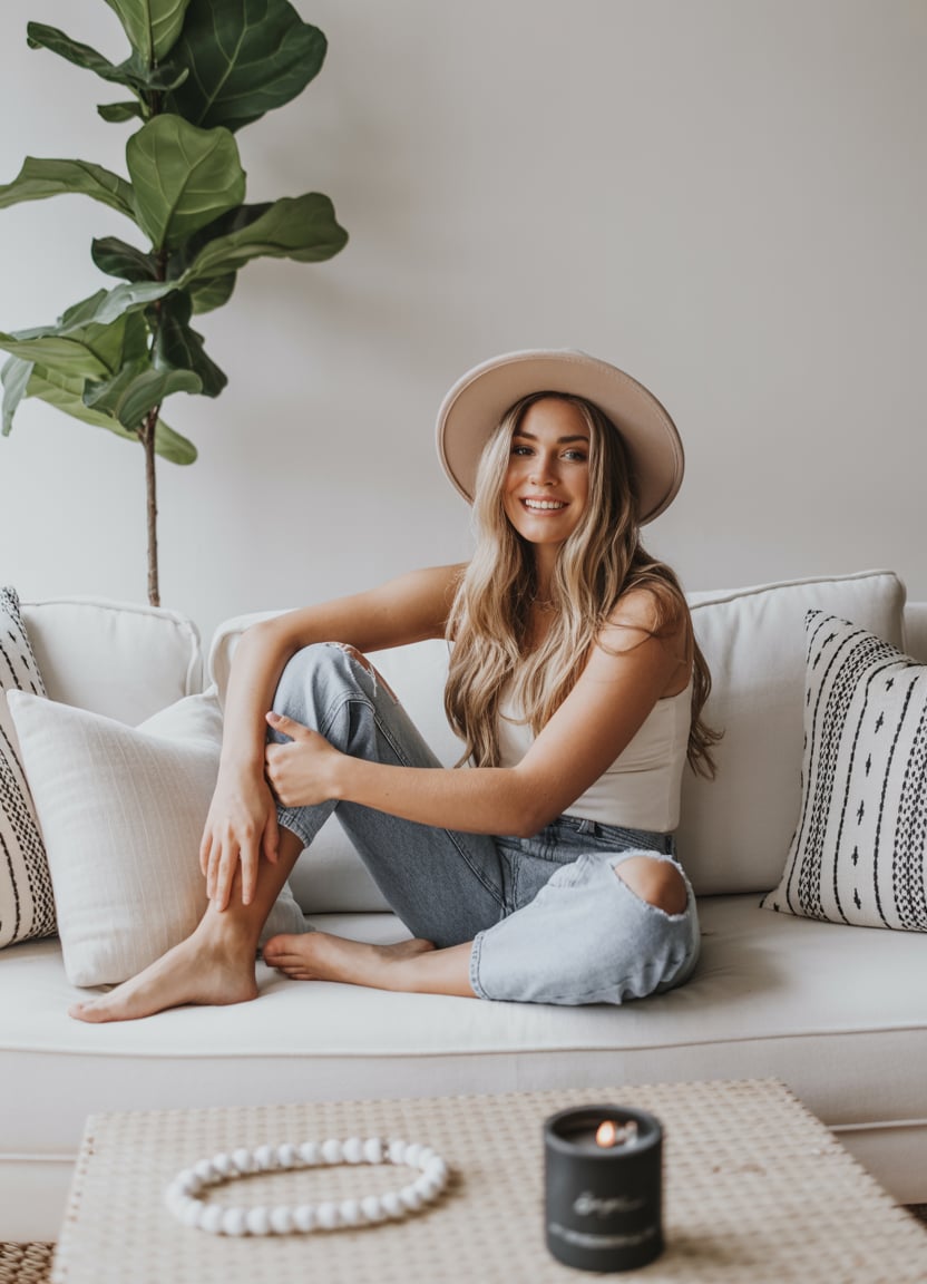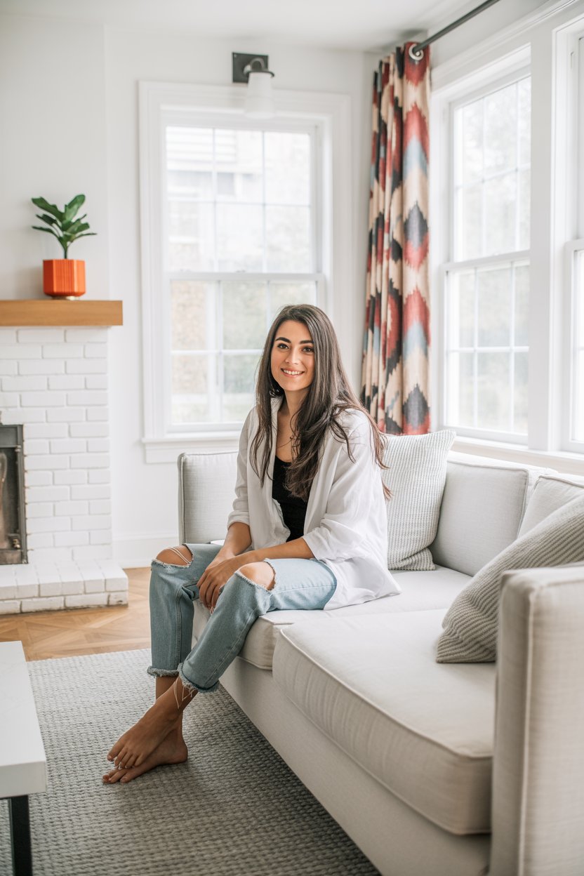 A professional lifestyle photograph of a (skin color) (age range) (gender/subject) sitting casually on a (sofa color) sofa in a (style: modern minimalist / boho / cozy) living room. They are wearing a (outfit: white sweater and blue jeans / floral dress / black blouse), with (hair color), (hair length), (hair style). The subject is (pose: holding a coffee mug / looking at laptop / smiling off to the side). The lighting is (soft and natural / bright and airy / dramatic studio). Ultra-realistic, sharp focus, 4k photography.