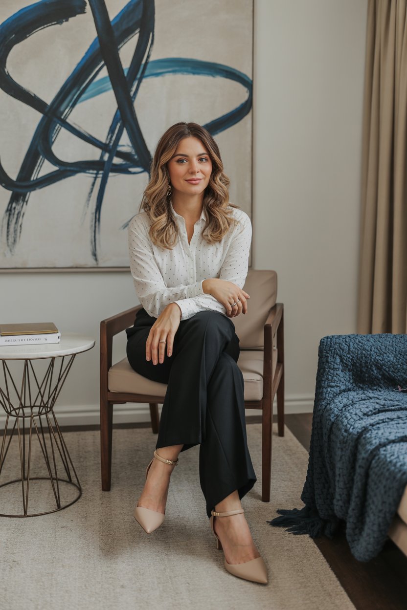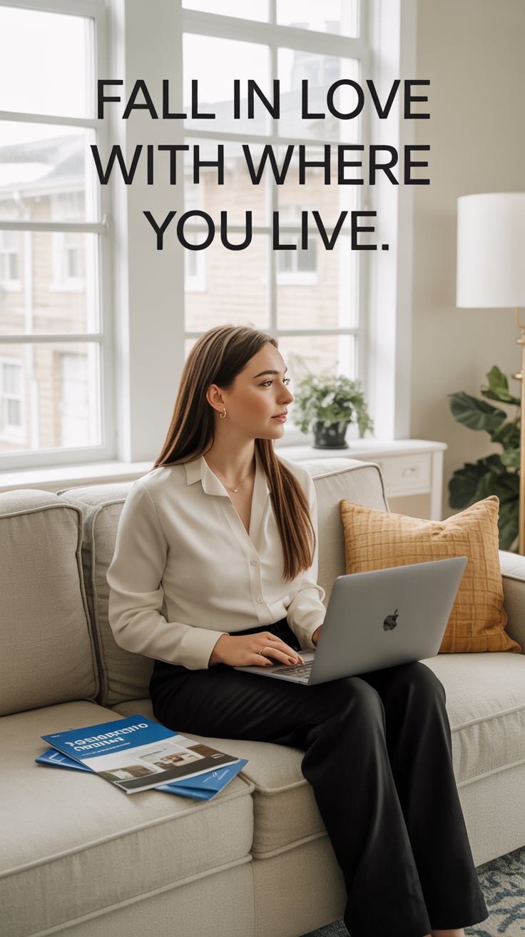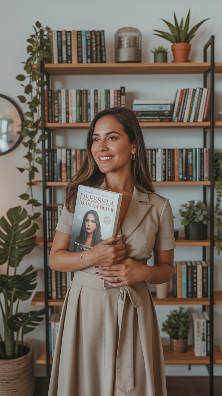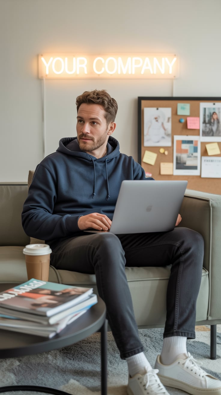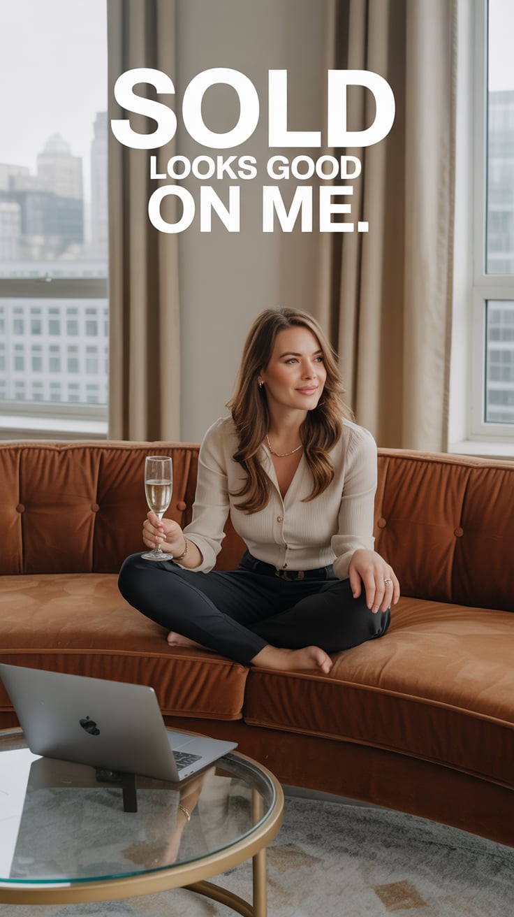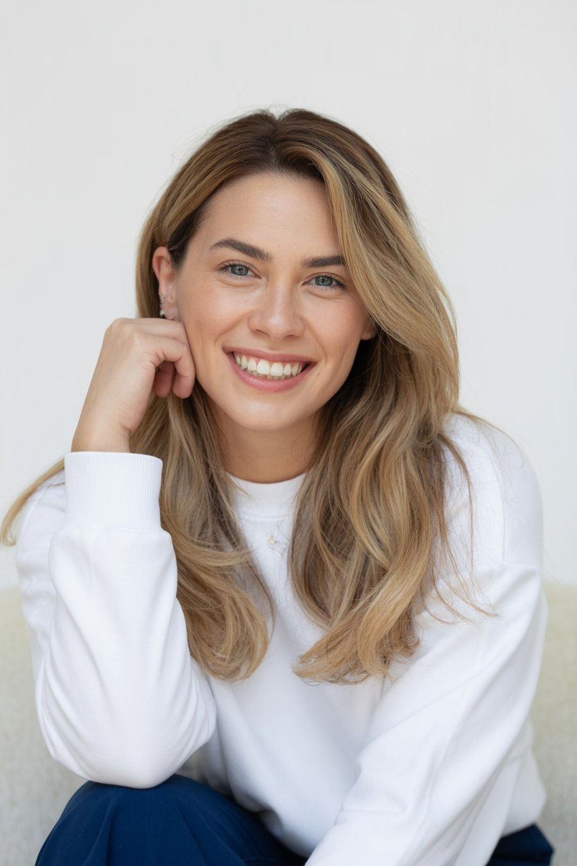 A professional lifestyle photograph of a (skin color) (age range) (gender/subject) sitting casually on a (sofa color) sofa in a (style: modern minimalist / boho / cozy) living room. They are wearing a (outfit: white sweater and blue jeans / floral dress / black blouse), with (hair color), (hair length), (hair style). The subject is (pose: holding a coffee mug / looking at laptop / smiling off to the side). The lighting is (soft and natural / bright and airy / dramatic studio). Ultra-realistic, sharp focus, 4k photography.