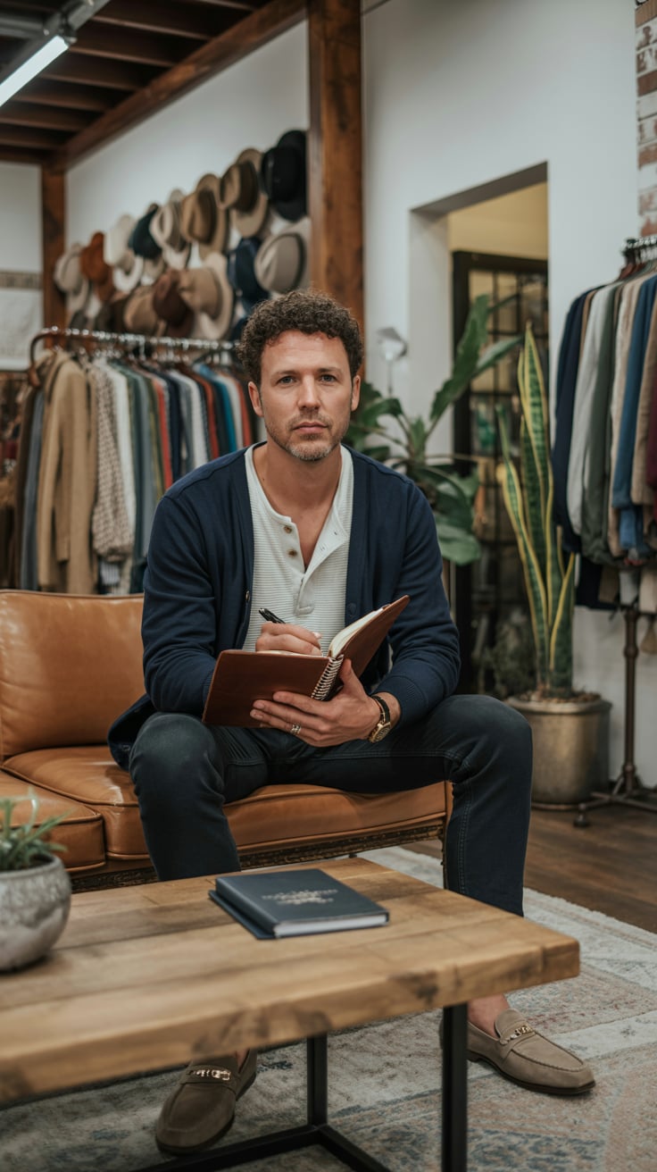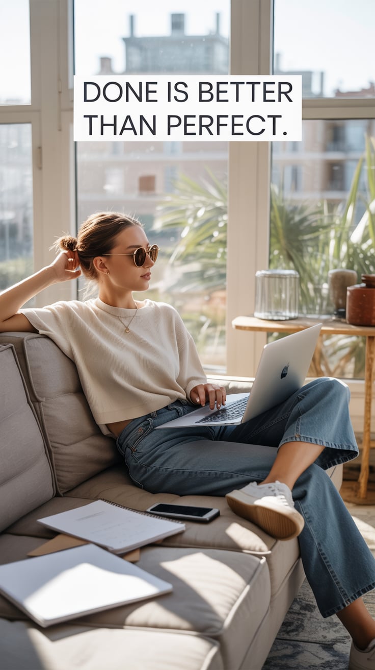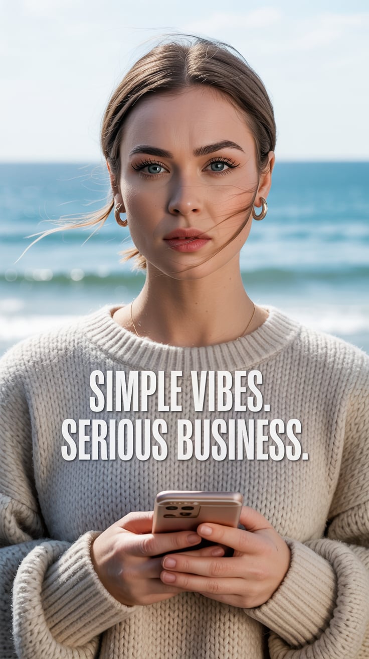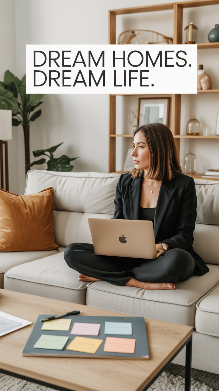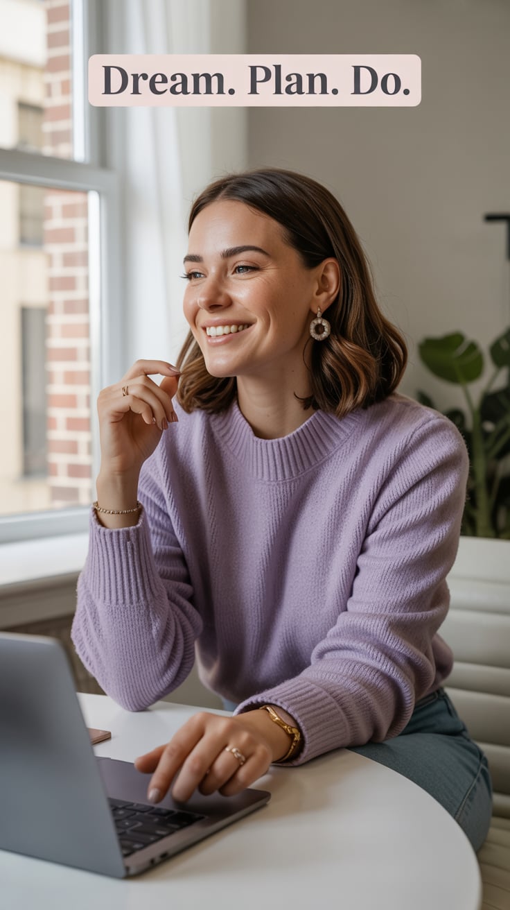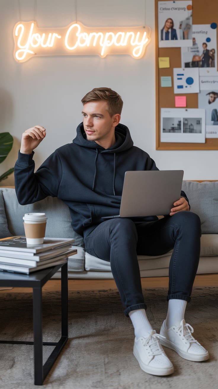 A professional lifestyle photograph of a (skin color) (age range) (gender/subject) sitting casually on a (sofa color) sofa in a (style: modern minimalist / boho / cozy) living room. They are wearing a (outfit: white sweater and blue jeans / floral dress / black blouse), with (hair color), (hair length), (hair style). The subject is (pose: holding a coffee mug / looking at laptop / smiling off to the side). The lighting is (soft and natural / bright and airy / dramatic studio). Ultra-realistic, sharp focus, 4k photography.