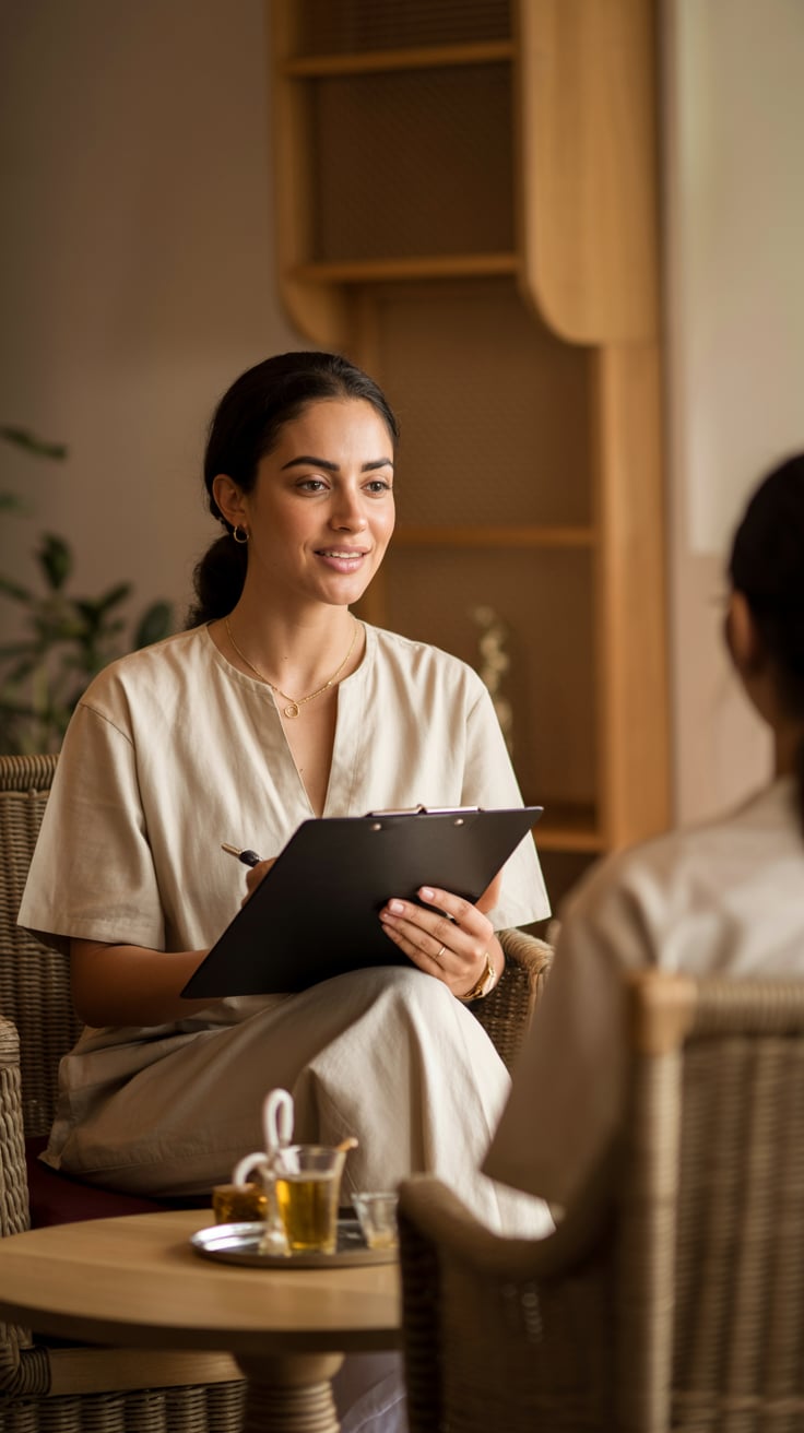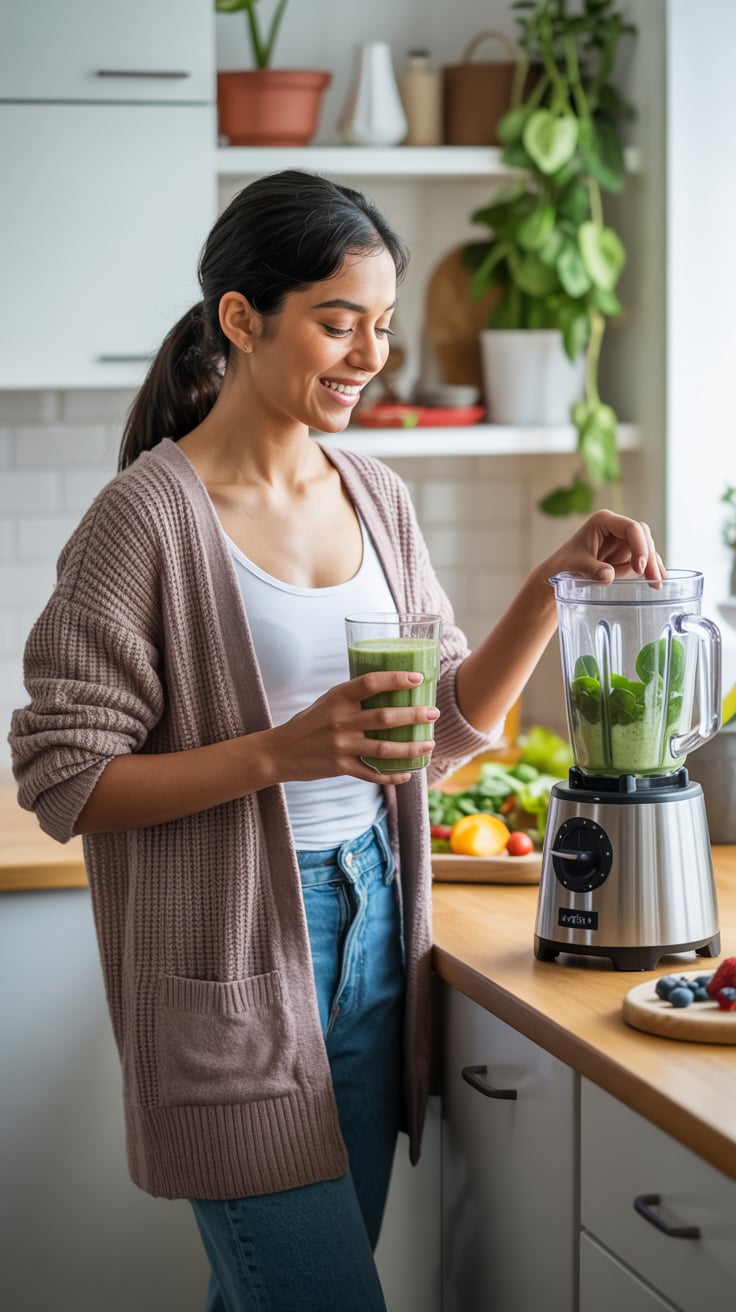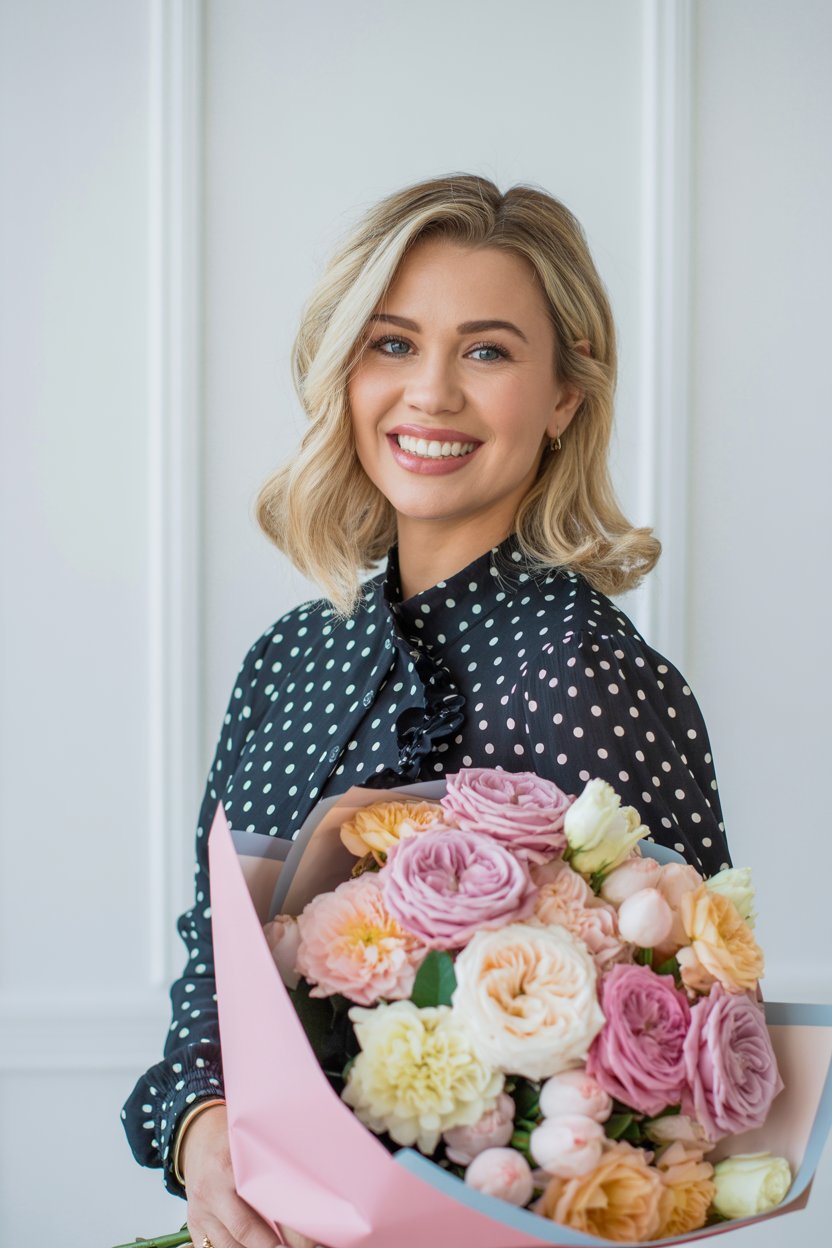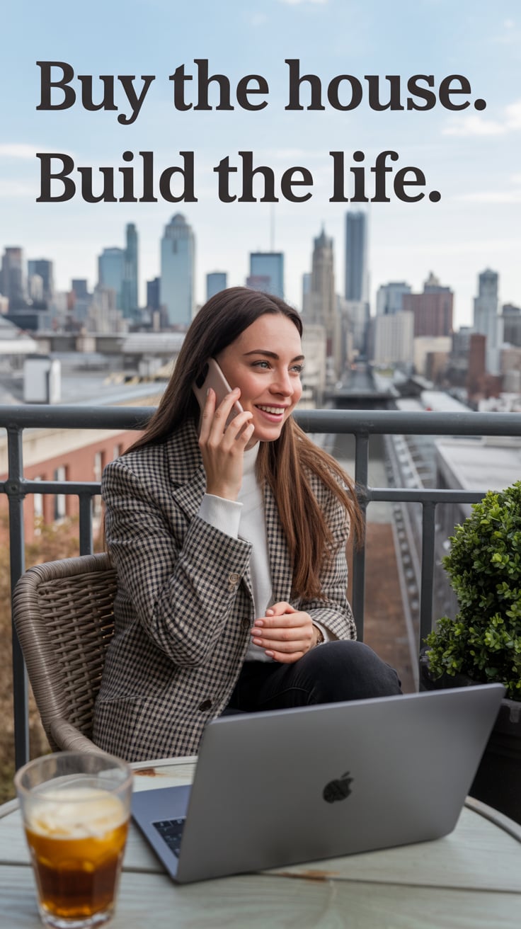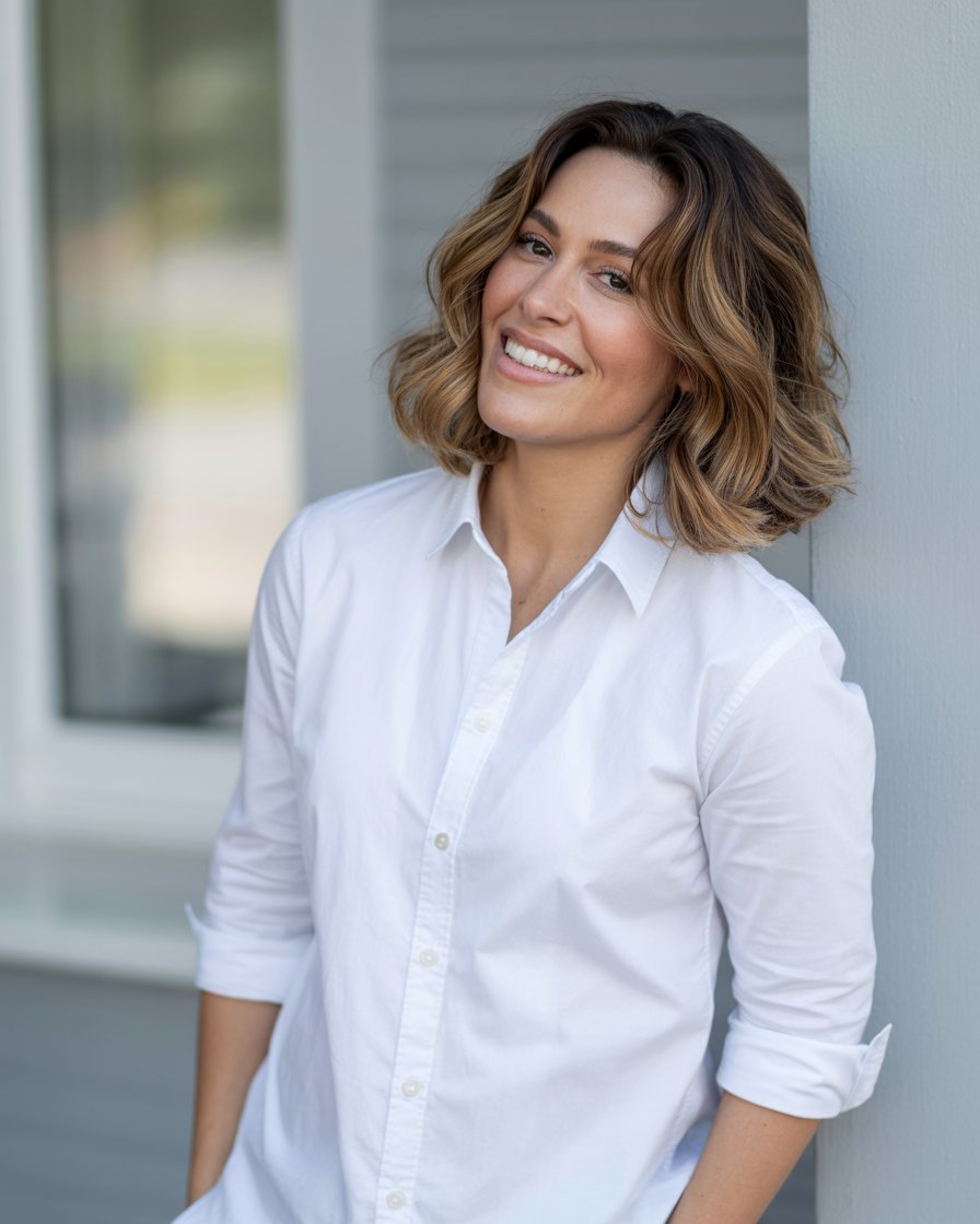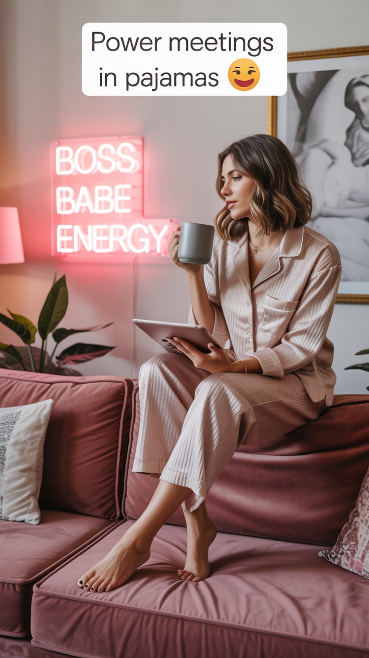 A professional lifestyle photograph of a (skin color) (age range) (gender/subject) sitting casually on a (sofa color) sofa in a (style: modern minimalist / boho / cozy) living room. They are wearing a (outfit: white sweater and blue jeans / floral dress / black blouse), with (hair color), (hair length), (hair style). The subject is (pose: holding a coffee mug / looking at laptop / smiling off to the side). The lighting is (soft and natural / bright and airy / dramatic studio). Ultra-realistic, sharp focus, 4k photography.