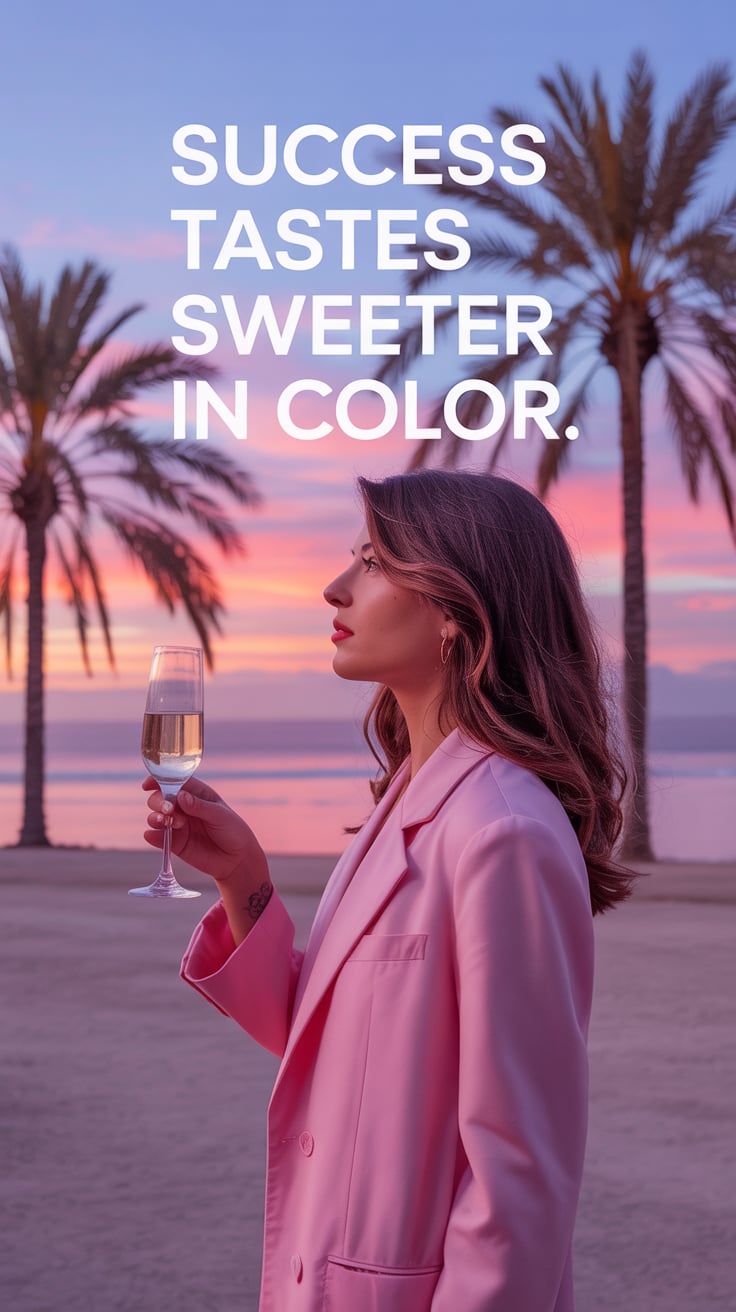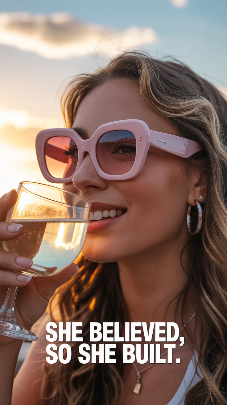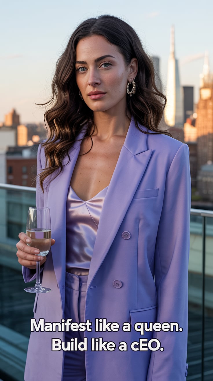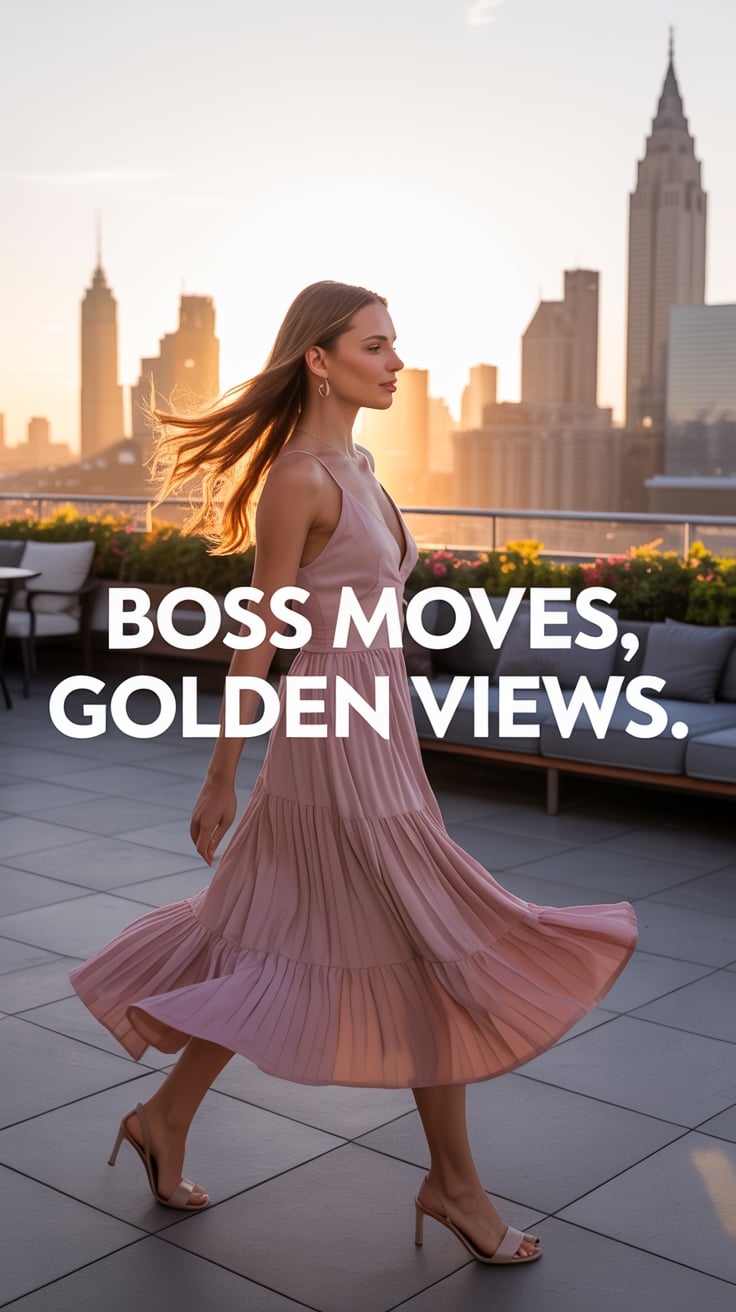Cinematic rooftop shot of a (skin tone) female in a pink blazer dress, sipping champagne as the city...