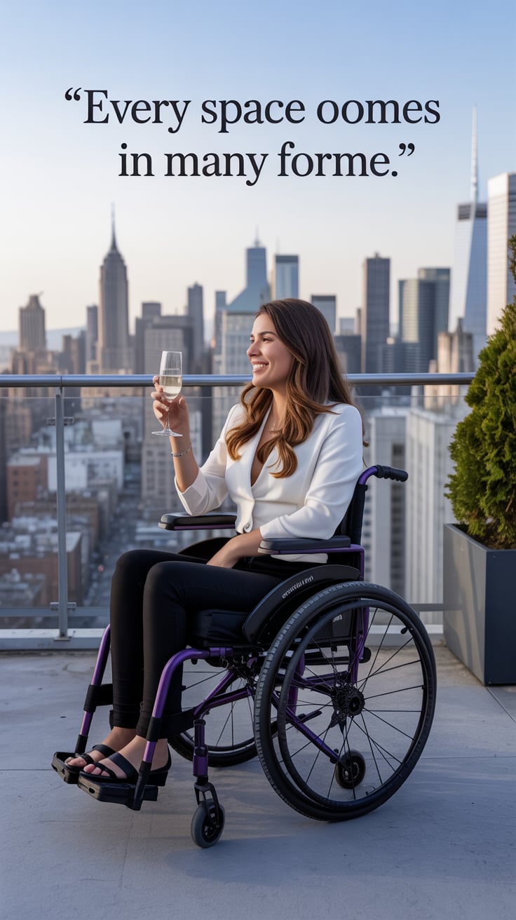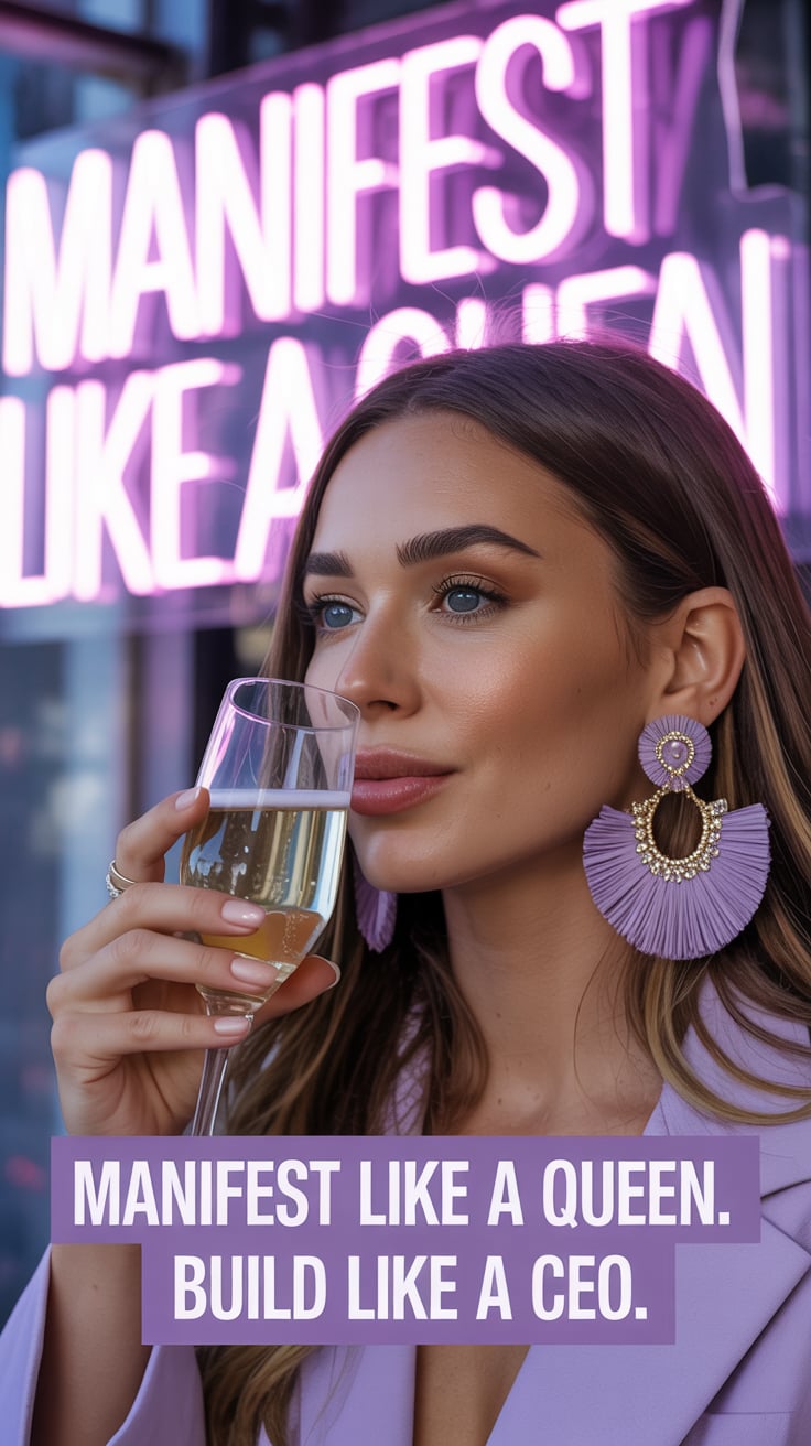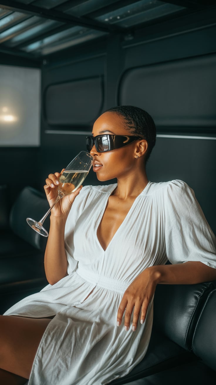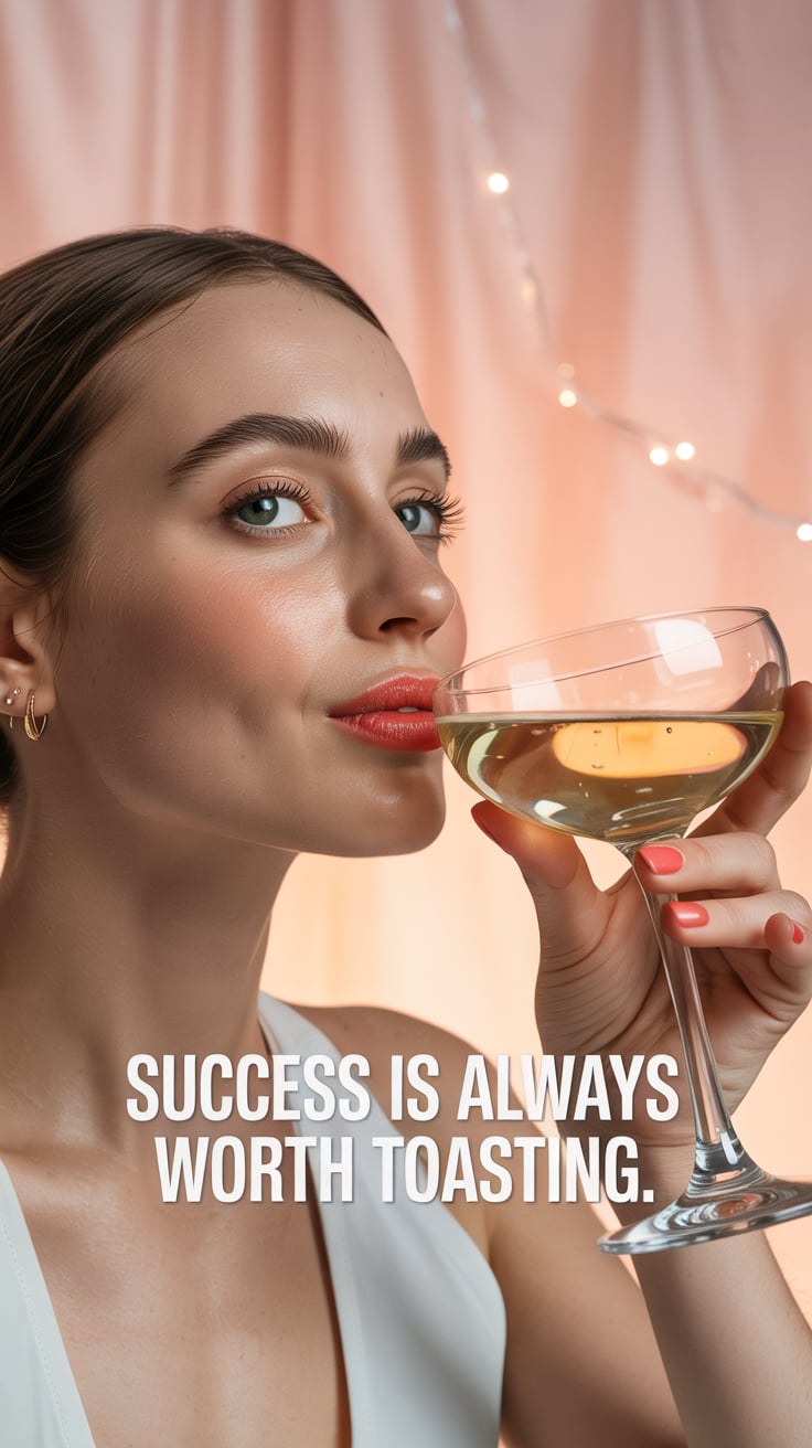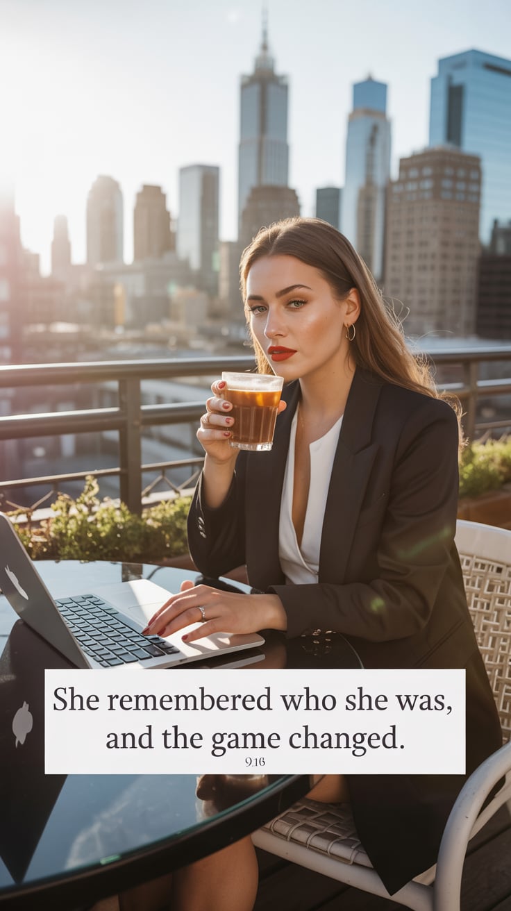 Cinematic rooftop shot of a (skin tone) female in a pink blazer dress, sipping champagne as the city...
