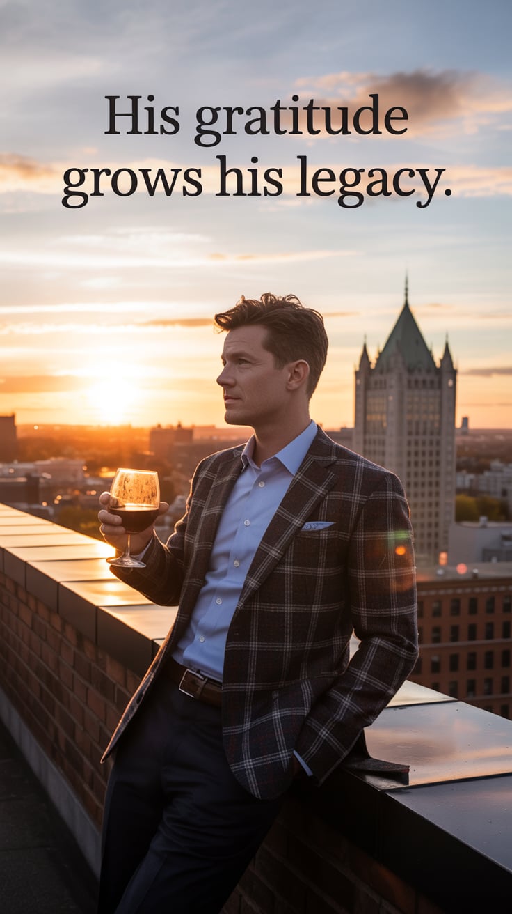 Cinematic rooftop shot of a (skin tone) male in a plaid blazer, holding a glass of wine with a golde...
