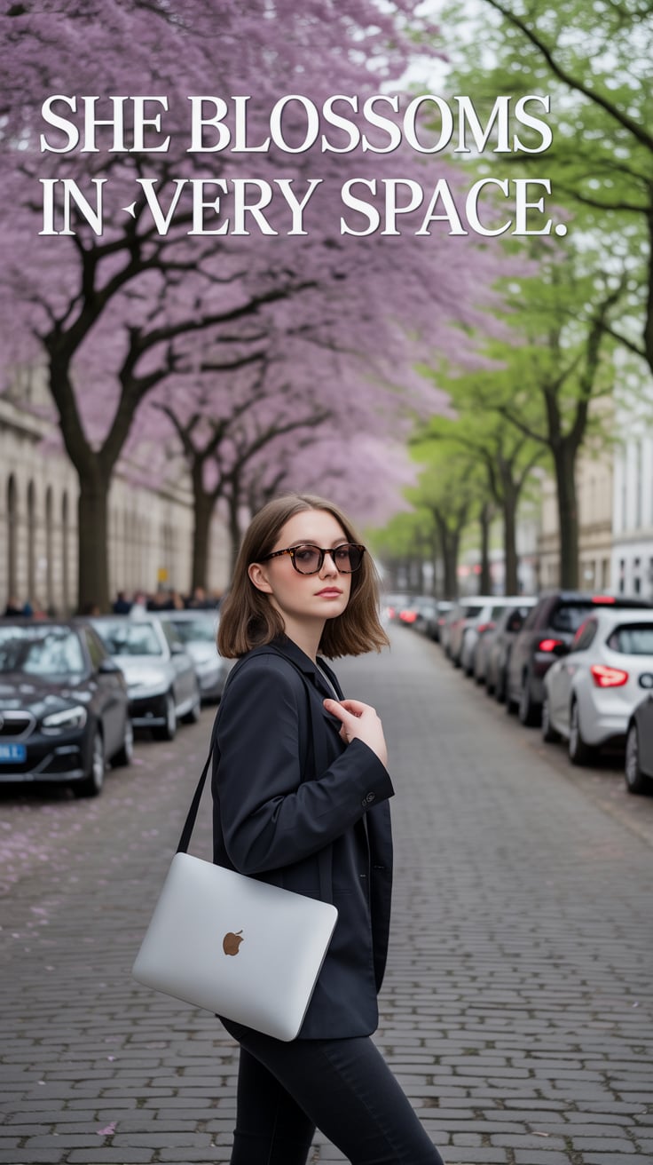 Editorial portrait of a (skin tone) woman standing on a cobblestone street lined with blooming trees...
