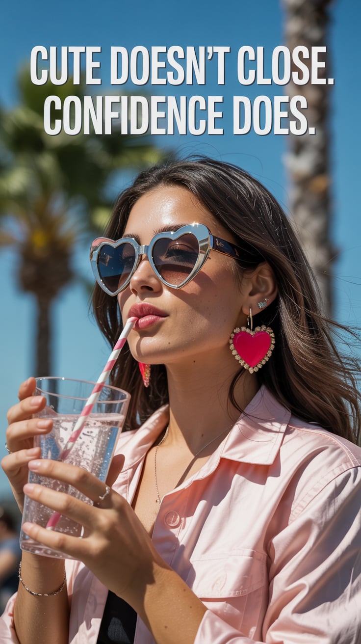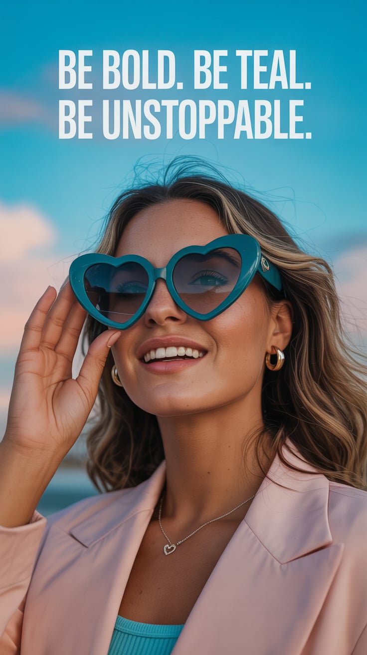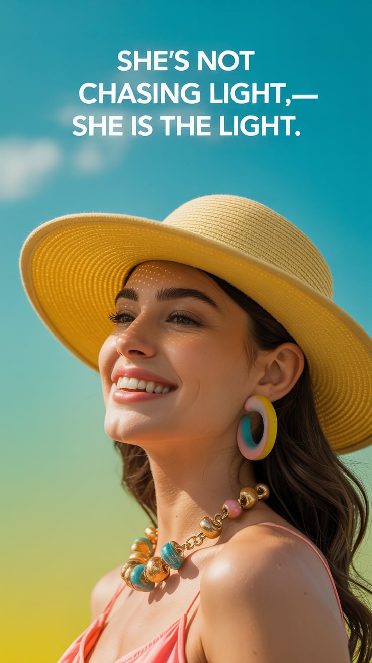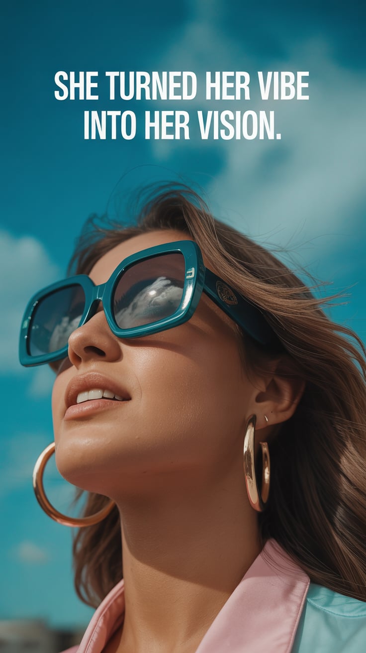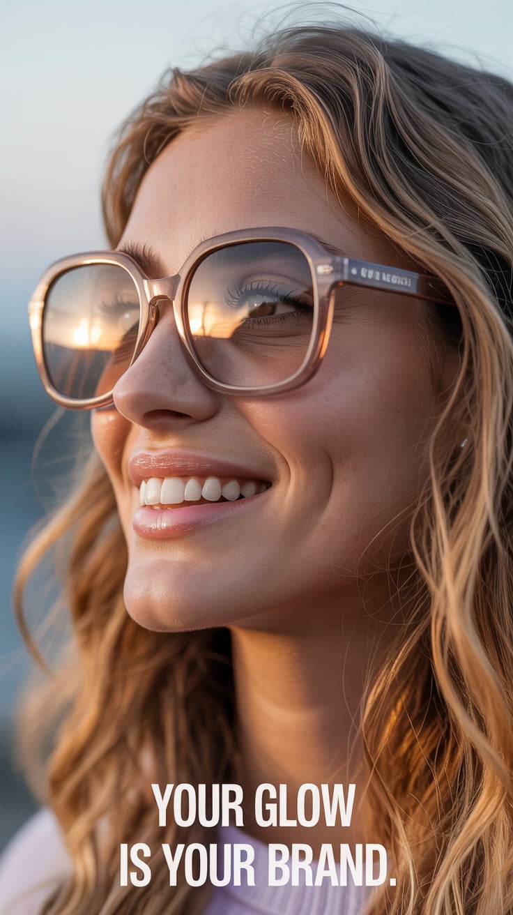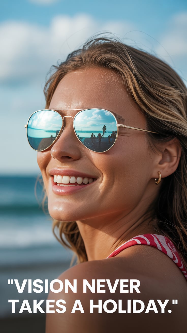Editorial close-up of a (skin tone) woman in mirrored aviators reflecting the beach, smiling confide...