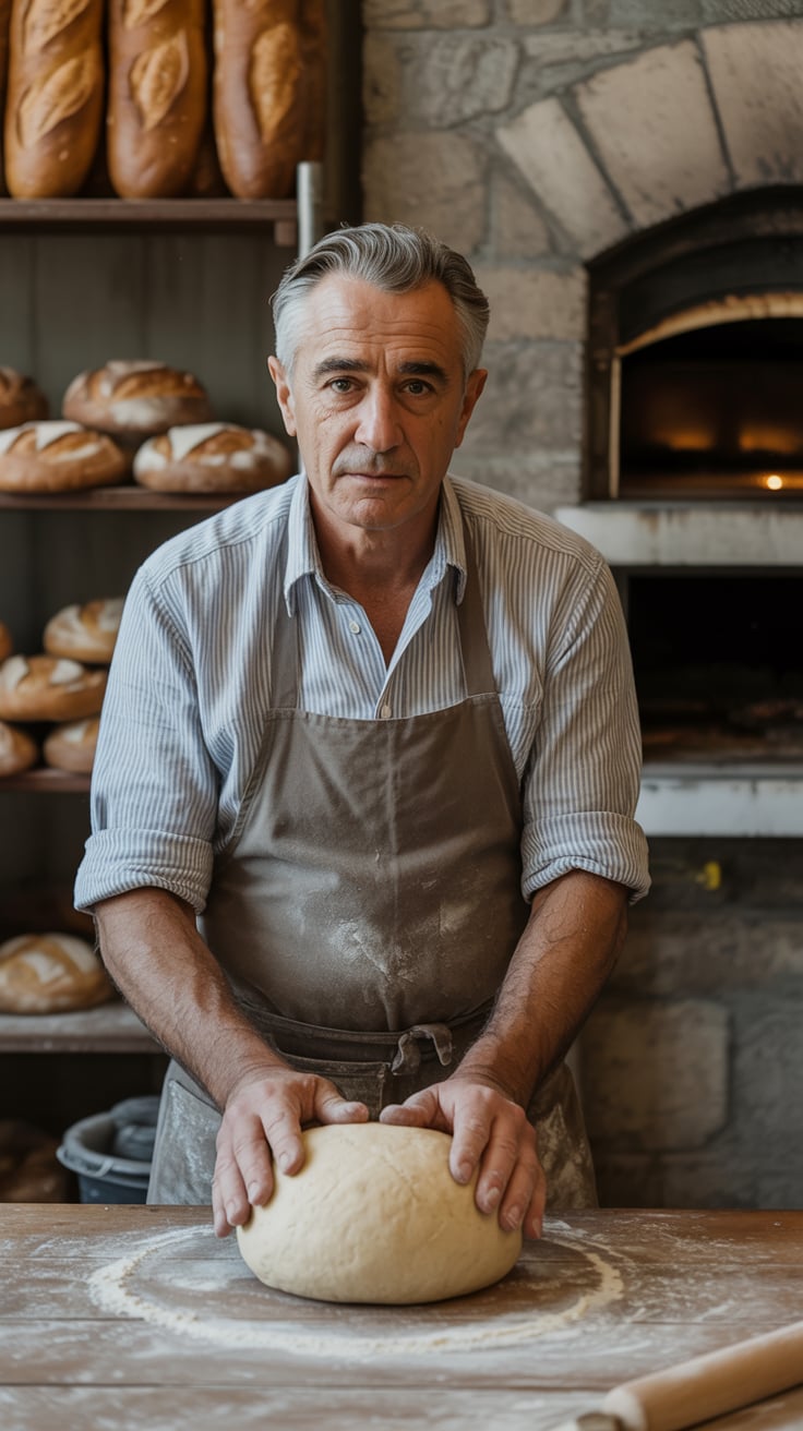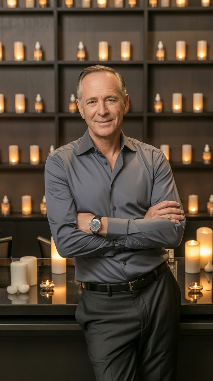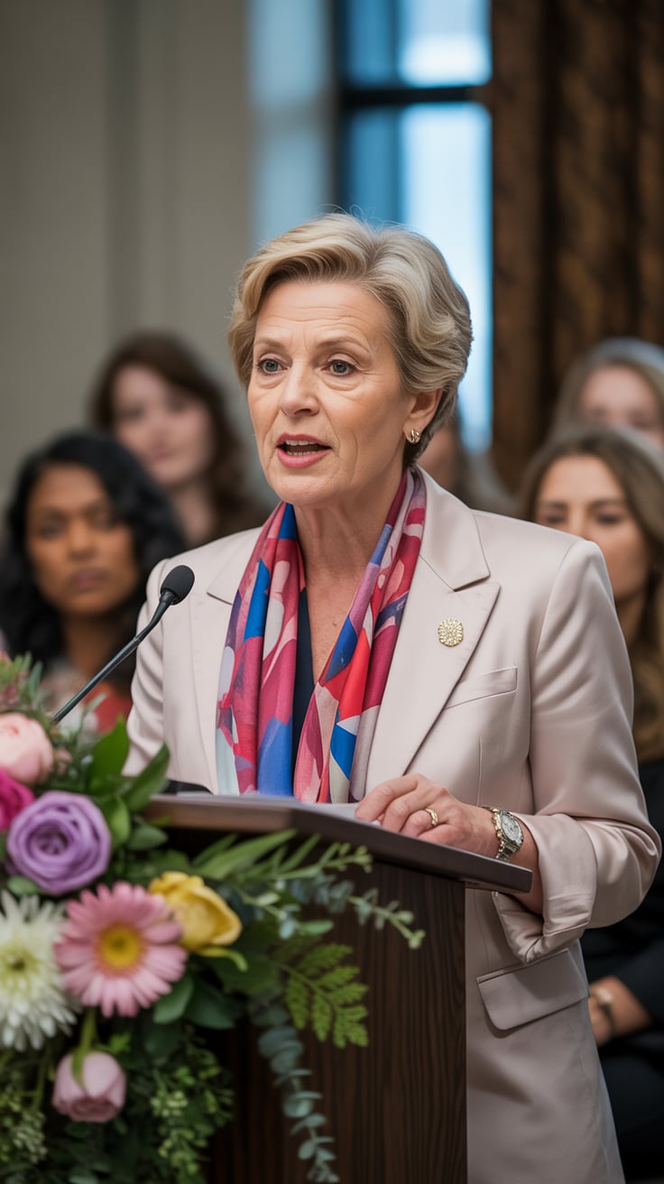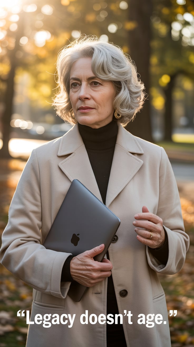 A professional headshot of a (age group) (man/woman/person) with (hair: styled silver-gray) and (fac...