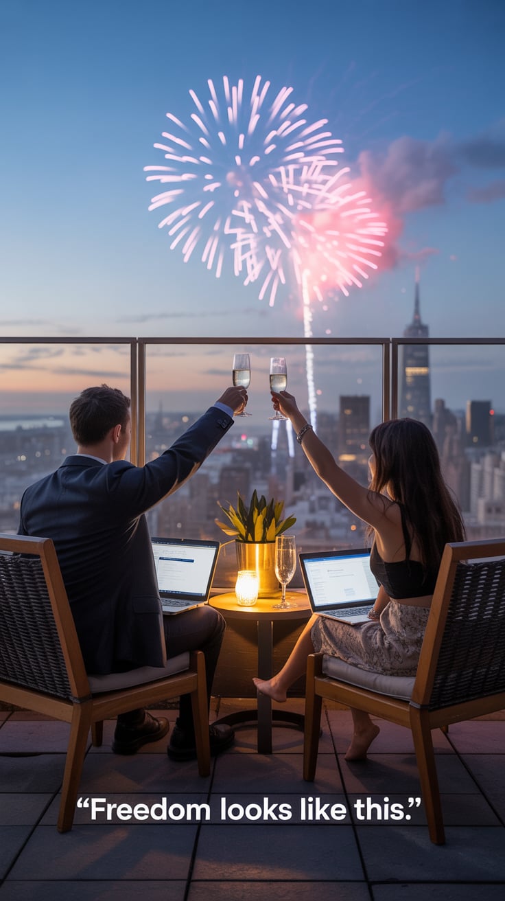 Dreamy lifestyle shot of a couple on a rooftop terrace, laptops closed, champagne glasses raised as ...