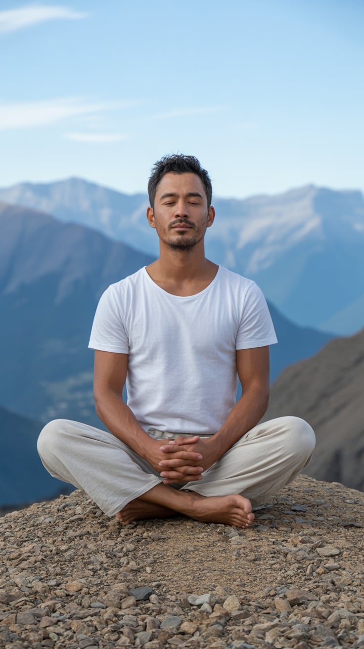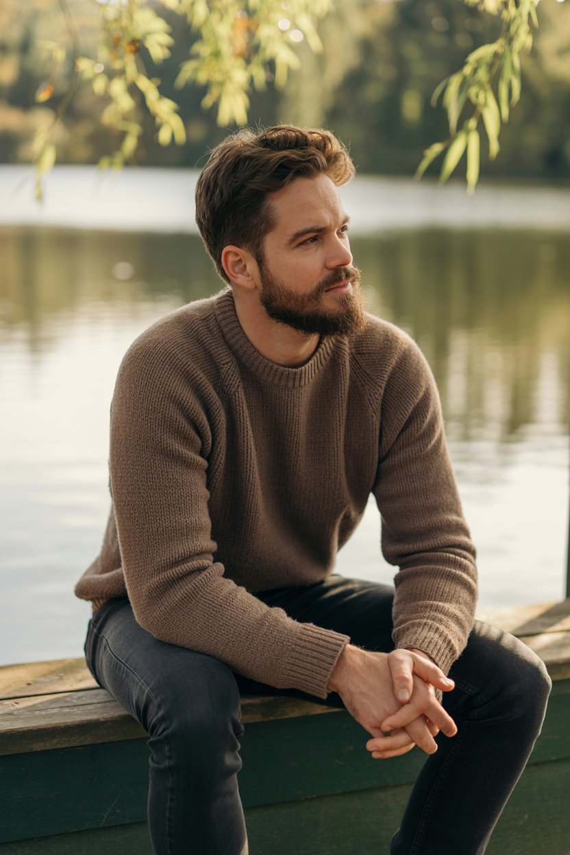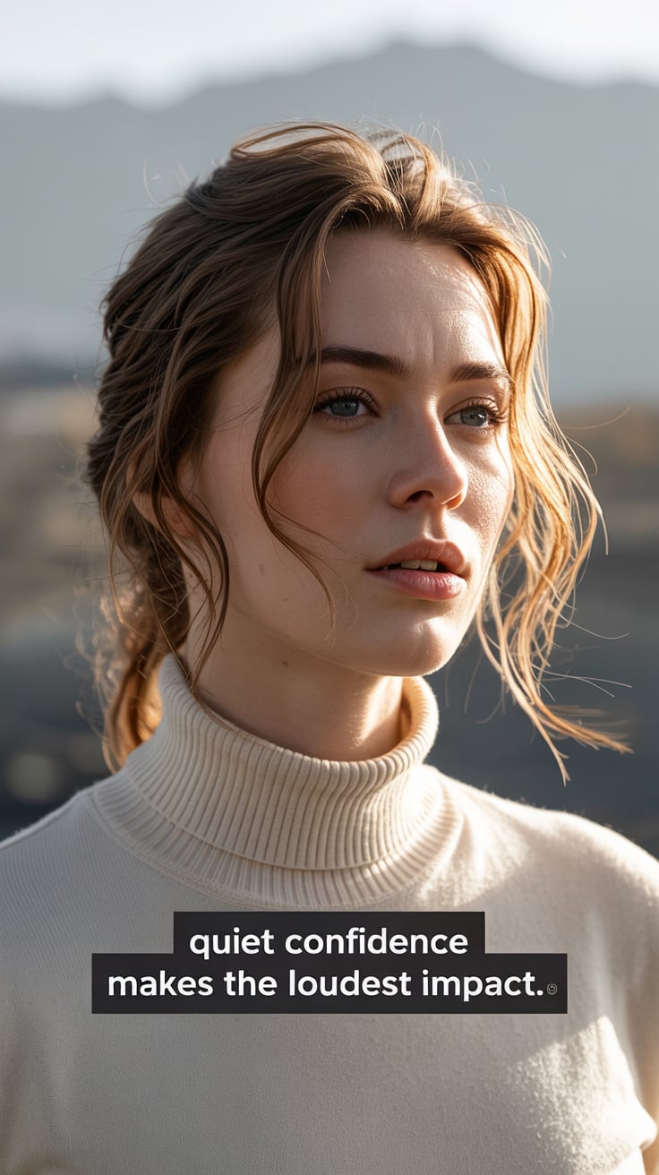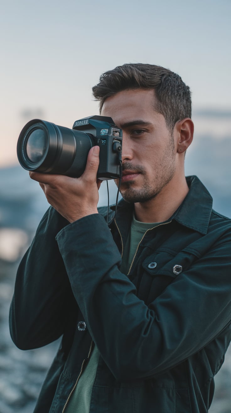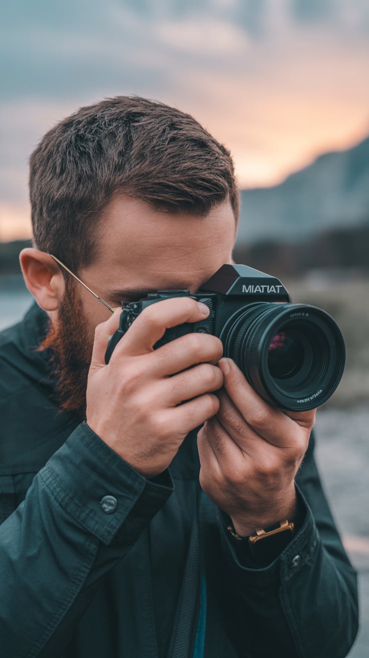 A (mood: contemplative / relaxed / joyful) portrait shot of a (man/woman/person) (pose + location, e...