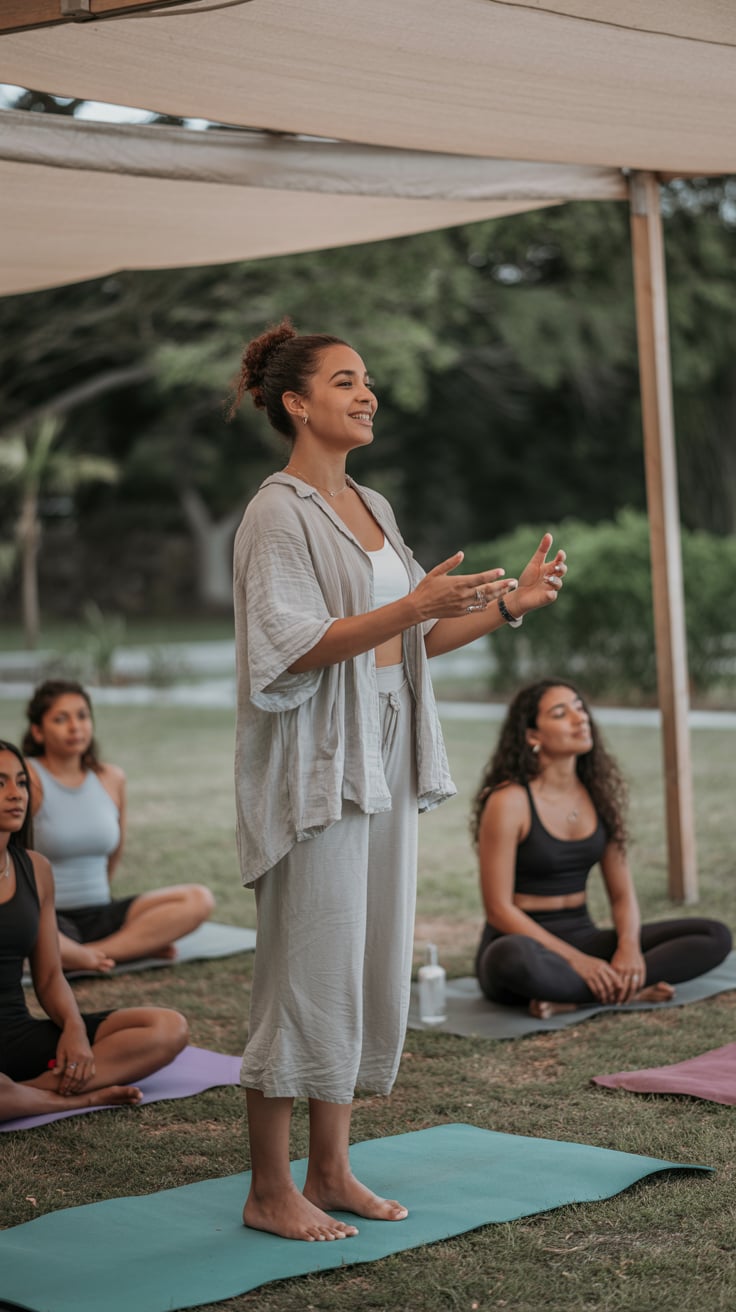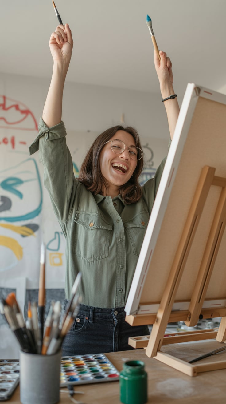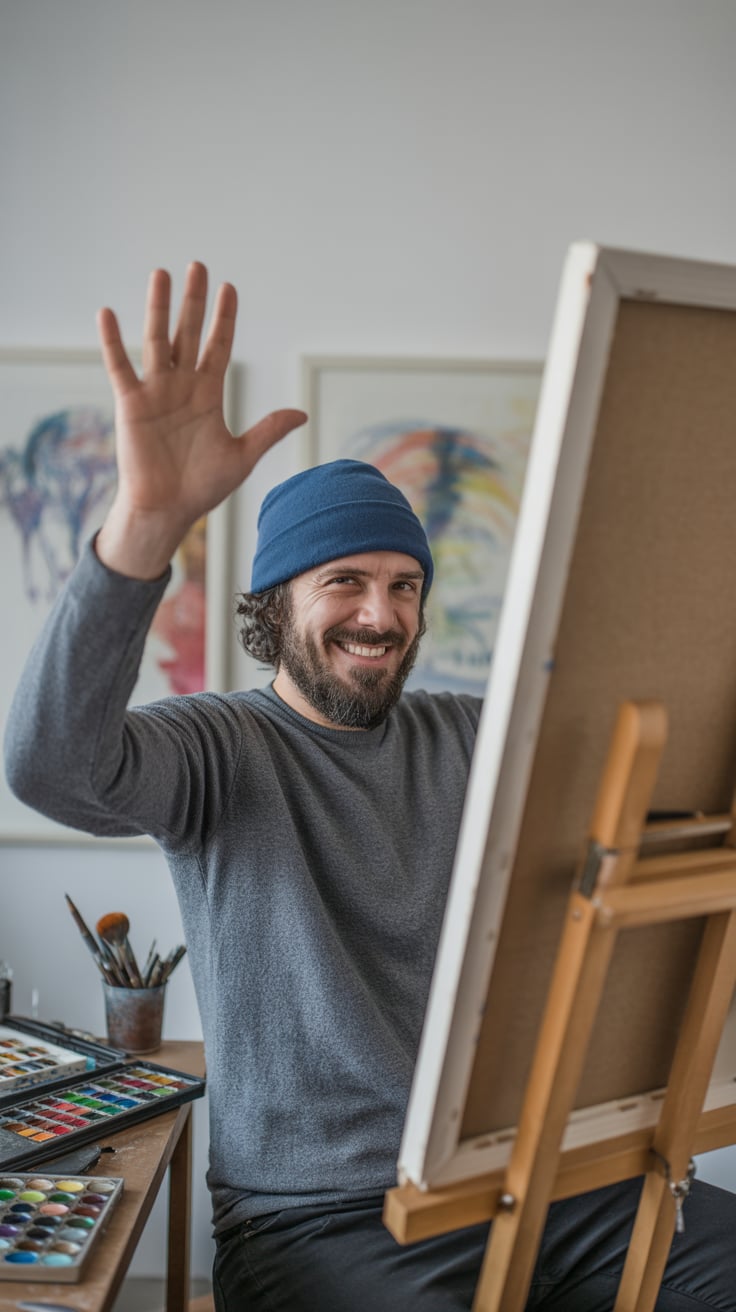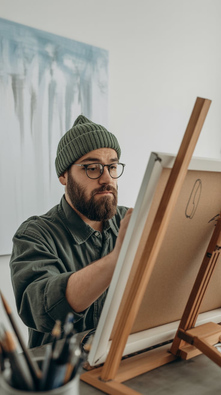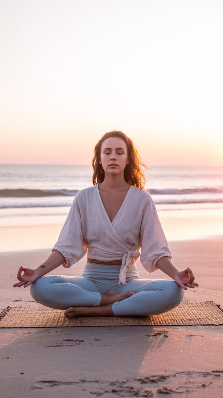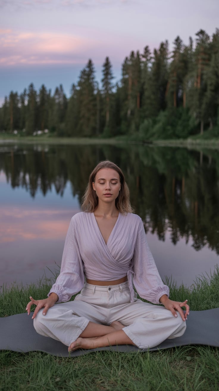 A (mood: contemplative / relaxed / joyful) portrait shot of a (man/woman/person) (pose + location, e...