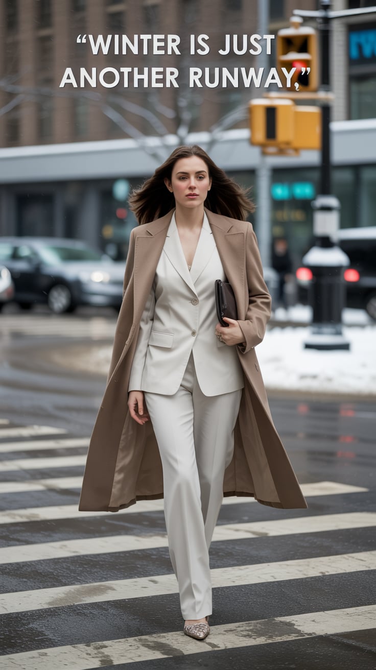 A cinematic shot of a (skin tone) female striding across a snowy crosswalk in a tailored white suit ...