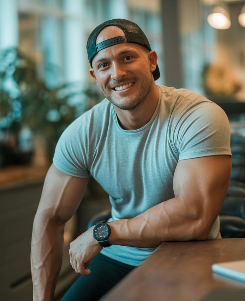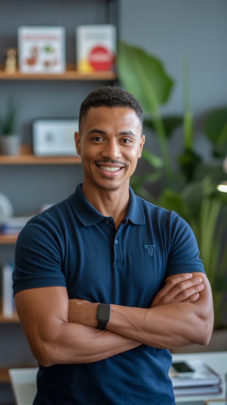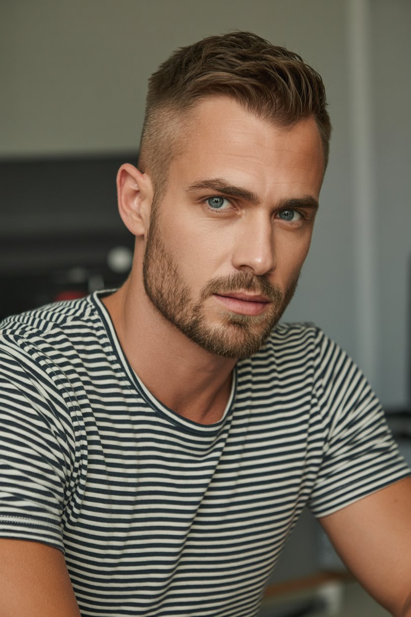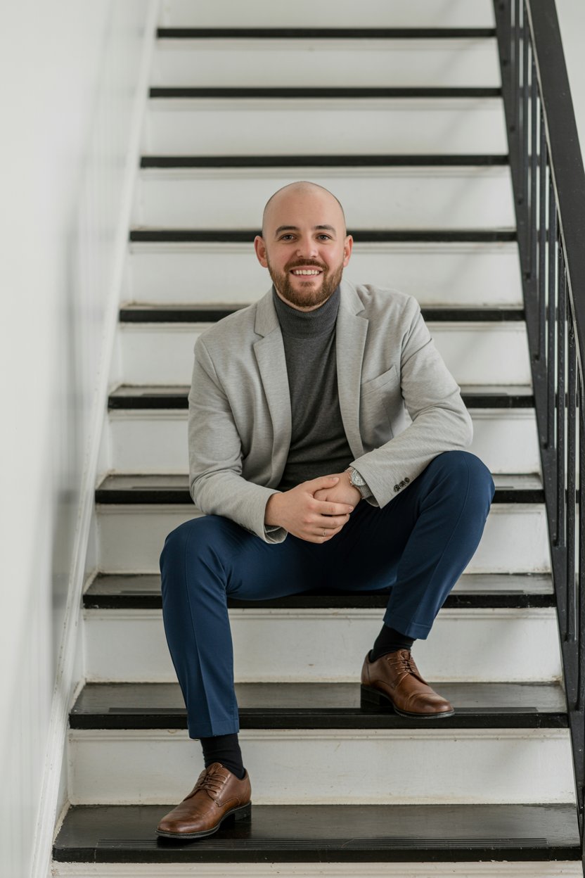 A professional headshot of a (skin tone) (man/person) with (short brown hair, modern fade). Eye colo...