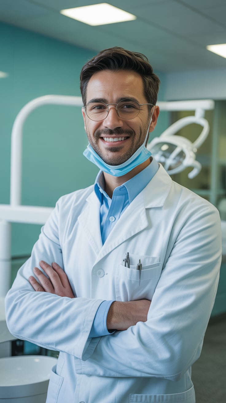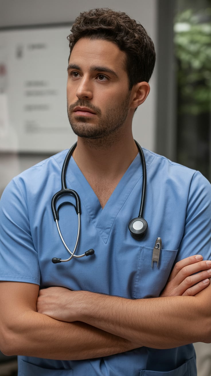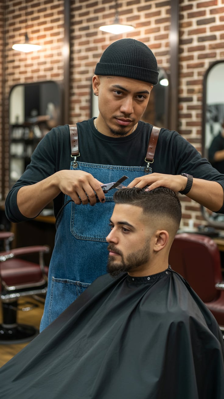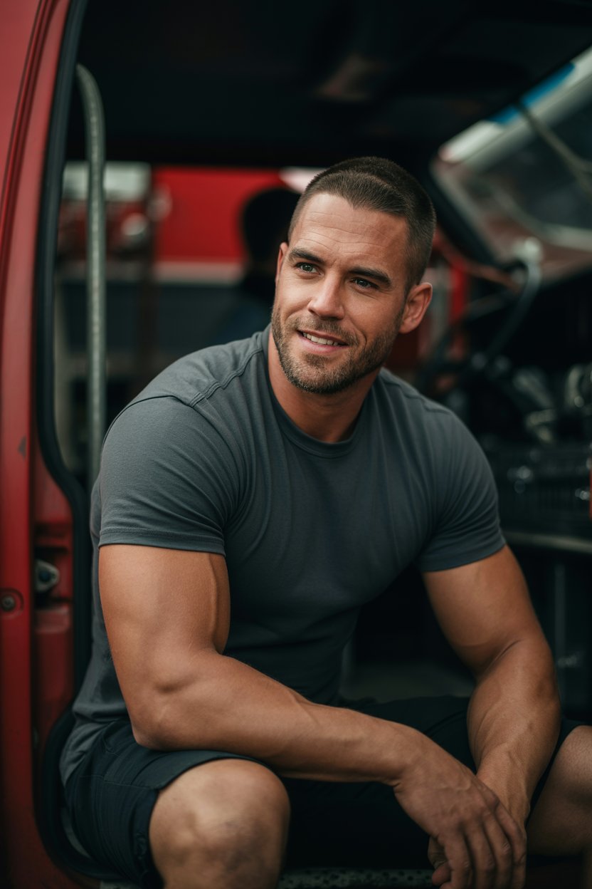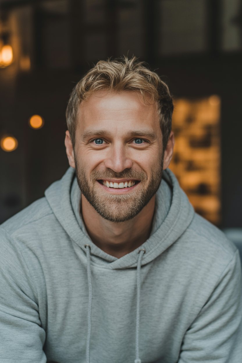 A professional headshot of a (skin tone) (man/person) with (short brown hair, modern fade). Eye colo...