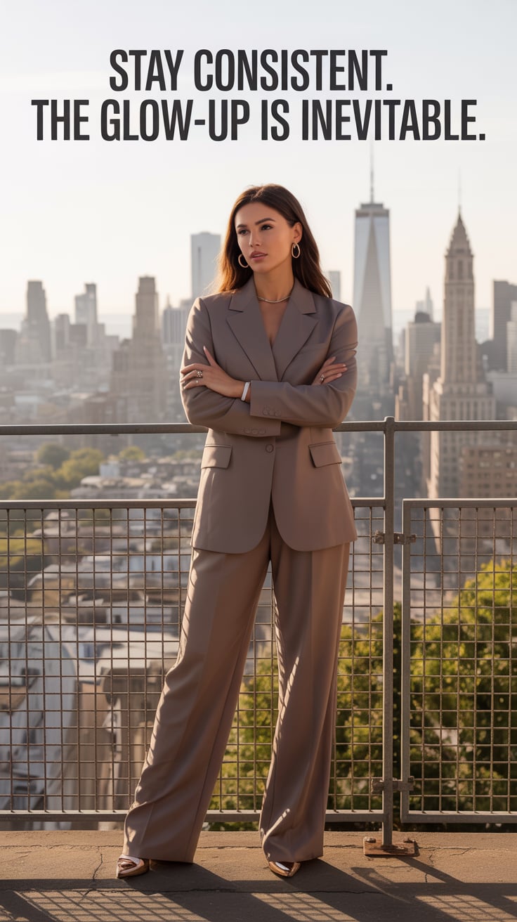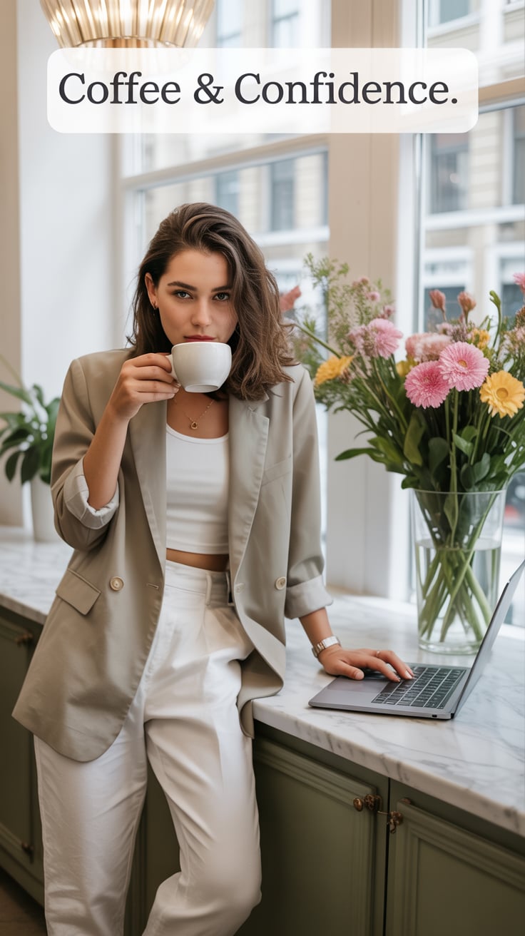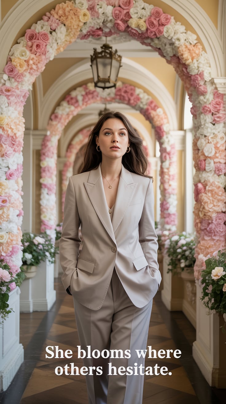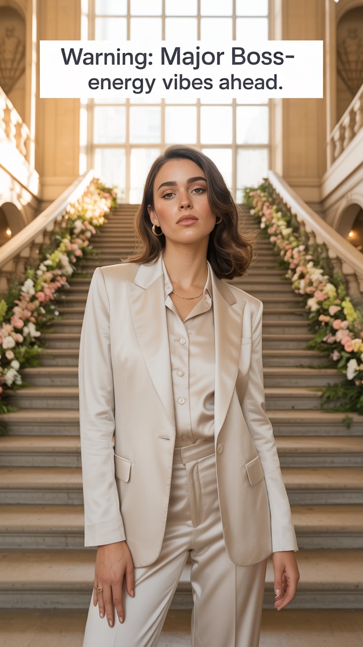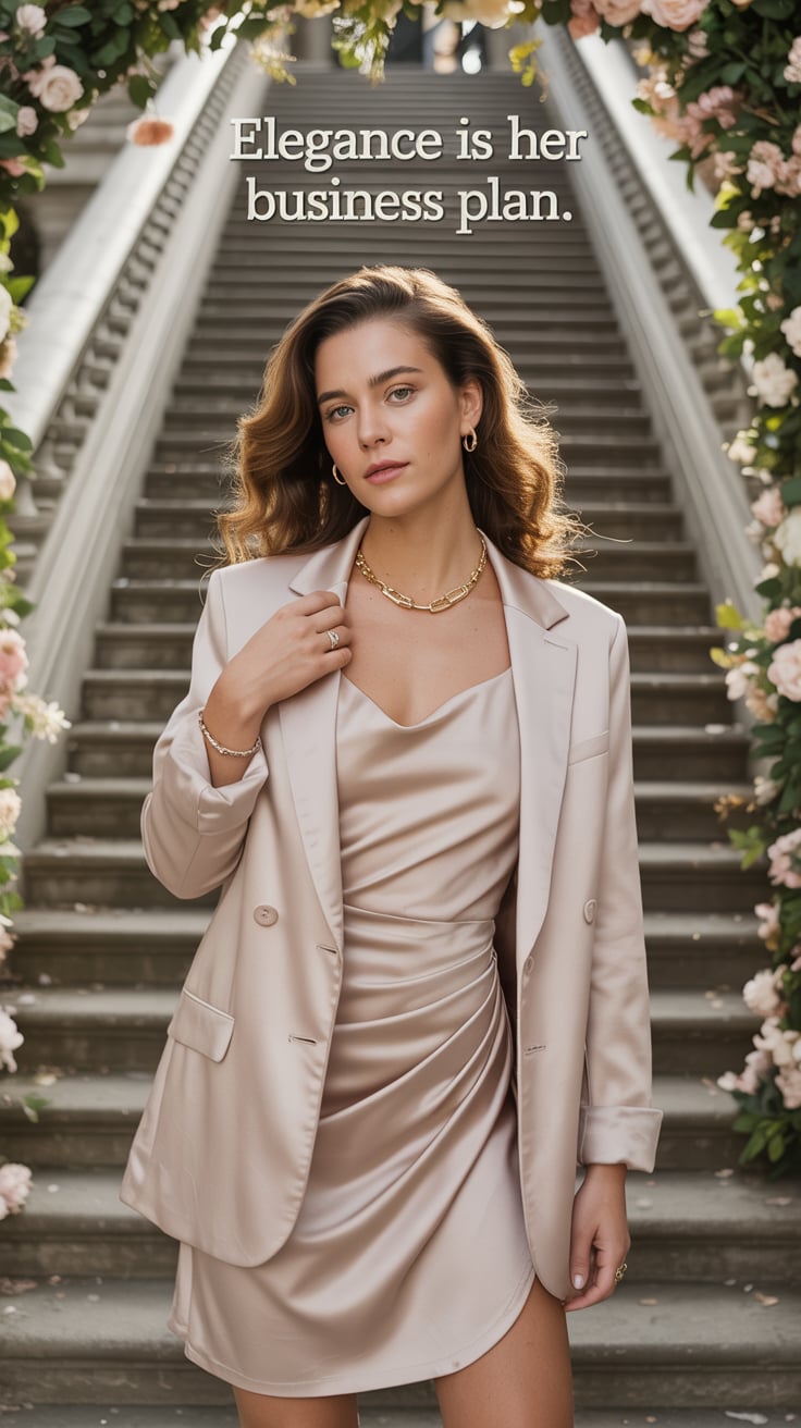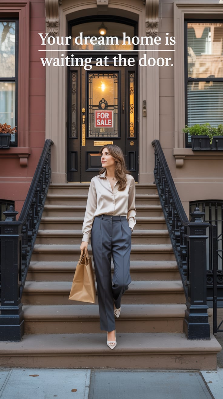 A dreamy wide shot of a (skin tone) female in a tailored cream suit, standing on brownstone steps wi...