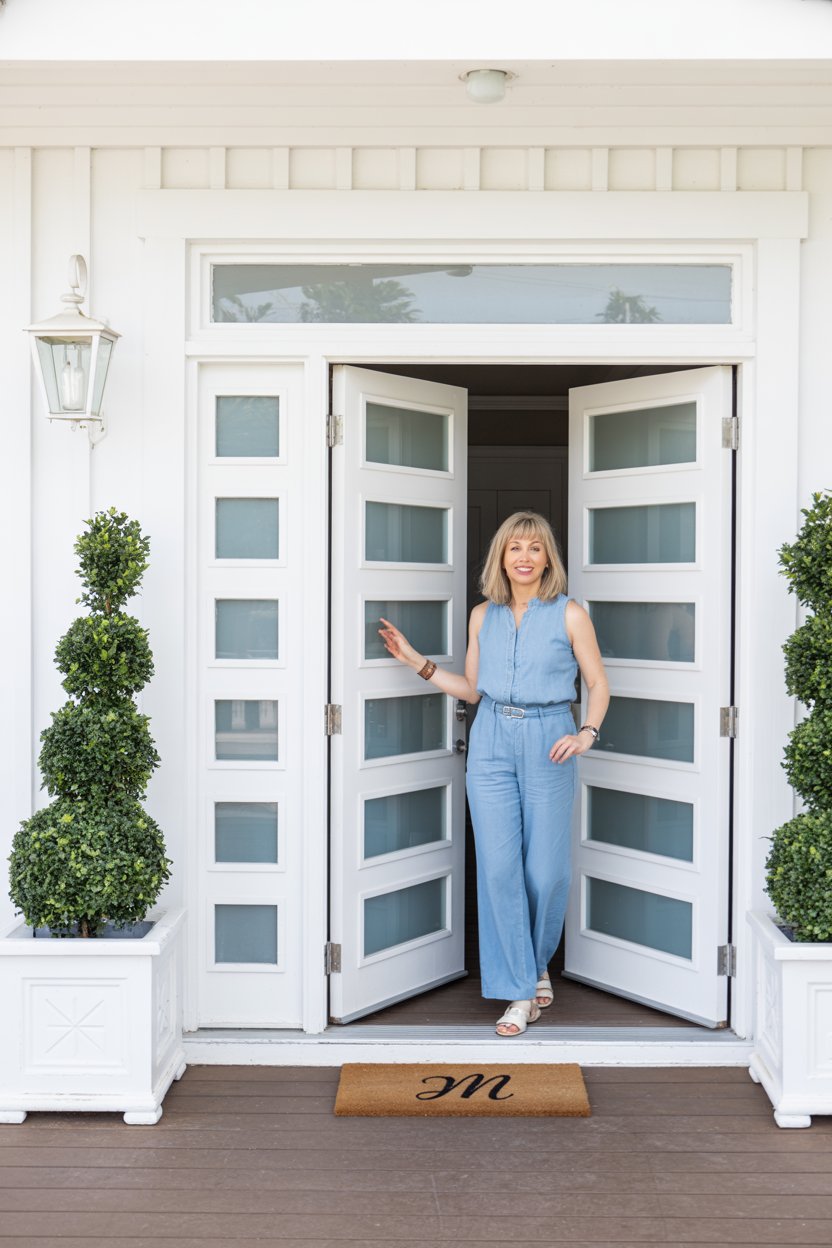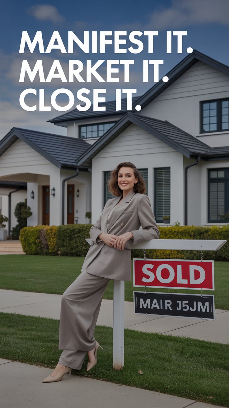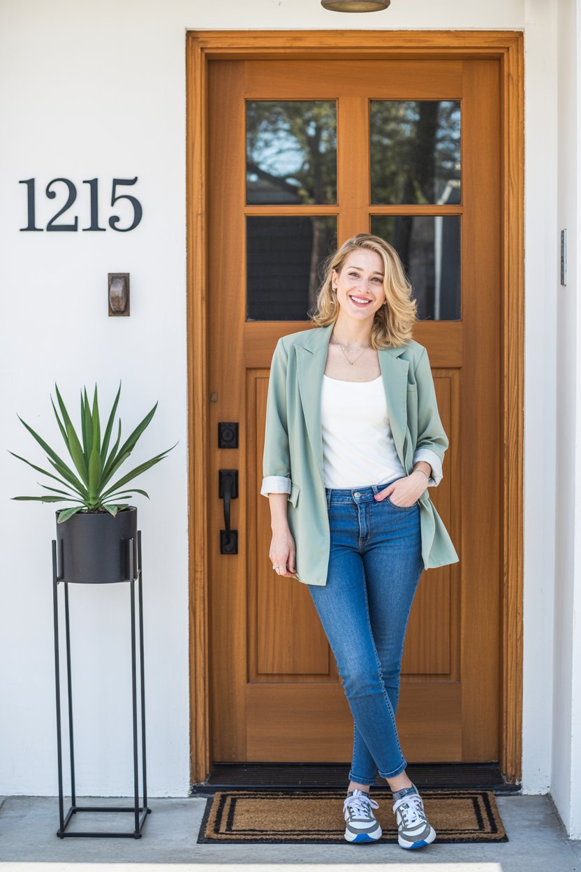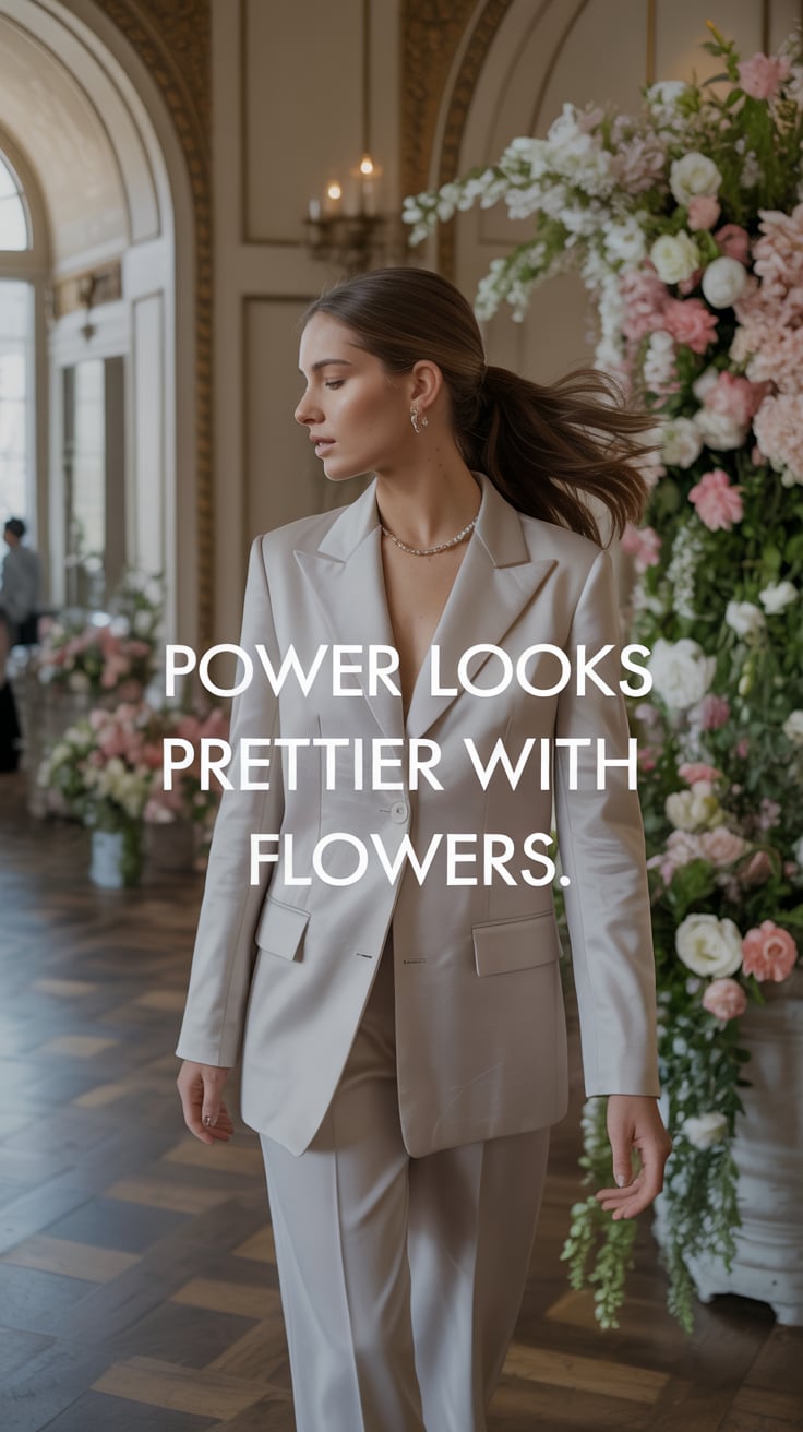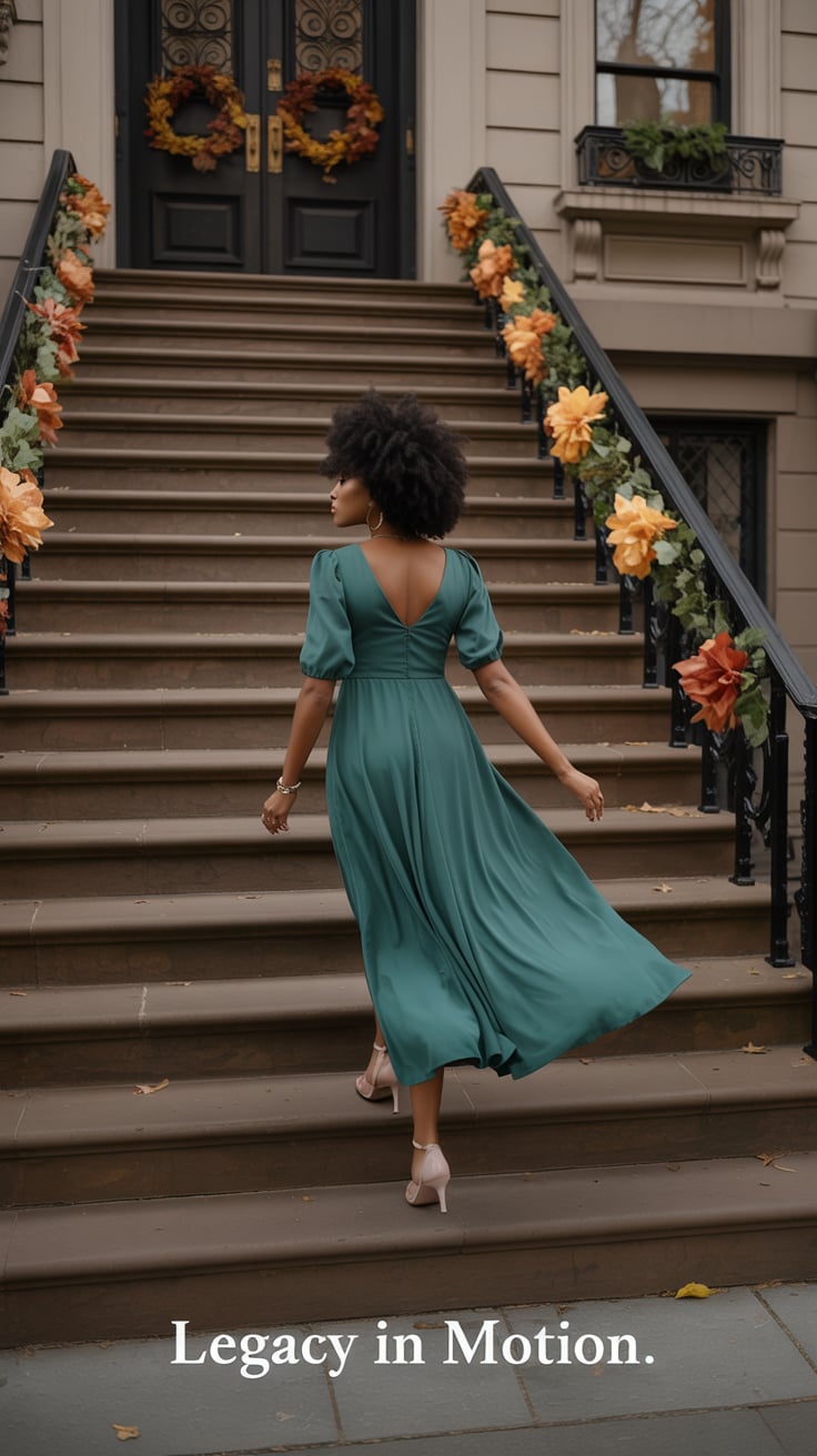 A dreamy wide shot of a (skin tone) female in a tailored cream suit, standing on brownstone steps wi...
