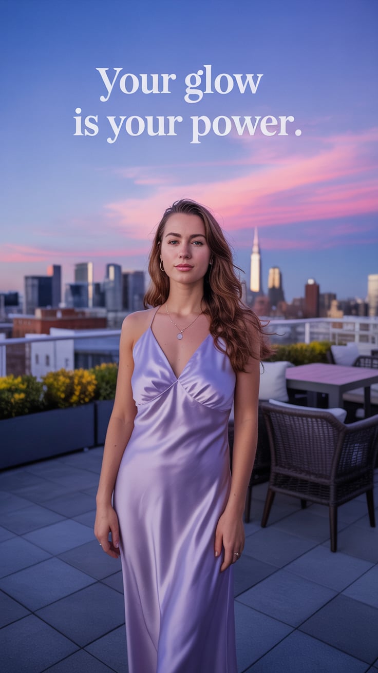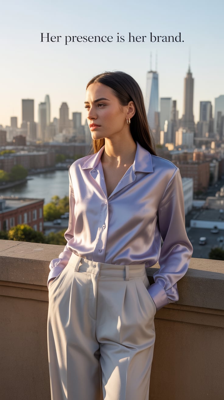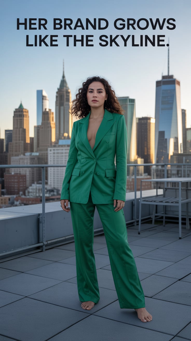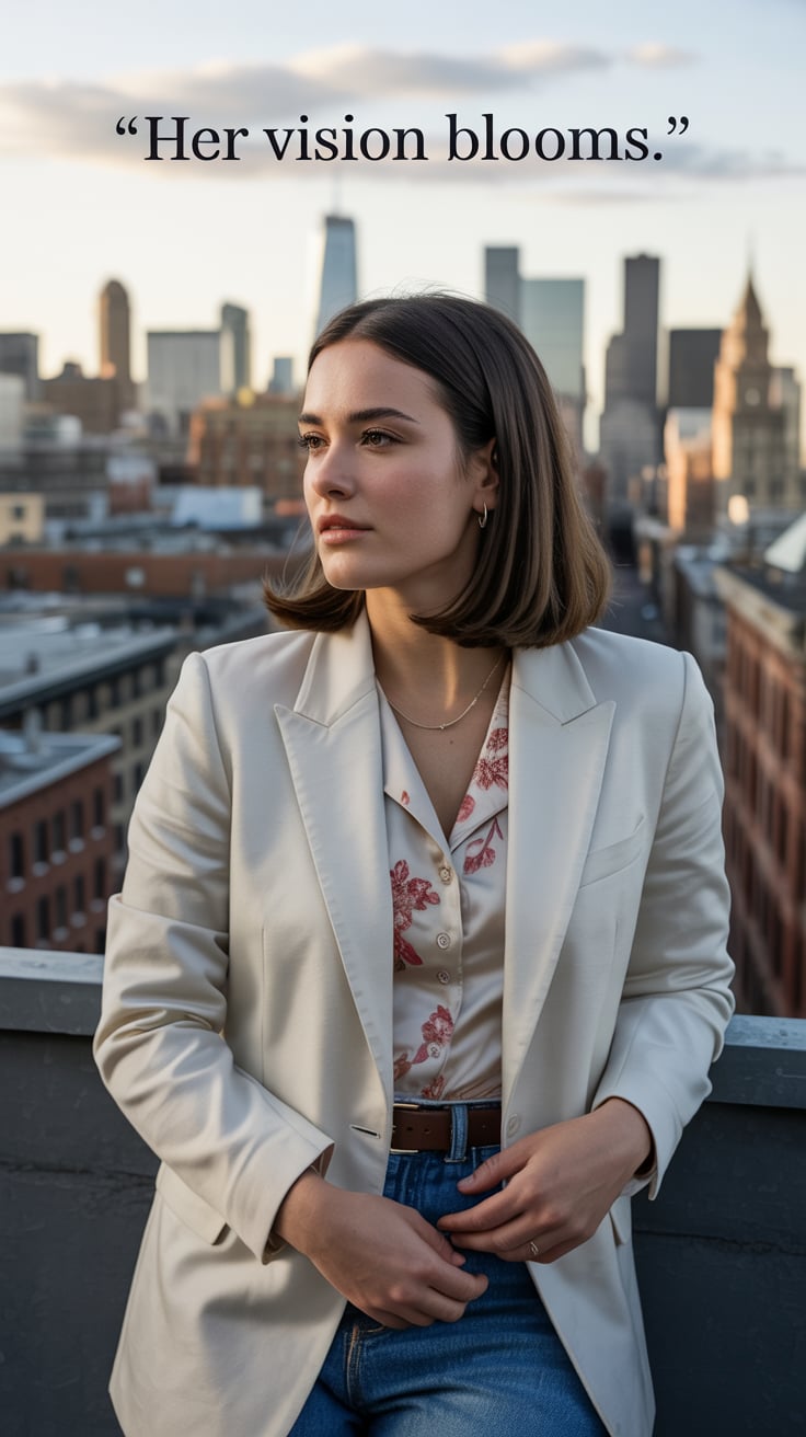 Cinematic rooftop shot of a (skin tone) woman in a cream blazer and floral blouse, city skyline glow...