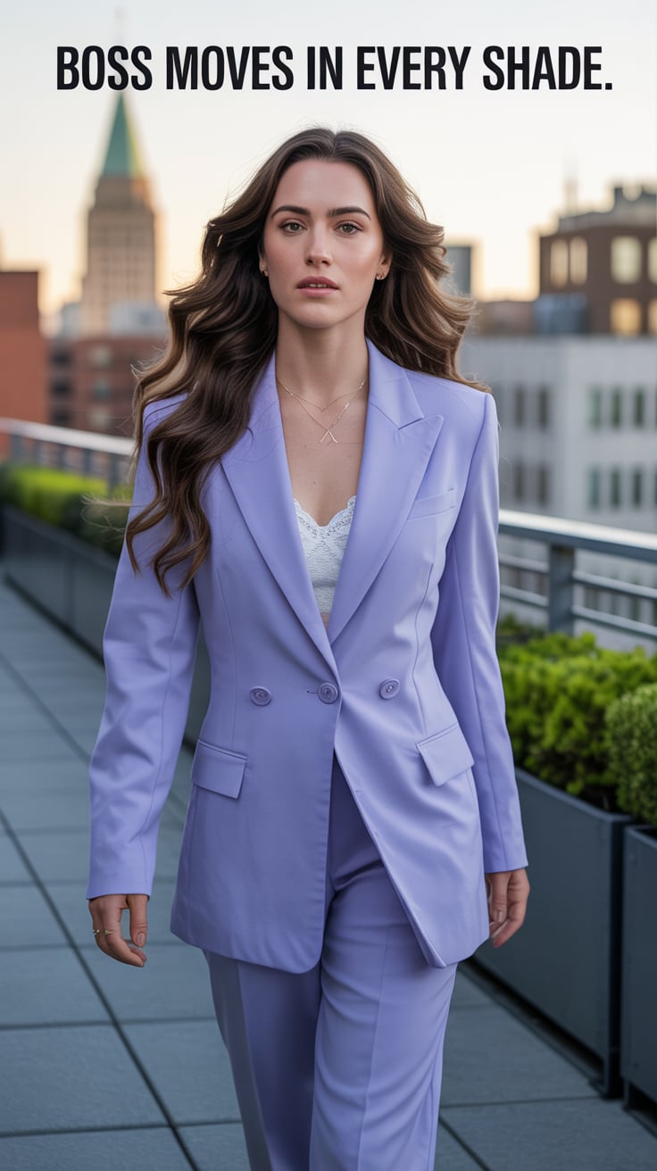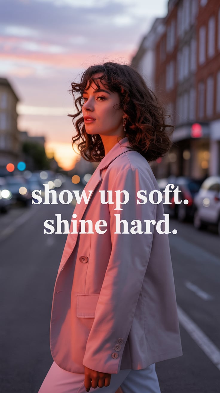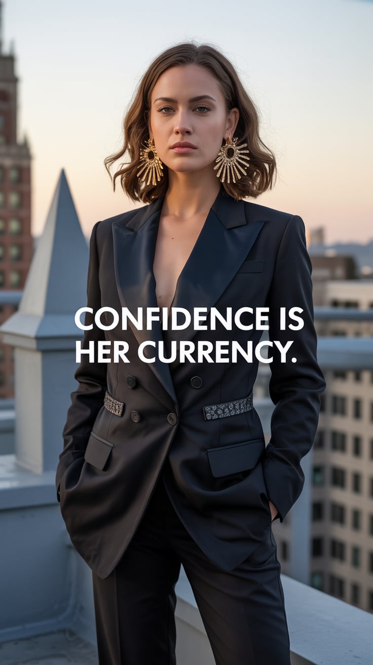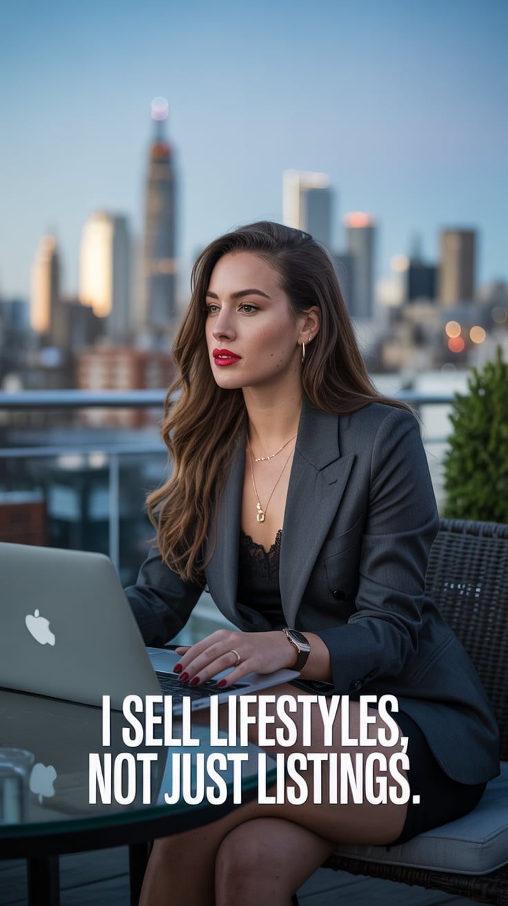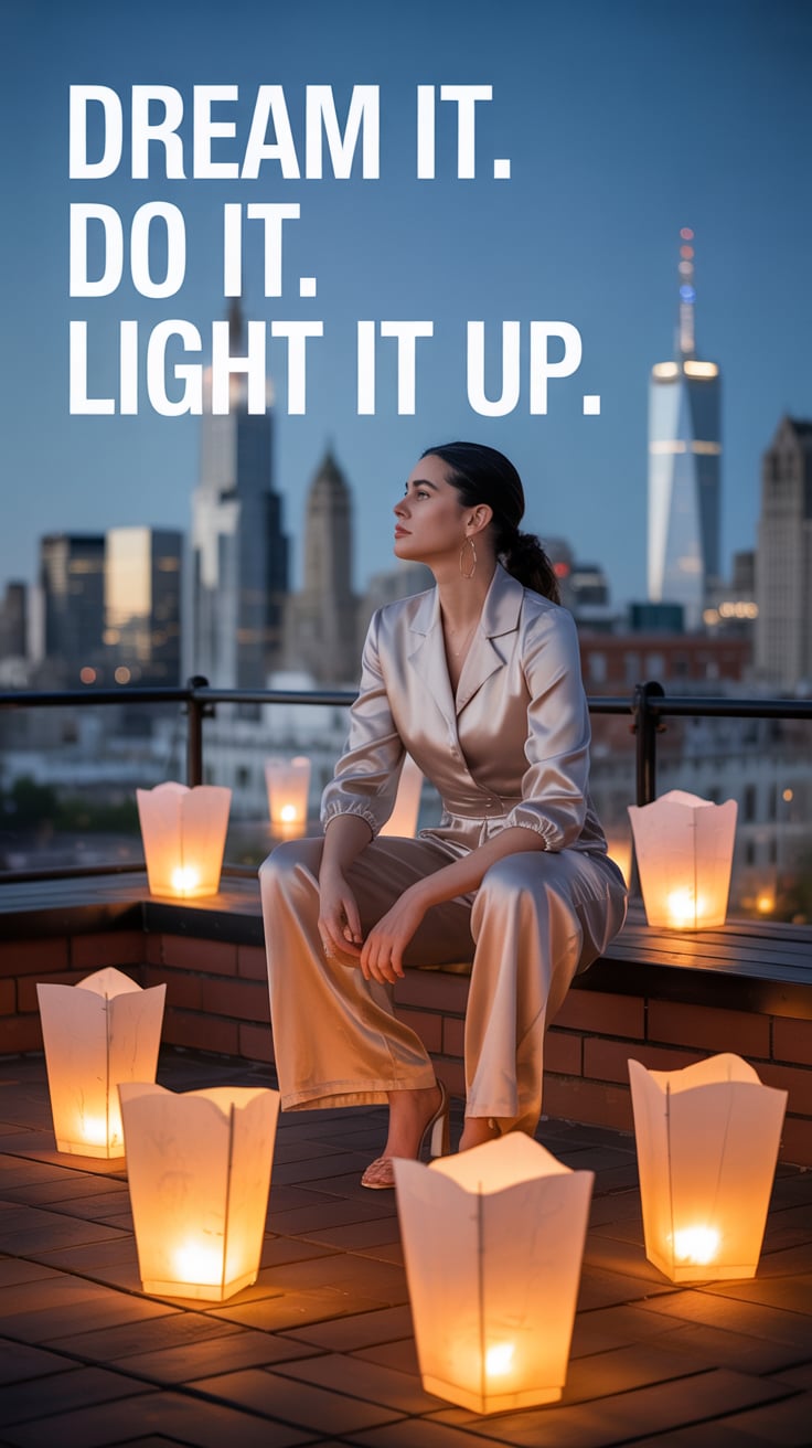 Cinematic rooftop shot of a (skin tone) woman in a cream blazer and floral blouse, city skyline glow...