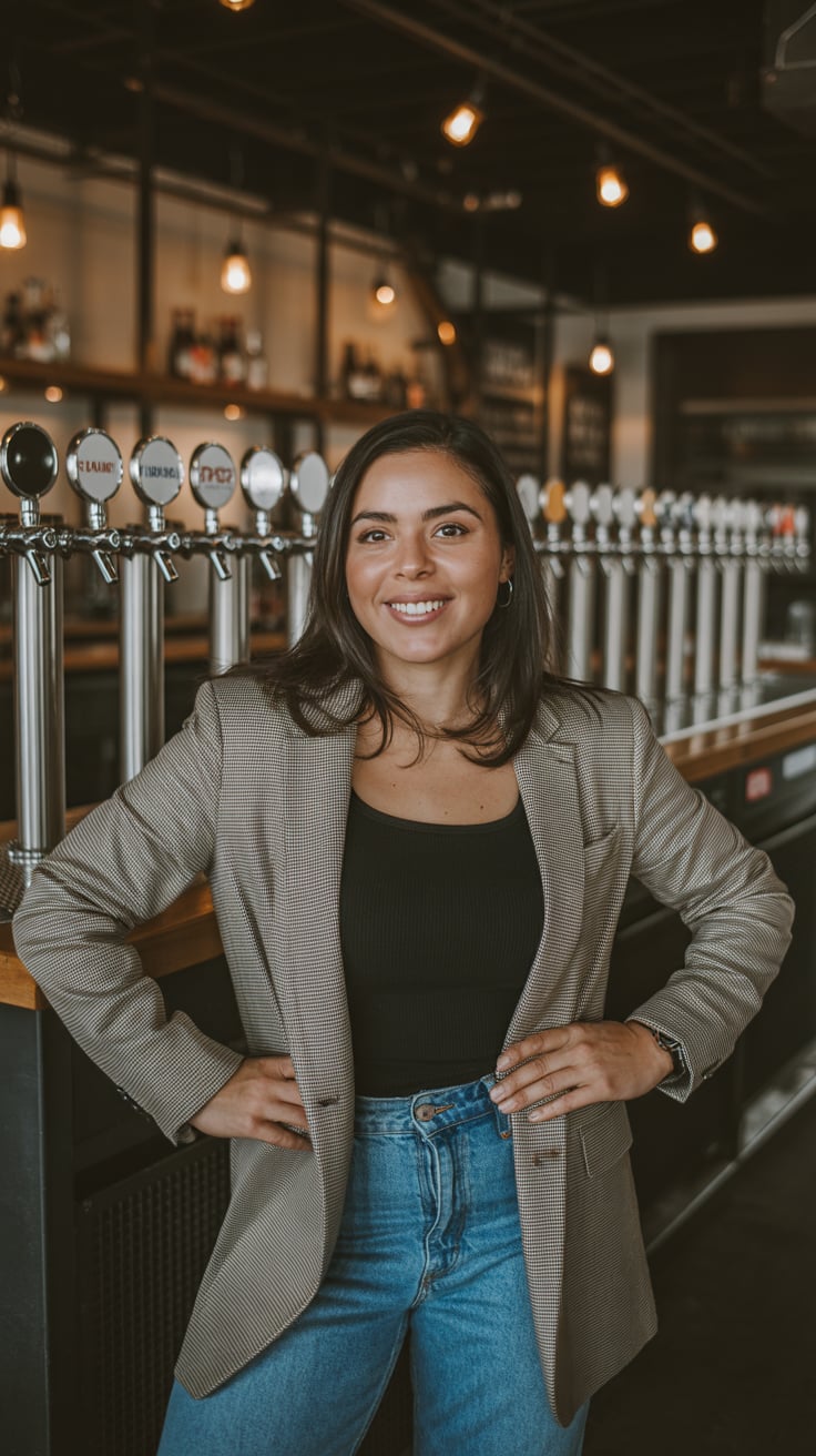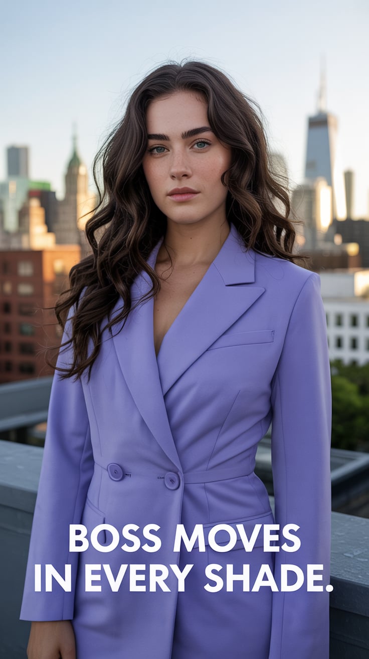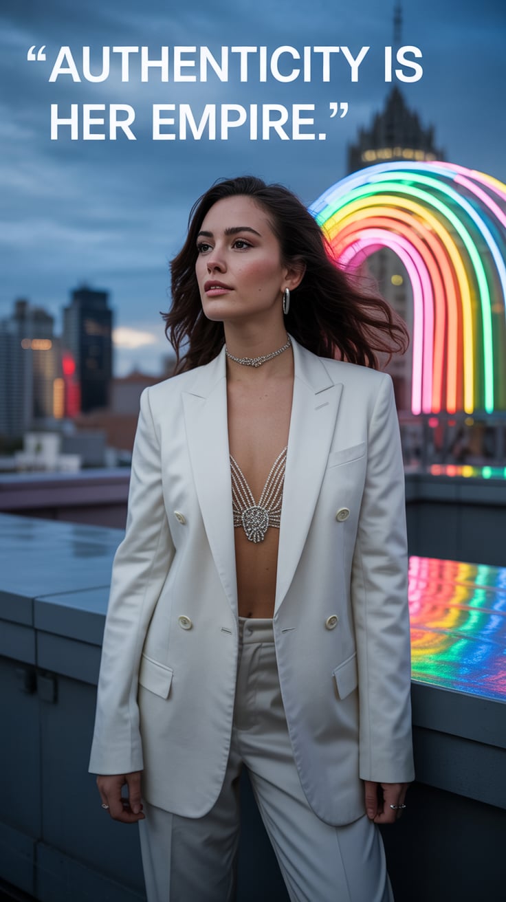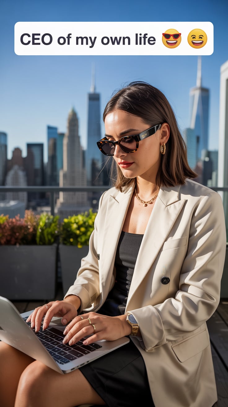 Cinematic rooftop shot of a (skin tone) woman in a cream blazer and floral blouse, city skyline glow...