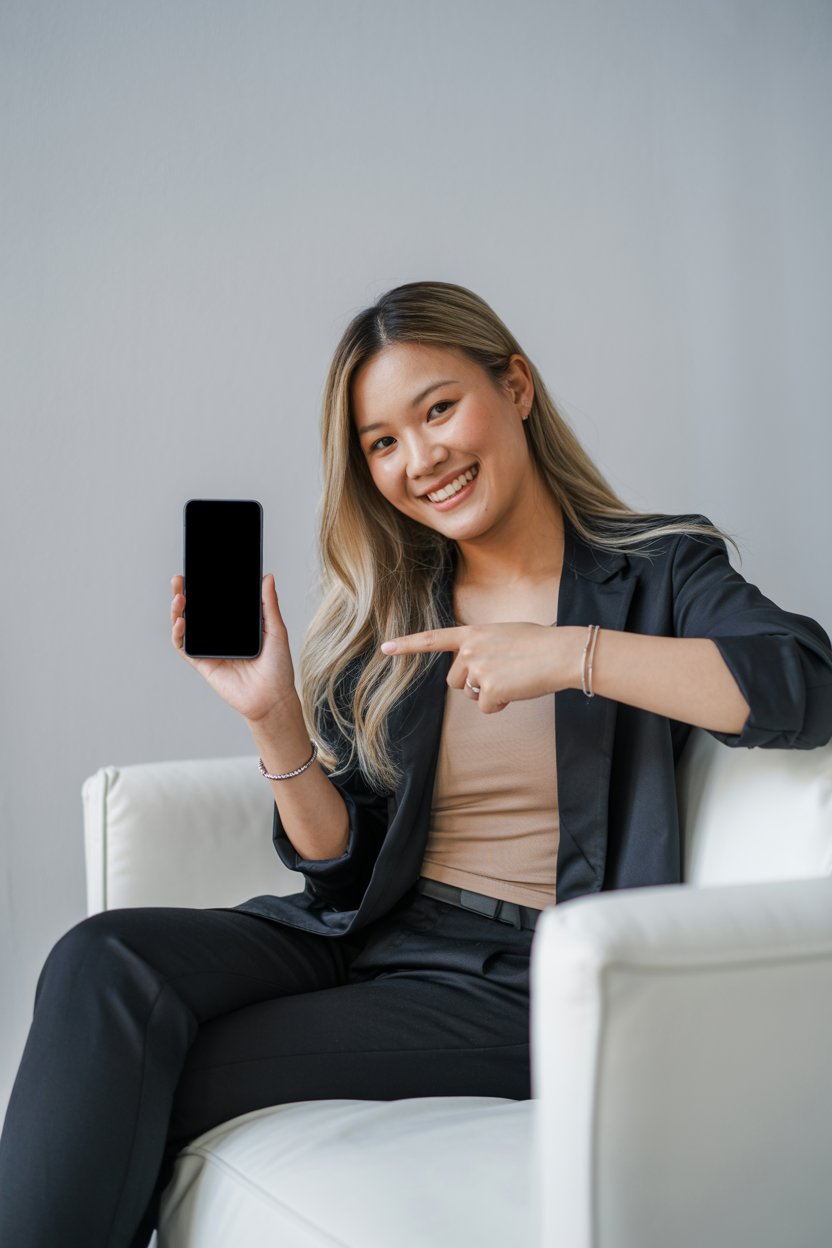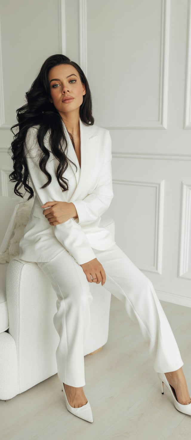 A professional lifestyle studio portrait of a (skin color) (gender/subject) sitting in a modern whit...