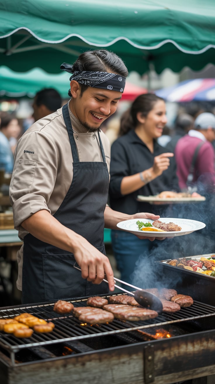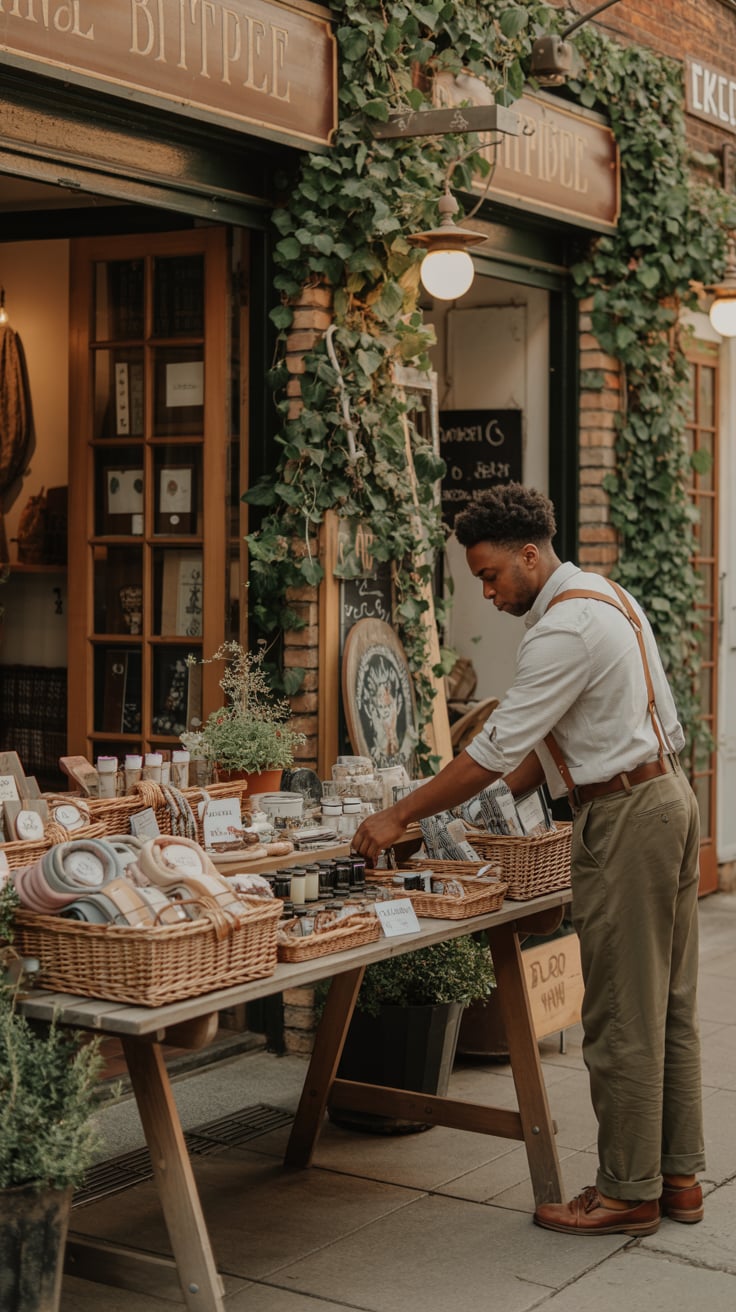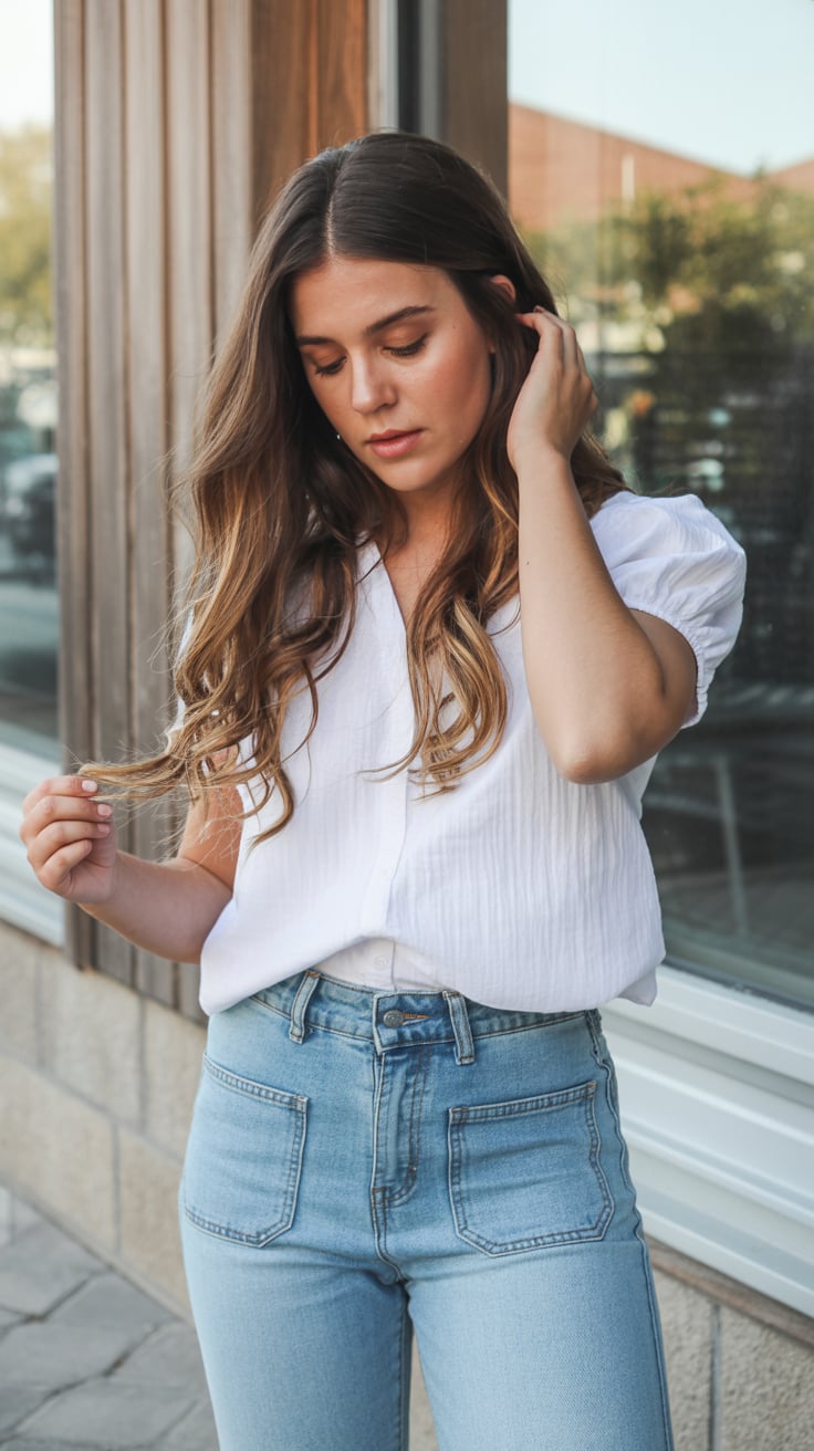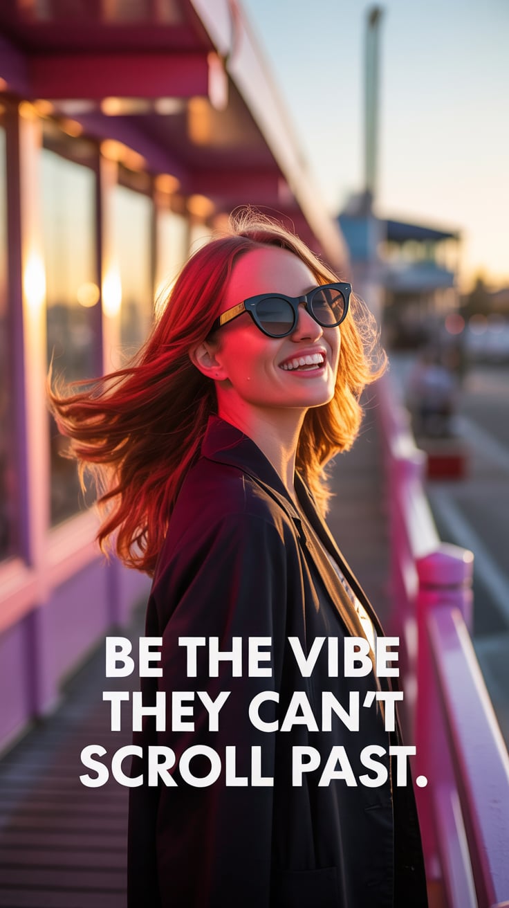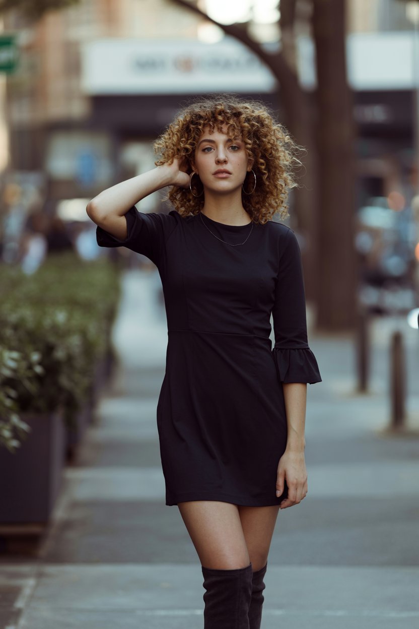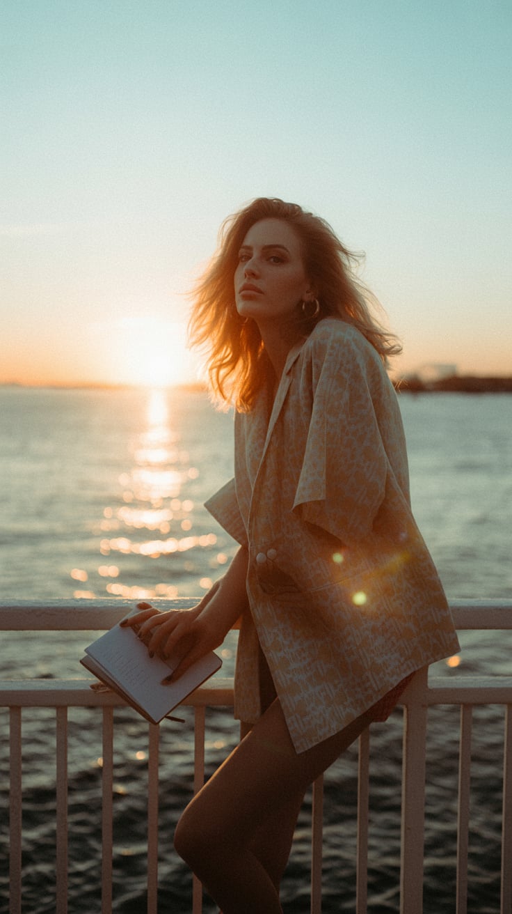Lifestyle street photo at golden hour. A (skin color) (age range) (gender/subject) with a (body shap...